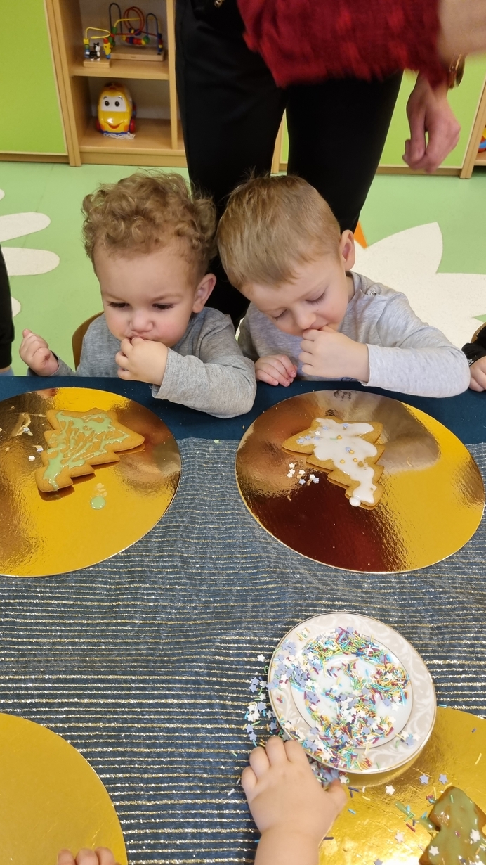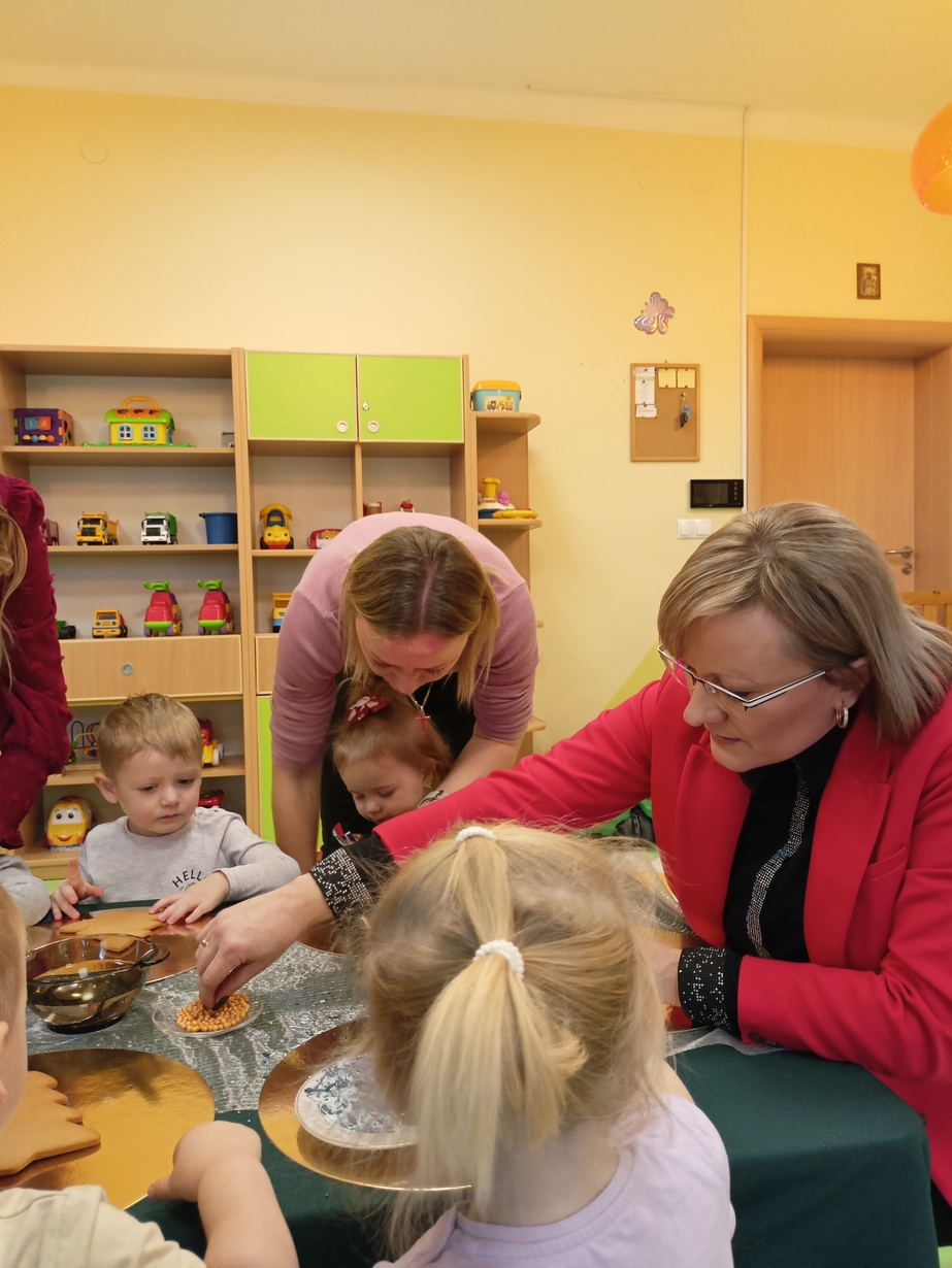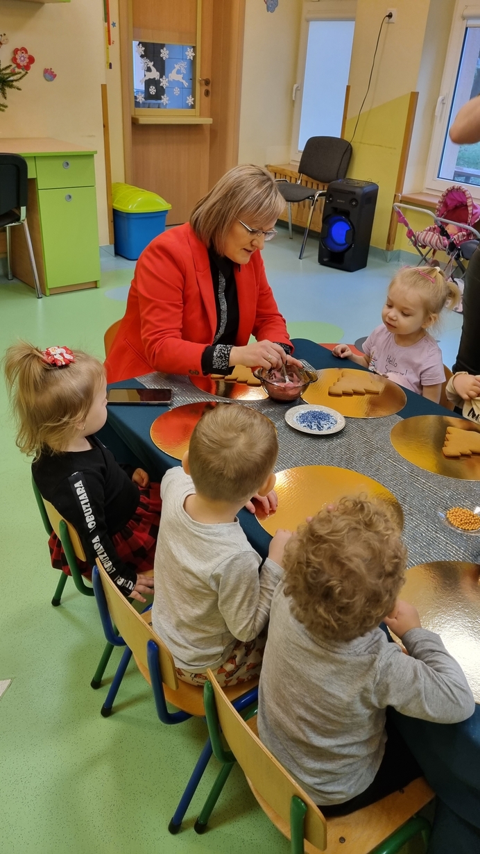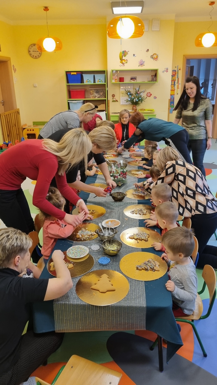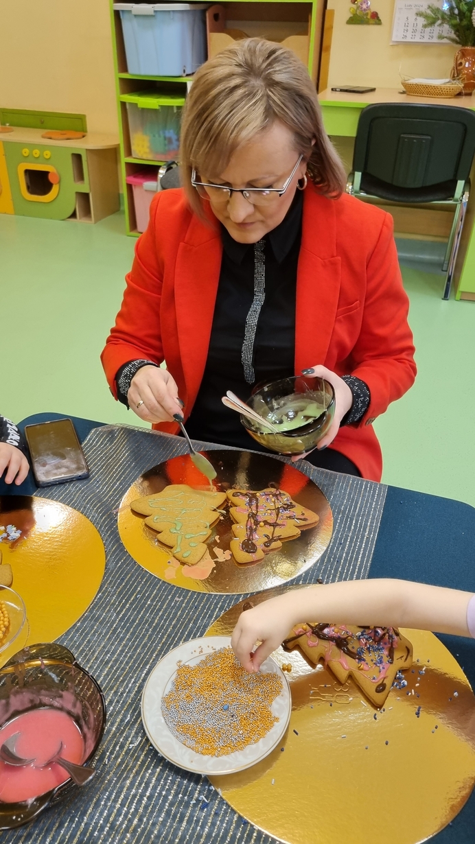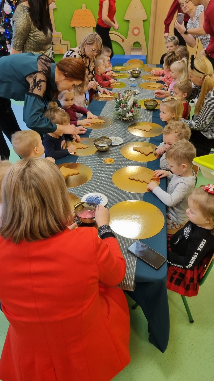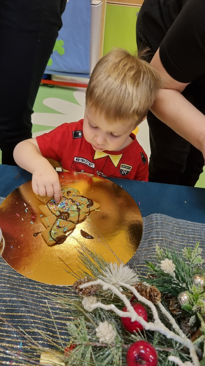 Dzieci z grupy Muchomorów i grupy Pszczółek wraz z Panią Dyrektor oraz ciociami ozdabiały świąteczne pierniczki.