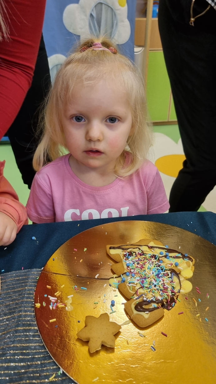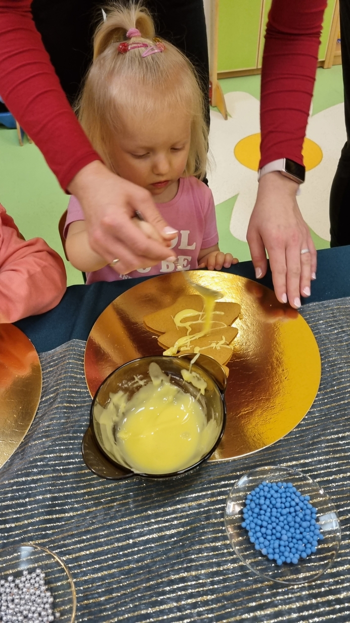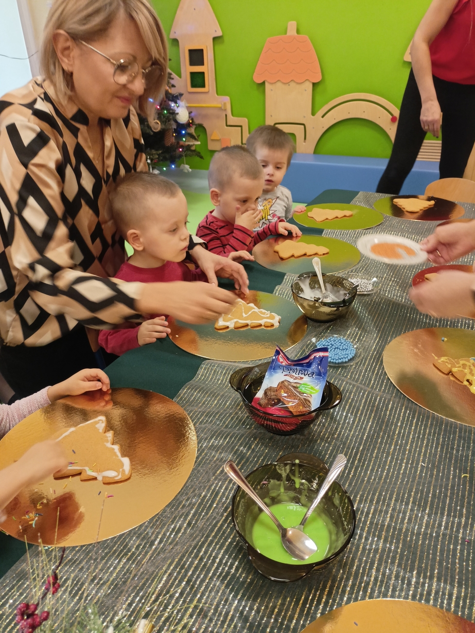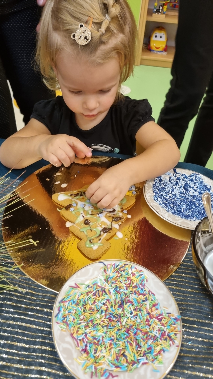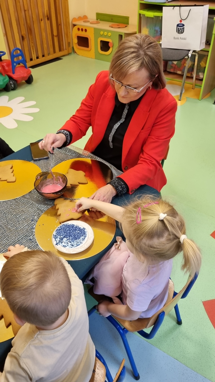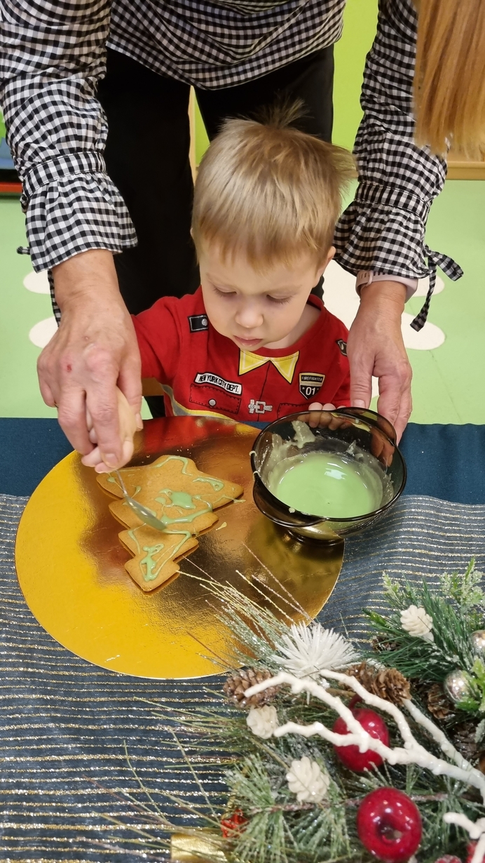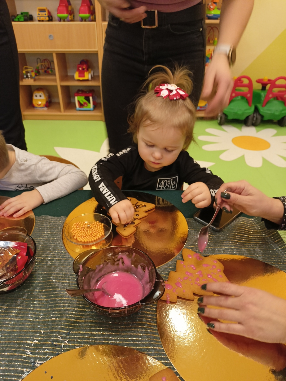 Dzieci z grupy Muchomorów i grupy Pszczółek wraz z Panią Dyrektor oraz ciociami ozdabiały świąteczne pierniczki.
