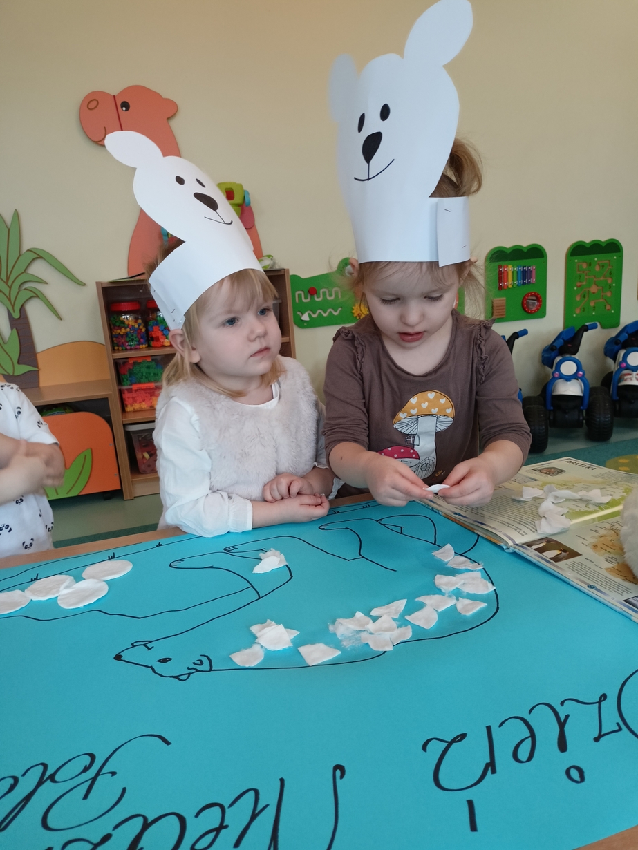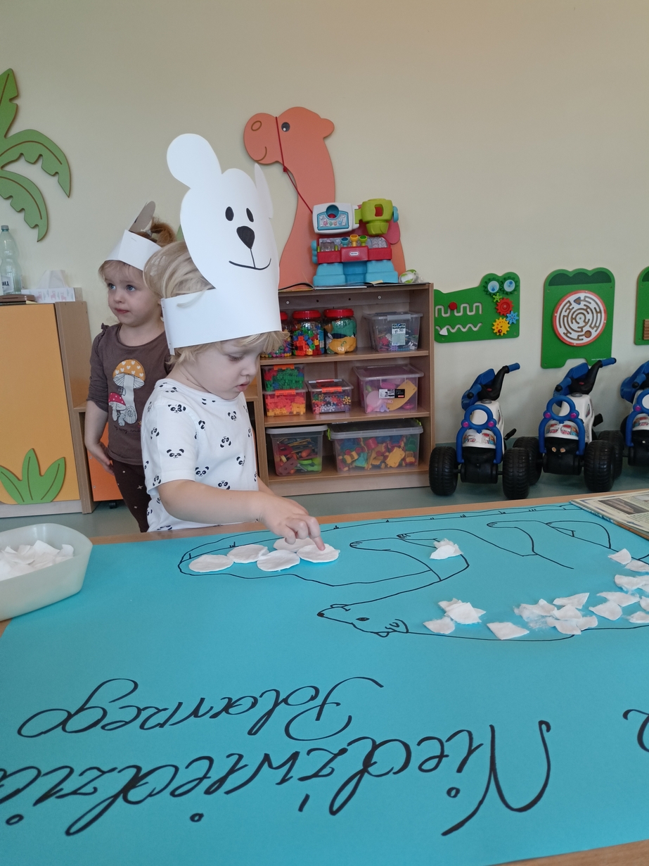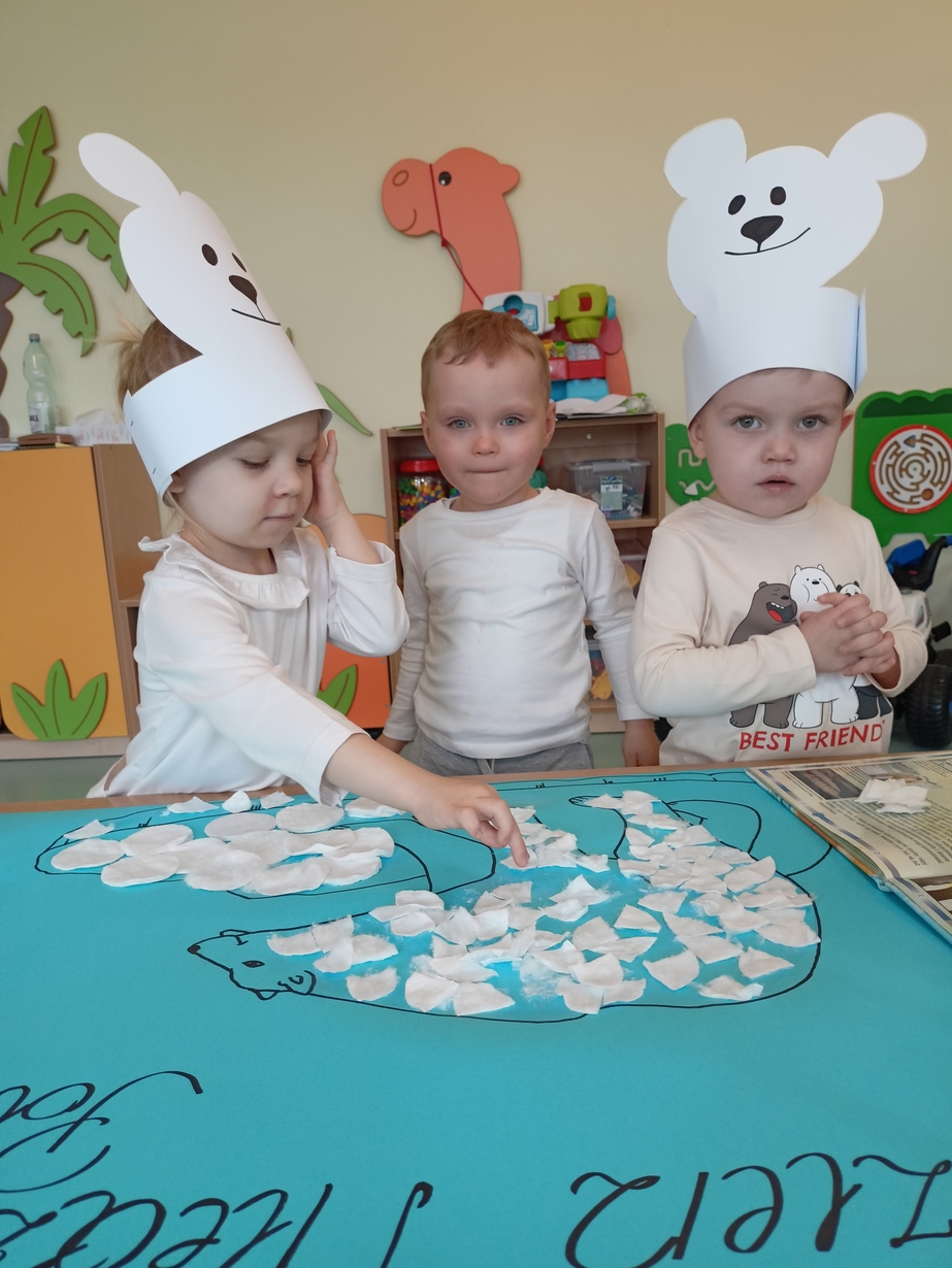 praca zespołowa, aktywność ruchowa i twórcza. Dzieci z grupy "Pszczółki" podczas zajęć wyklejały niedźwiedzia polsrnego.