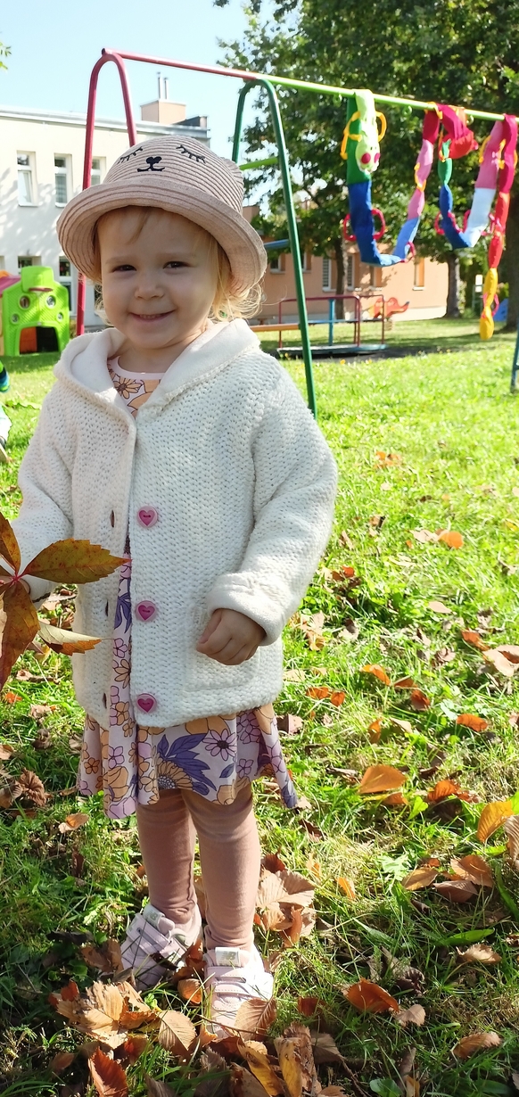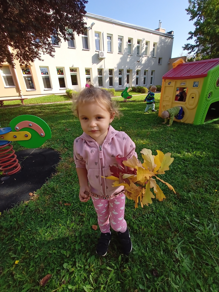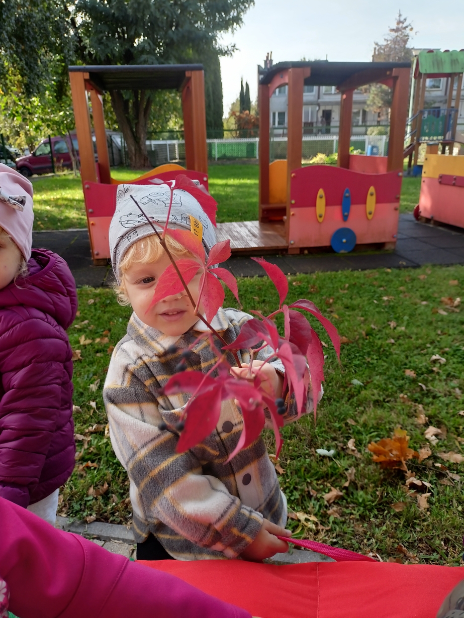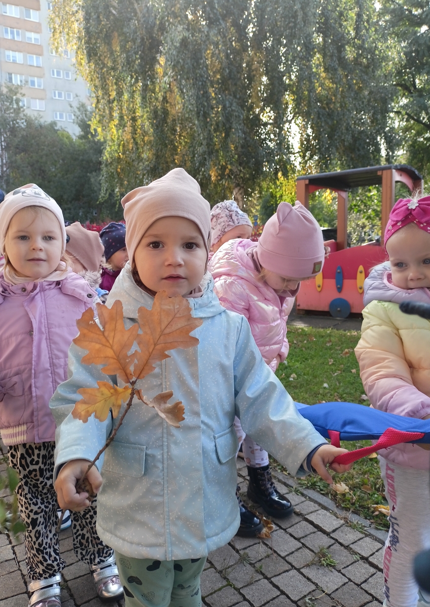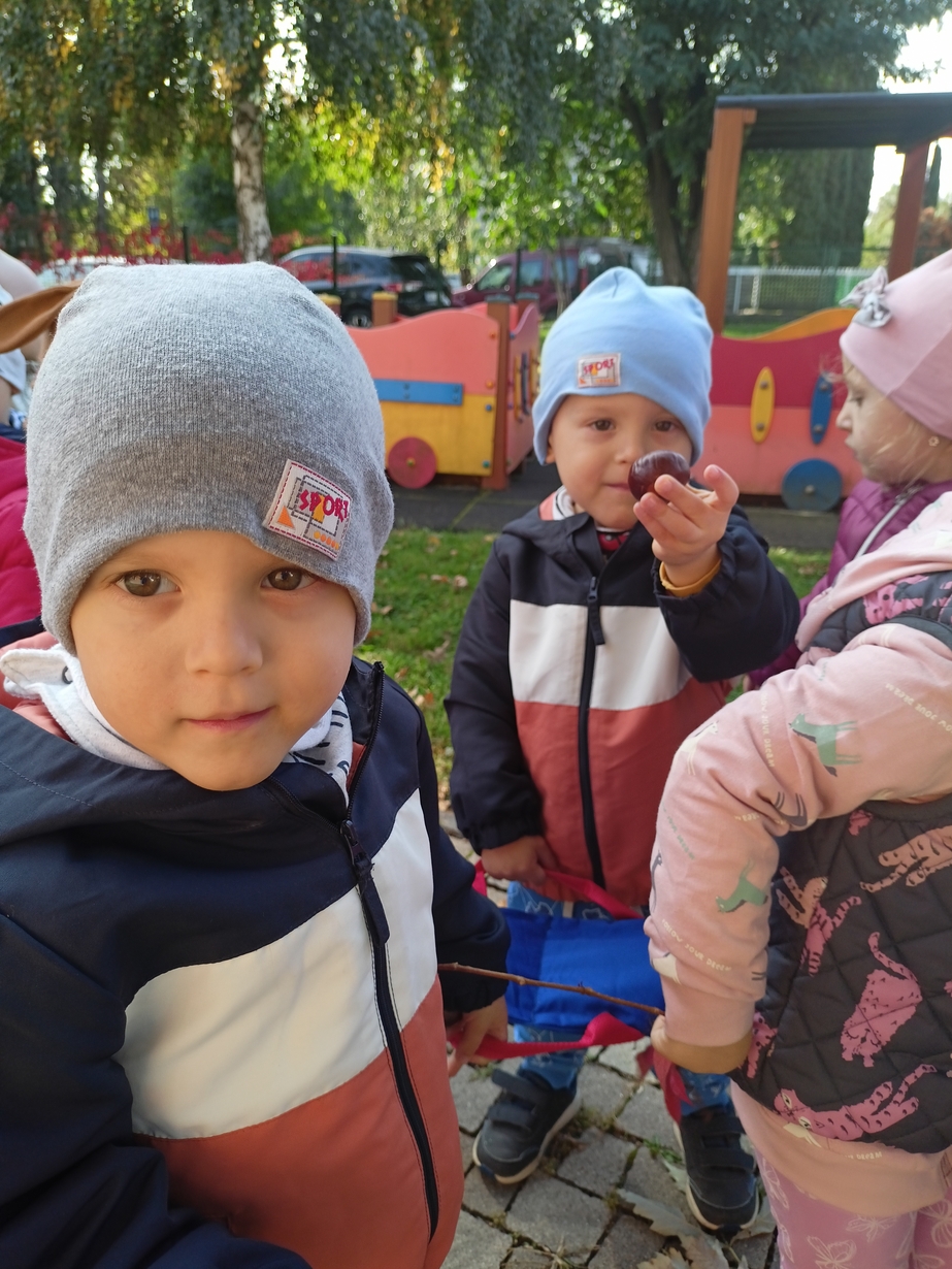 Dzieci z grupy"Pszczółki" wybrały się że śpiewem na spacer w poszukiwaniu oznak jesieni. Piękna pogoda jak i humor dopisywały dzieciom.