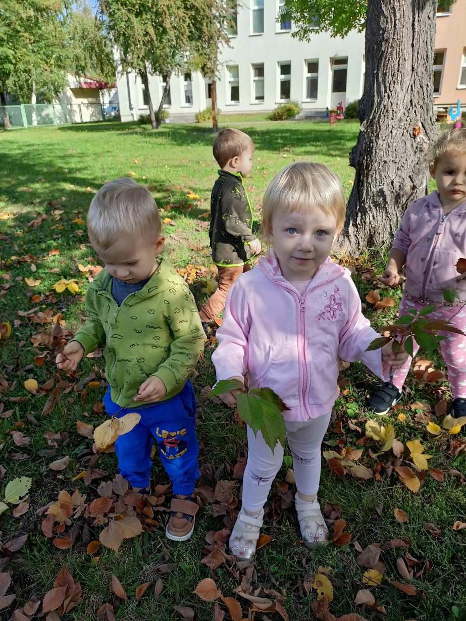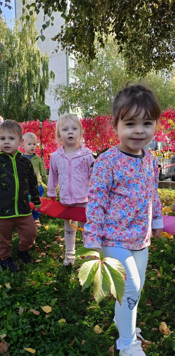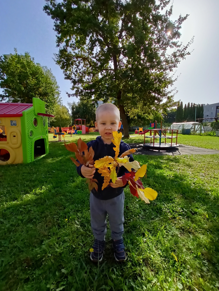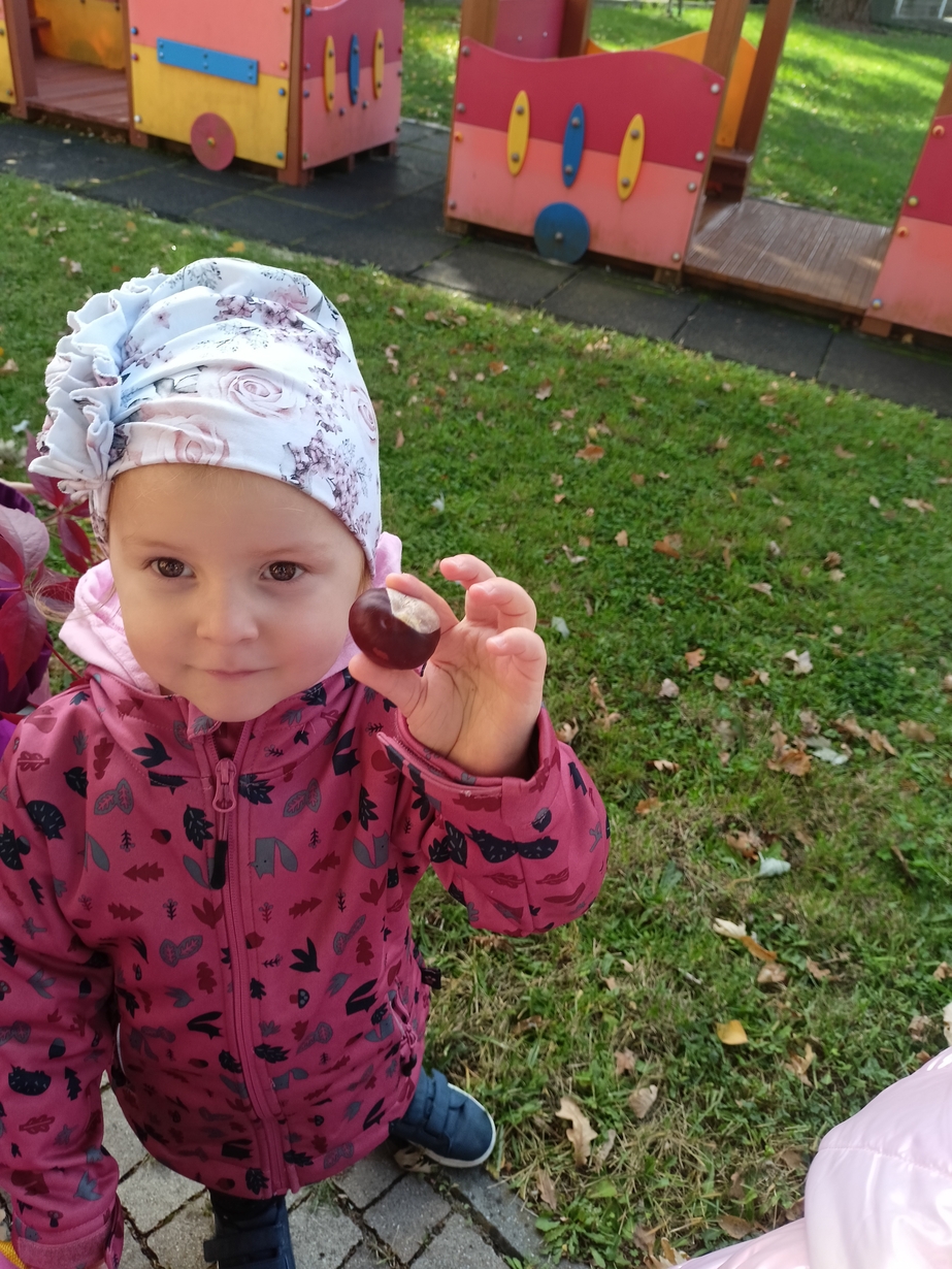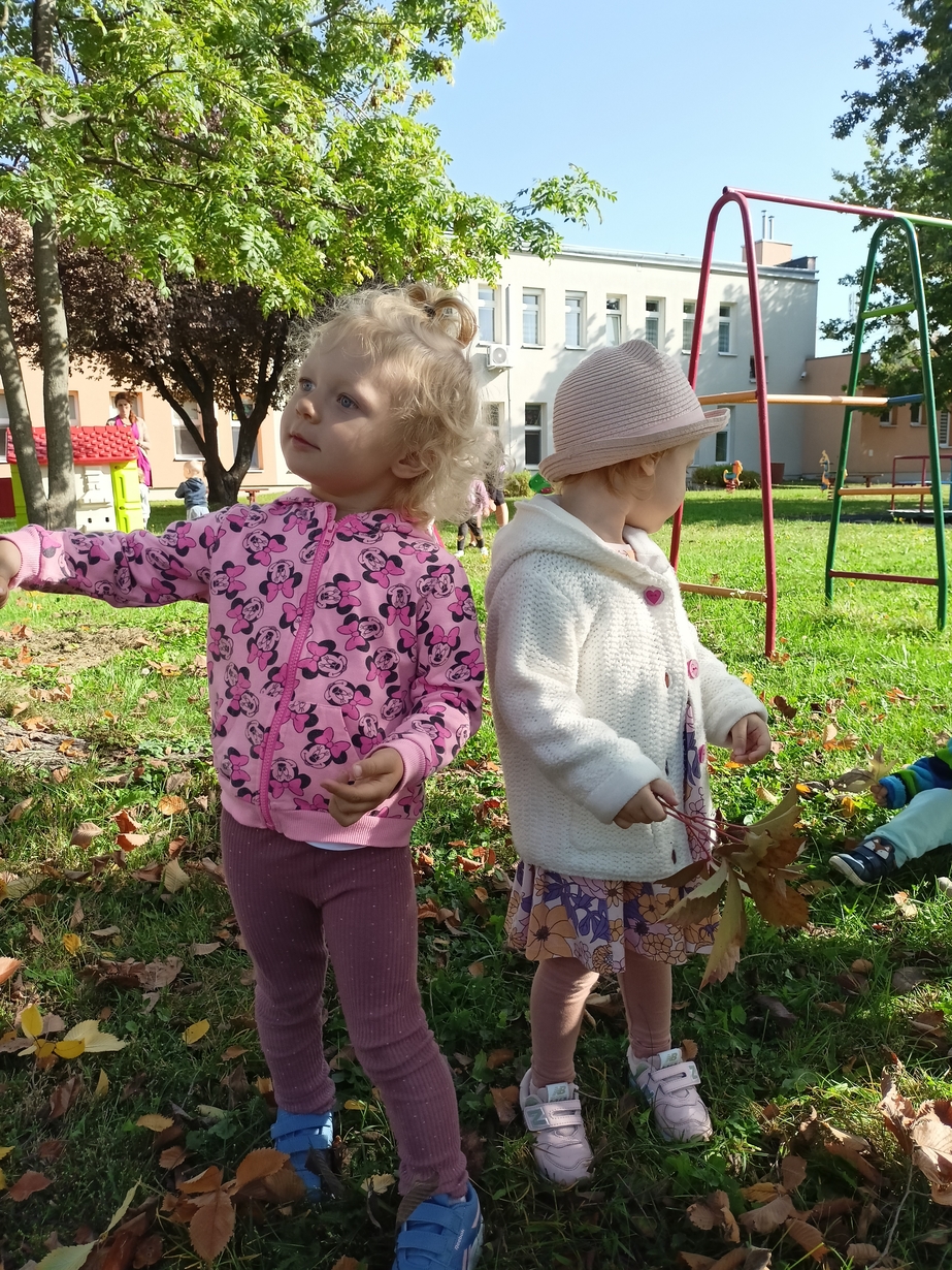 Dzieci z grupy"Pszczółki" wybrały się że śpiewem na spacer w poszukiwaniu oznak jesieni. Piękna pogoda jak i humor dopisywały dzieciom.