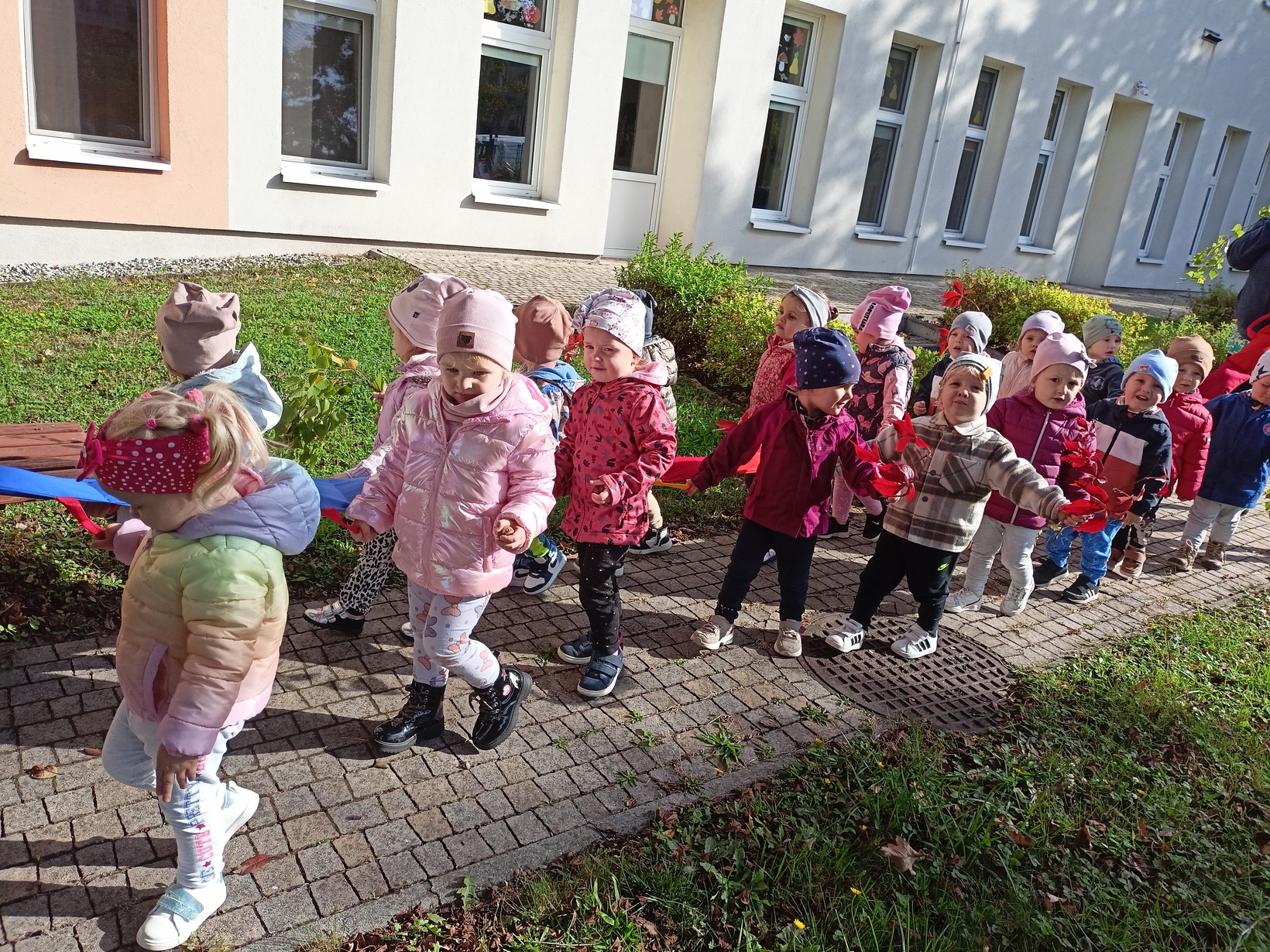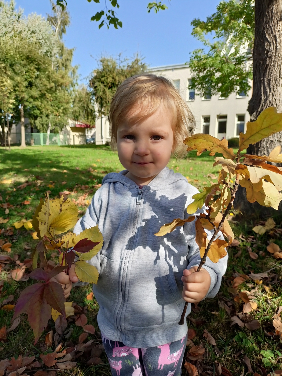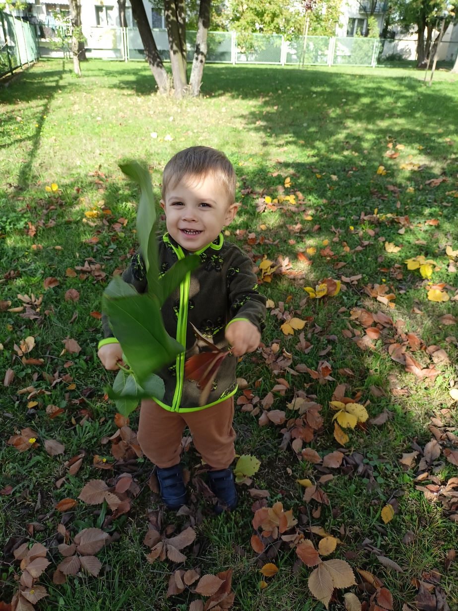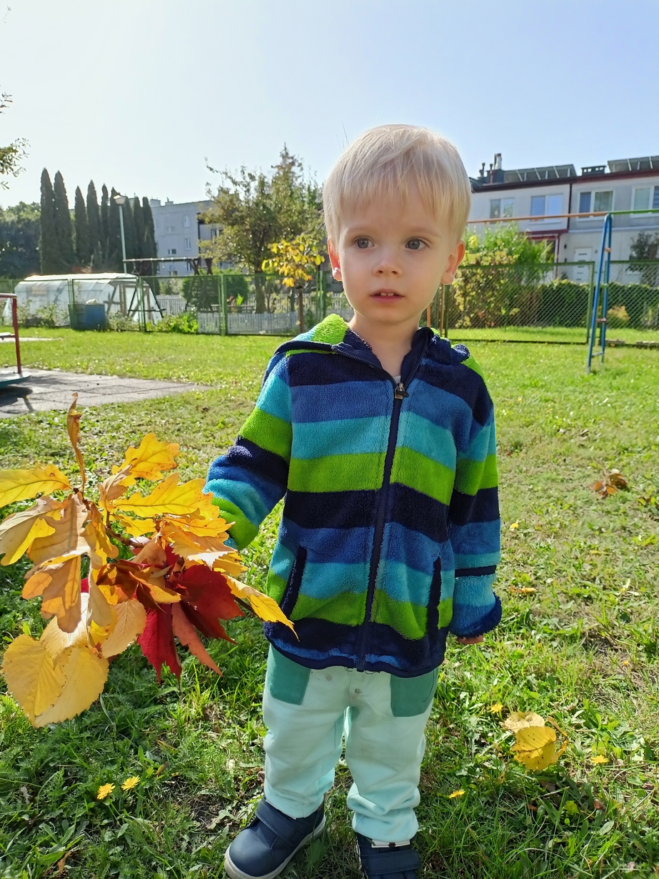 Dzieci z grupy"Pszczółki" wybrały się że śpiewem na spacer w poszukiwaniu oznak jesieni. Piękna pogoda jak i humor dopisywały dzieciom.