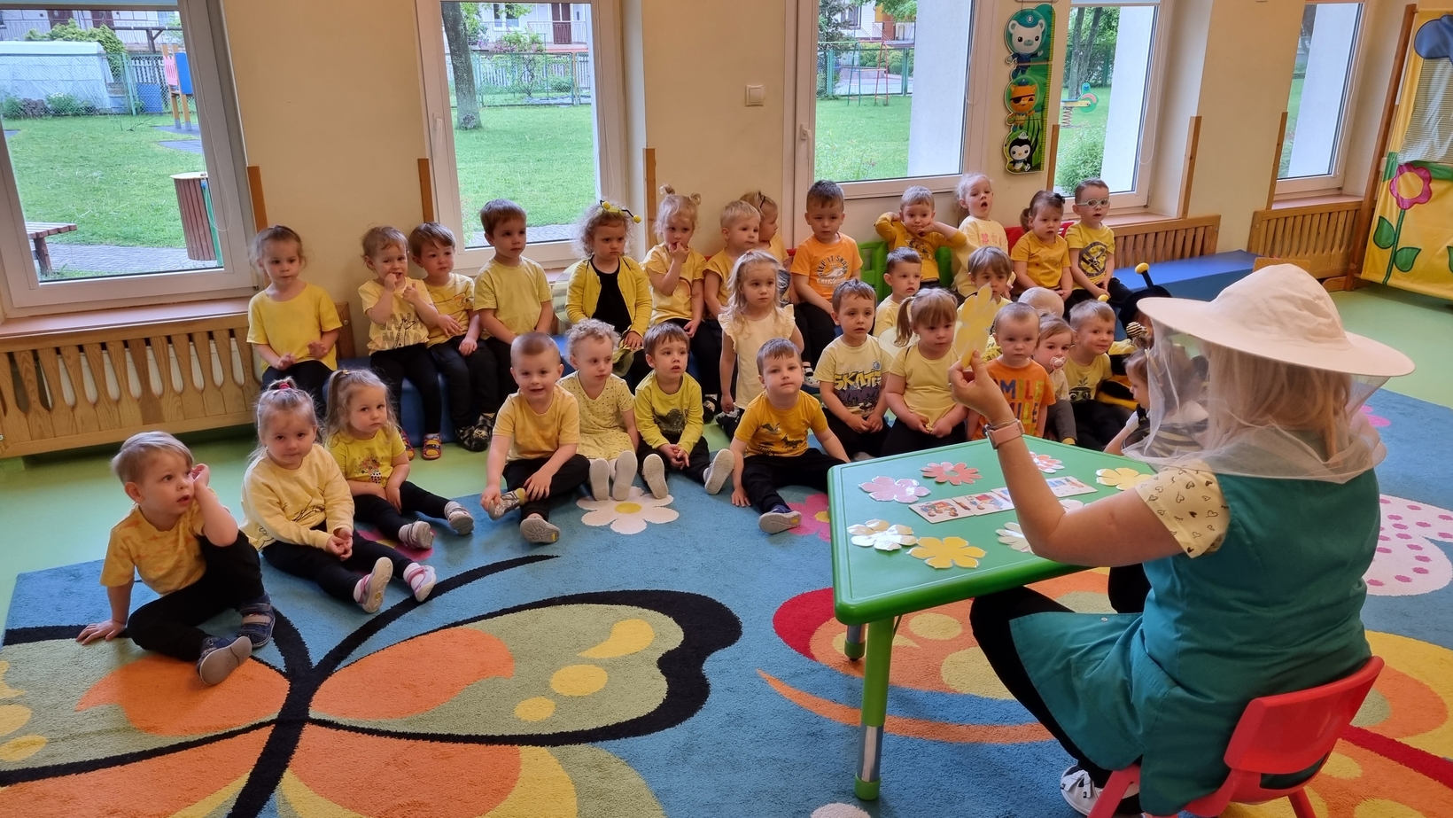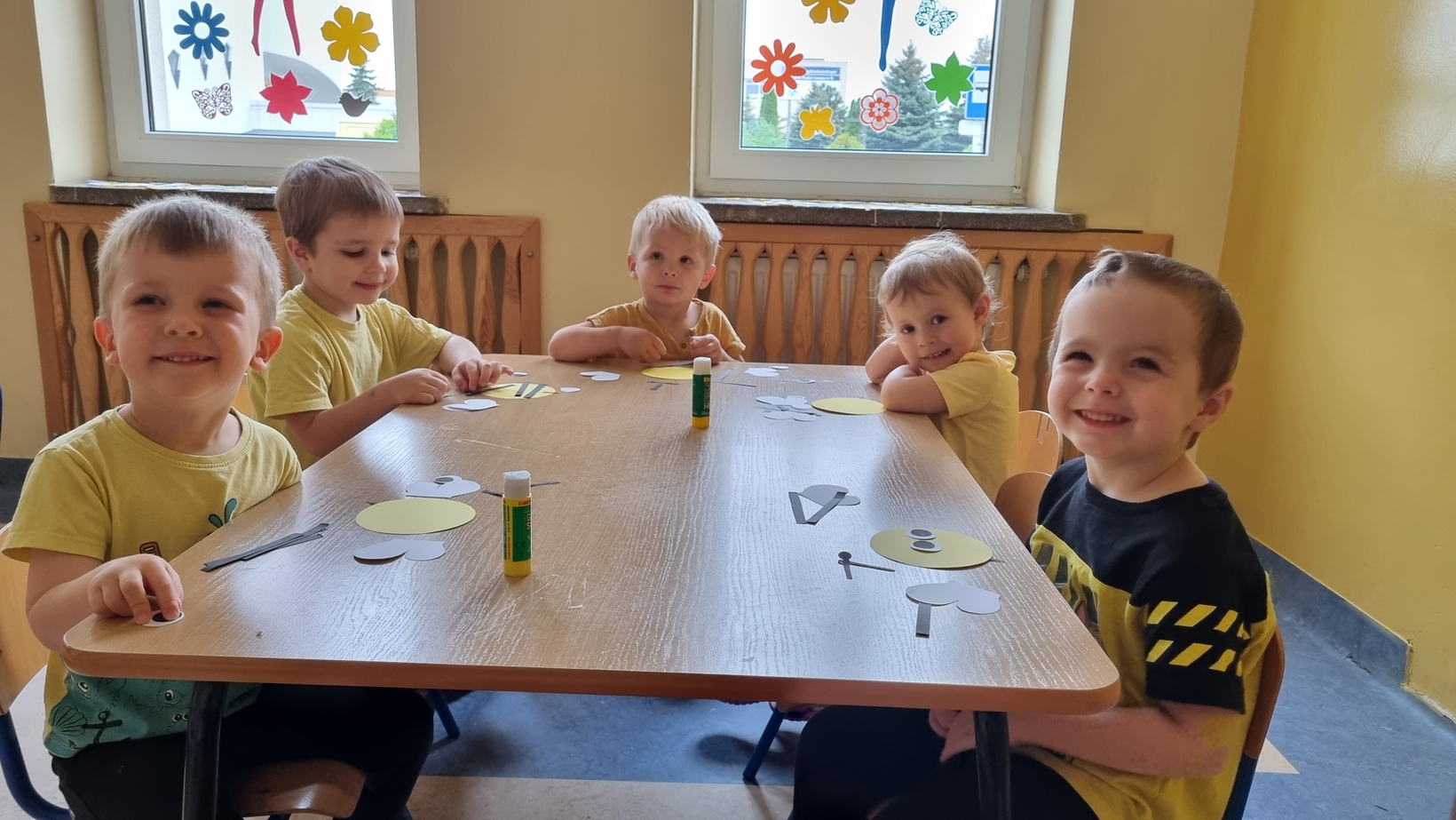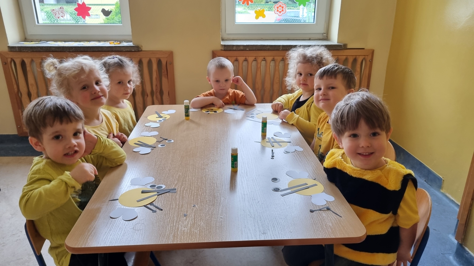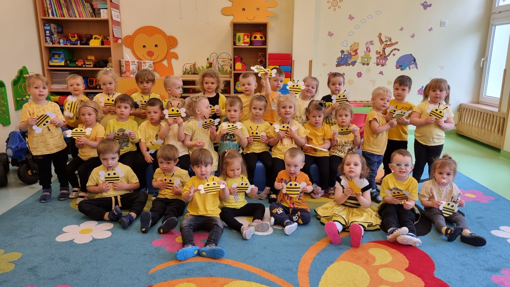 Dzisiaj na naszej grupie obchodziliśmy "Światowy Dzień Pszczół". Z tej okazji zostały przeprowadzone zajęcia, których celem było budzenie świadomości u dzieci o pożyteczności pszczół. Dzieci dowiedziały się jak wygląda praca pszczelarza i pszczół. Na koniec wspólnie z wielkim zaangażowaniem wykonaliśmy prace plastyczną.