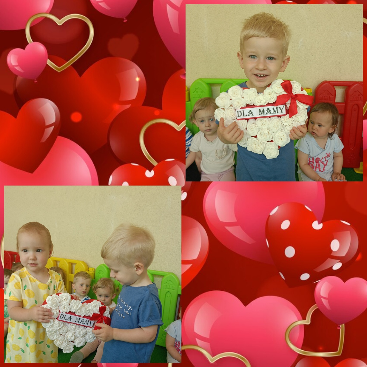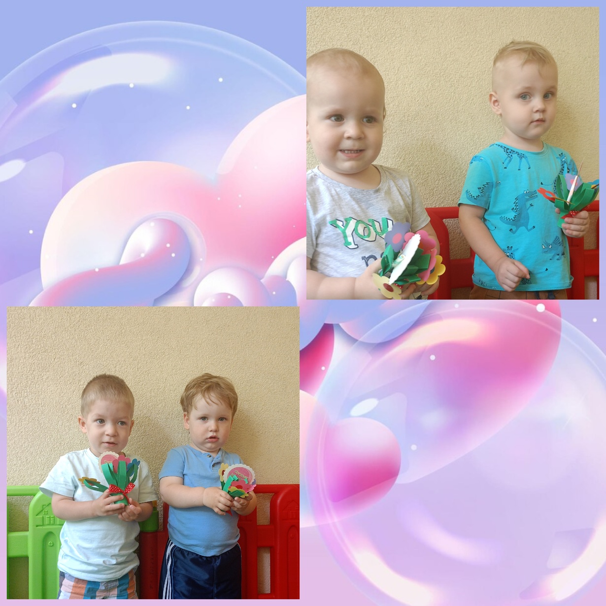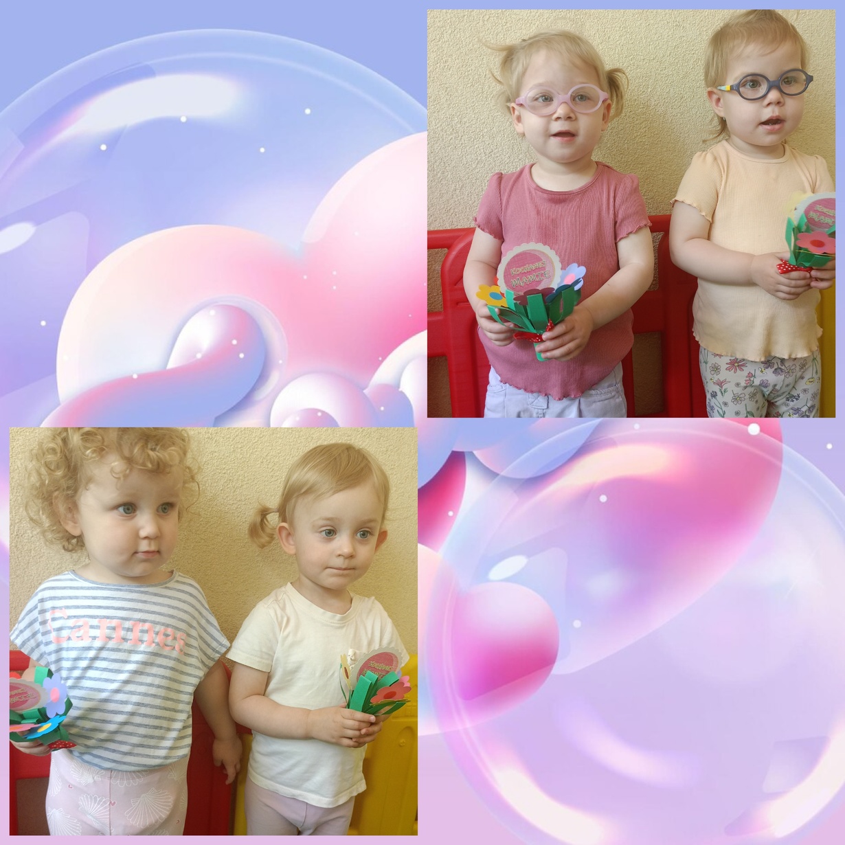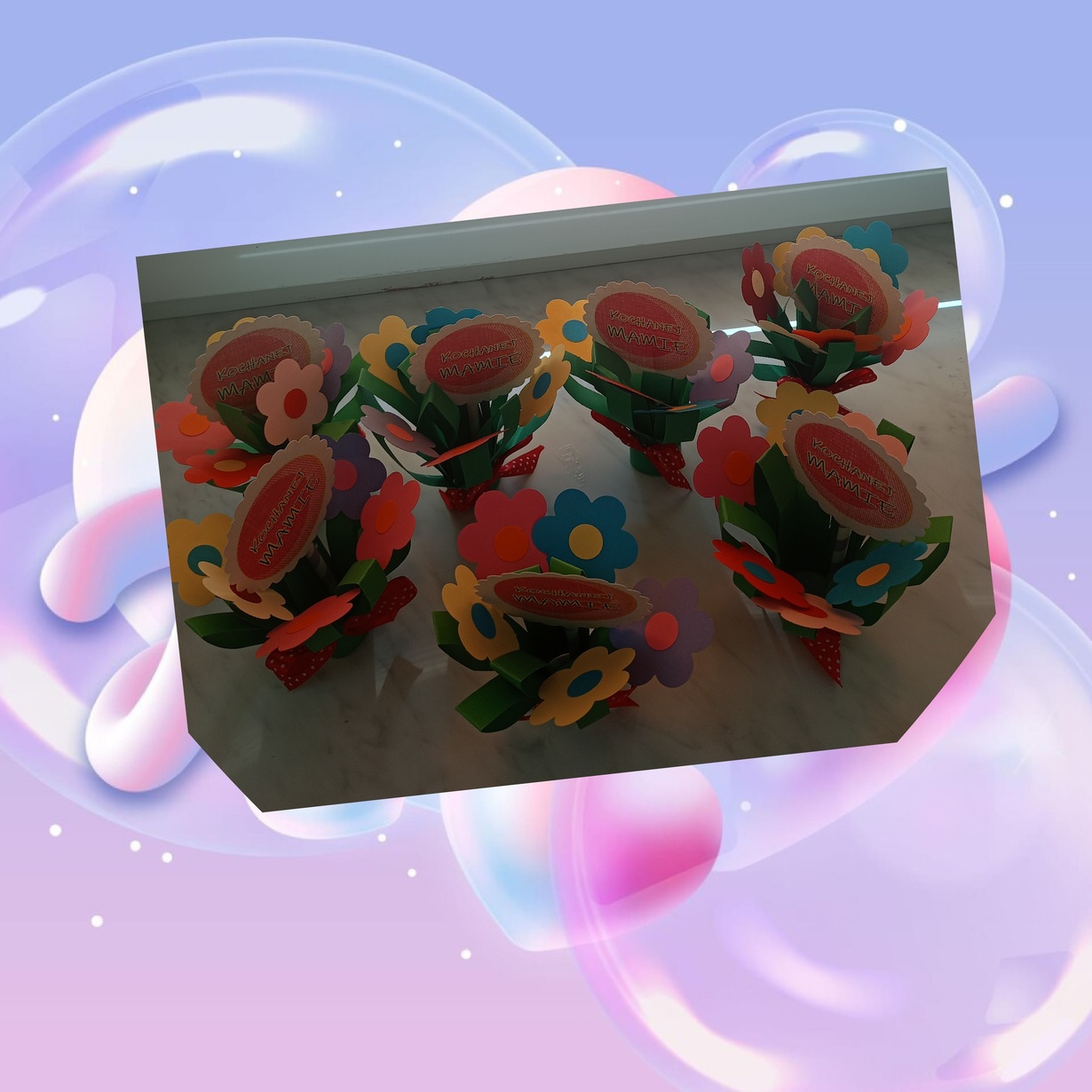 Naszym Kochanym Mamusiom życzymy Wszystkiego Najlepszego ofiarując bukieciki wykonanych z pomocą naszych cioć kolorowych kwiatów.