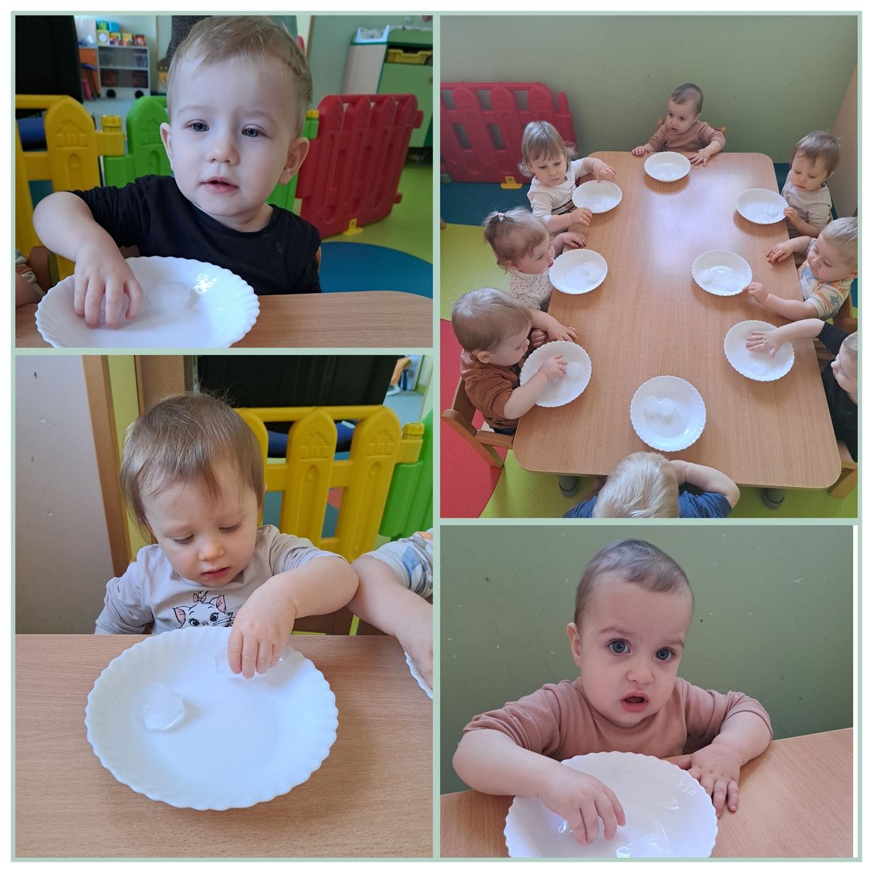 Następnie Motylki brały udział w zabawie badawczej podczas, której mogły poznać stan skupienia wody jakim jest lód. Z dużą ostrożnością, ale też zdziwieniem i zaciekawieniem dotykały kostek lodu. Mogły poznać jej kolor, smak i temperaturę. Nie zabrakło również zajęć twórczych z wykorzystaniem kredek, podczas których dzieci wykonały swoją kropelkę wody. Następnie wspólnie z opiekunkami stworzyły deszczową chmurkę.