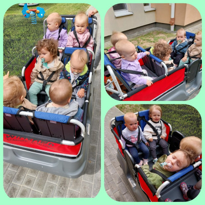 Dzis po raz pierwszy grupa "0" " Motylki" odbyła swòj spacer dookoła żłobka,maluchy podróżowały wygodnie I bezpiecznie w wyjątkowym wózku.Dumne Ciocie testowały prowadzenie pojazdu.Było to miłe doświadczenie a uśmiech gościł na twarzach dzieci.W radosnym nastroju wrócili na pyszny obiad do żłobka .Jeśli tylko pogoda dopisze ,bèdziemy częsciej wychodzić na wspòlne spacery.