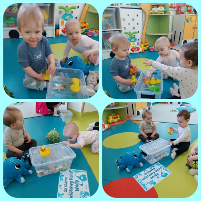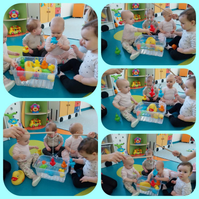 Dzieci obserwowały pływające zwierzątka (kaczuszki,rybki,żółwie,ośmiorniczki)a także z zaciekawieniem wkładały rączki do wody pròbując podotykać zwierzątka.Oczywiście naszym żłobkowiczom sprawiło to najwięcej frajdy.