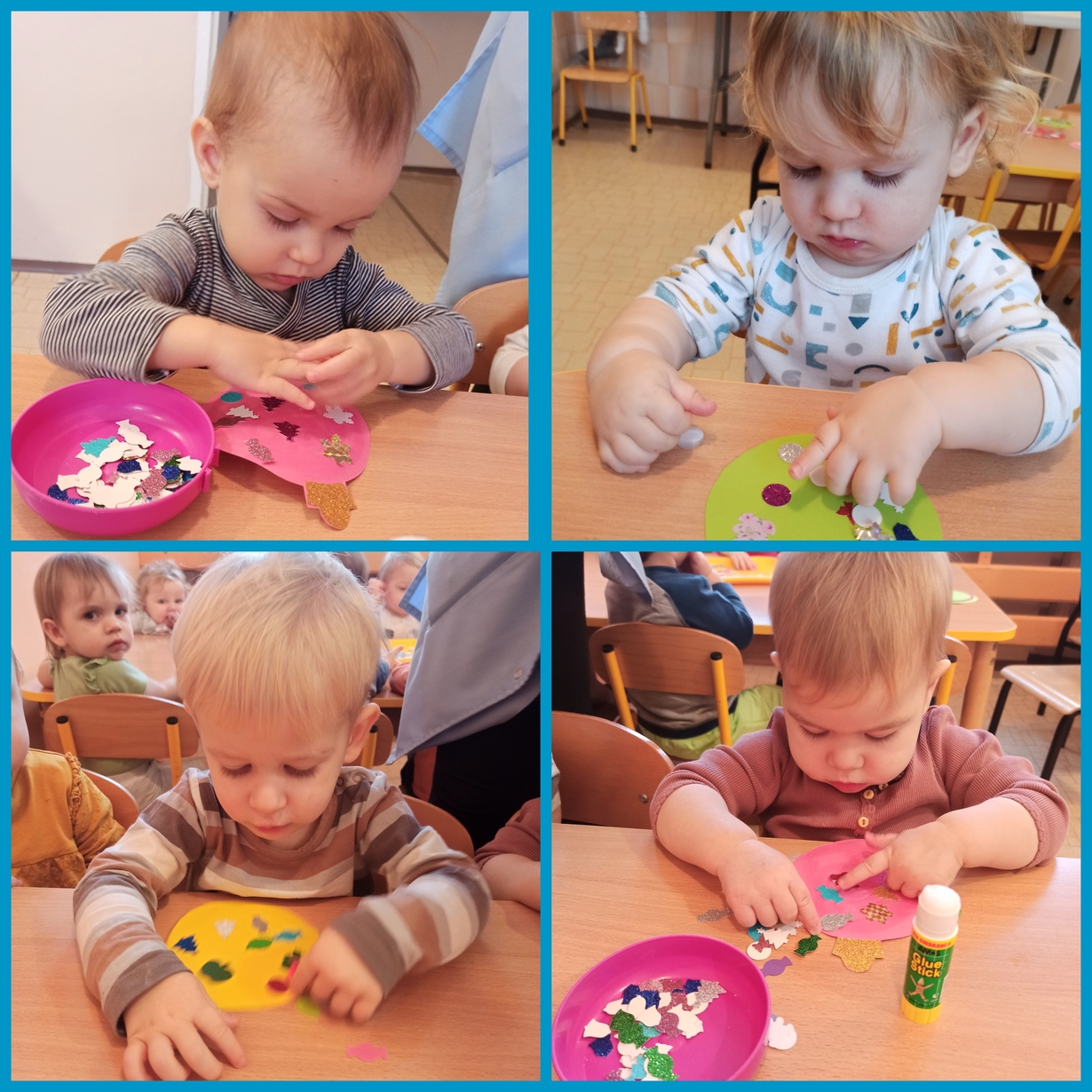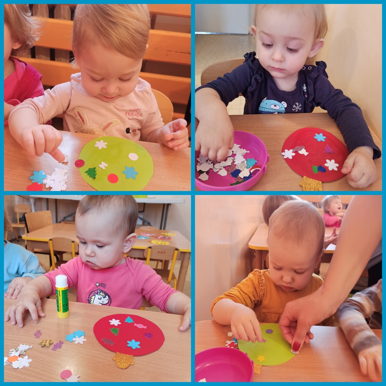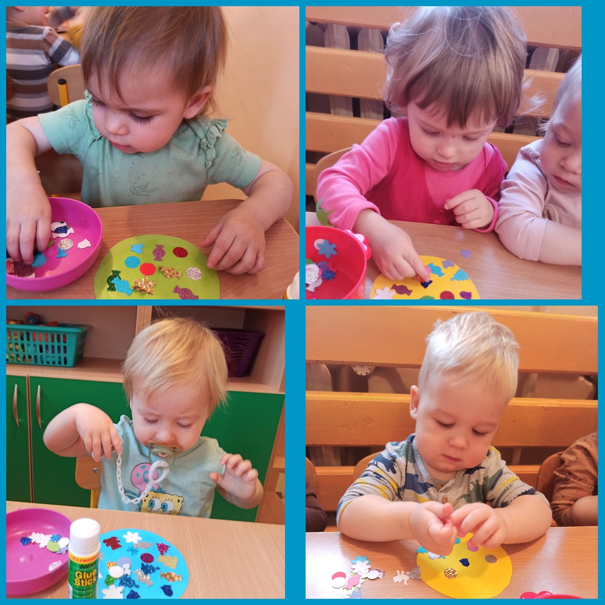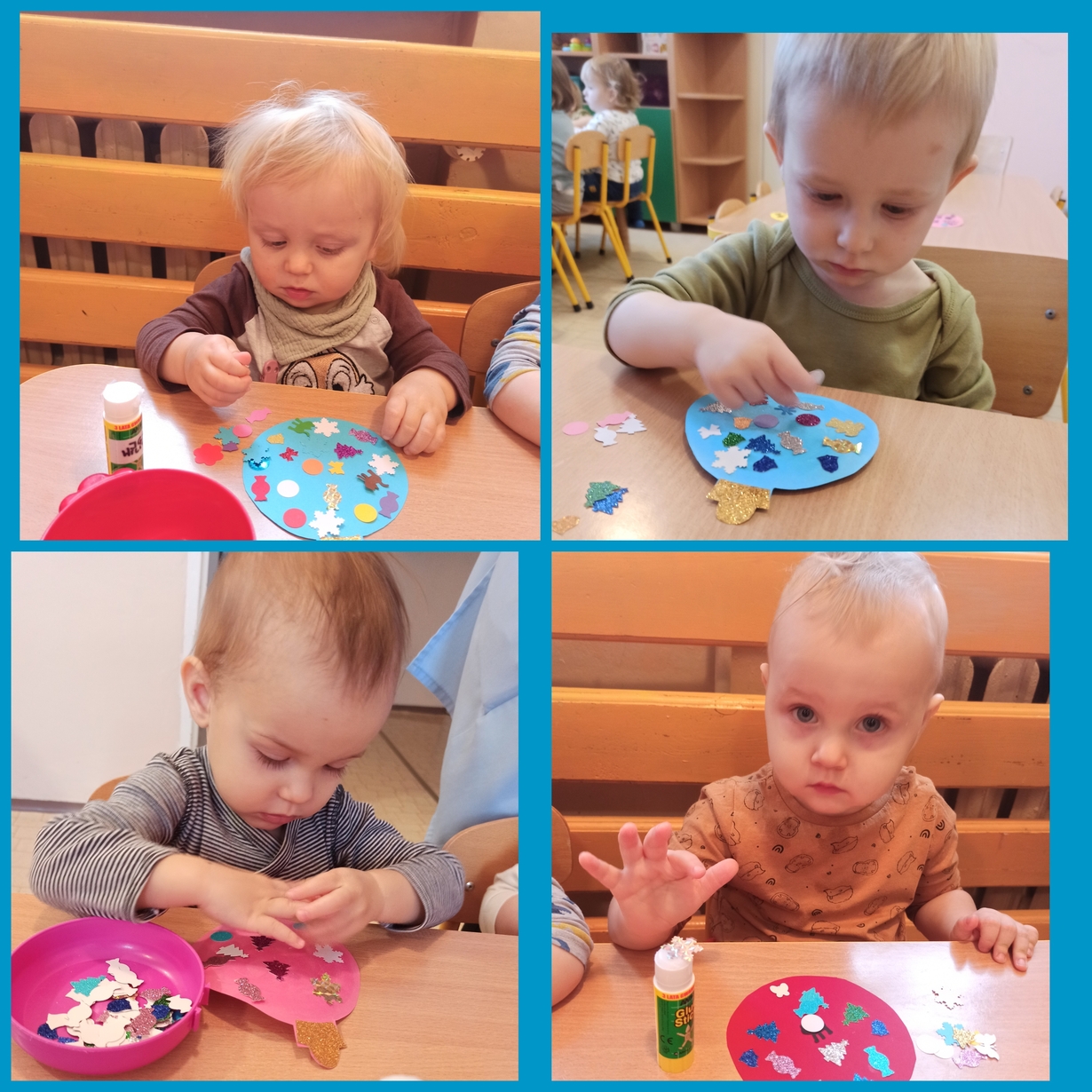 Kolorowe elementy przyklejane do papierowych bombek pięknie błyszczą na naszej tablicy.