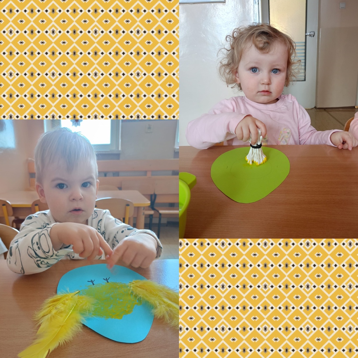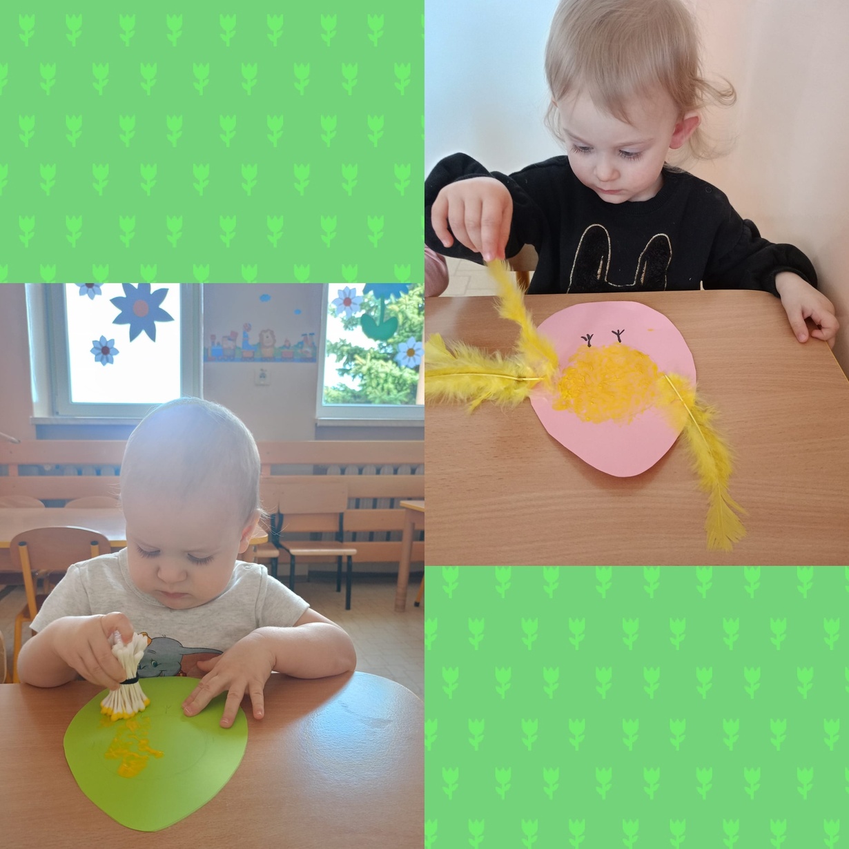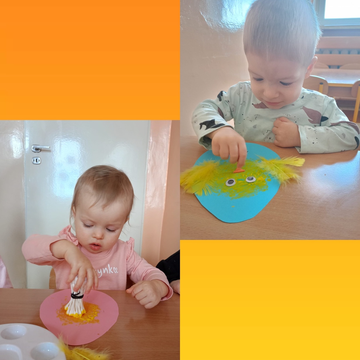Pszczółki pełną parą przygotowują się do Świąt Wielkanocnych. Dziś dzieci poznały symbole wielkanocne : palma, pisanki, baranek, zajączek i słodka babeczka. Z zaciekawieniem oglądały kolorowe ilustracje i wraz z Ciociami przygotowały koszyczek ze święconką. Na koniec małe Pszczółki wymalowały żółciutkie kurczaczki ozdobione mięciutkimi piórkami.