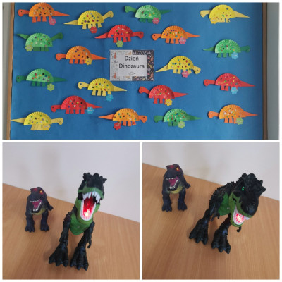 Mimo, że dinozaury dawno wyginęły to nie przestają Nas fascynować. Święto tych prehistorycznych stworzeń obchodzone jest 26 lutego w ramach Światowego Dnia Dinozaura. Nasi podopieczni w tym dniu wykonali efektowne prace plastyczne, przedstawiające różnokolorowe dinozaury. Do wykonania prac posłużyły Nam papierowe talerzyki, pomalowane farbą, plastelina, kolorowy blok i ruchome oczka. Gotowe dinozaury spoglądają teraz z naszej tablicy na odwiedzających nasz Żłobek. Dzieci miały także okazje zobaczyć dinozaura w wersji zabawkowej, wykonanego z gumy oraz interaktywnego - chodzącego i wydającego dźwięki. To była nie lada atrakcja. Zapraszamy do galerii zdjęć.