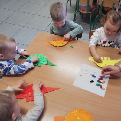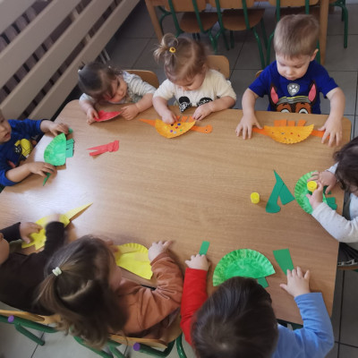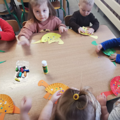 IZdjęcie przedstawia dzieci wykonujące prace plastyczne z okazji Dnia Dinozaura.