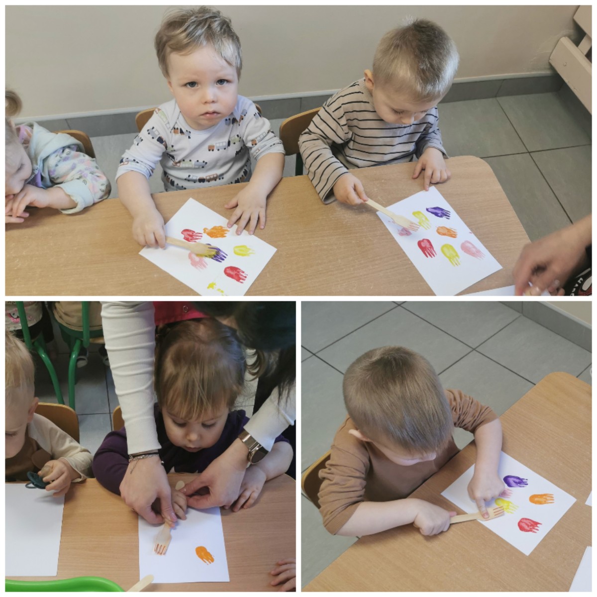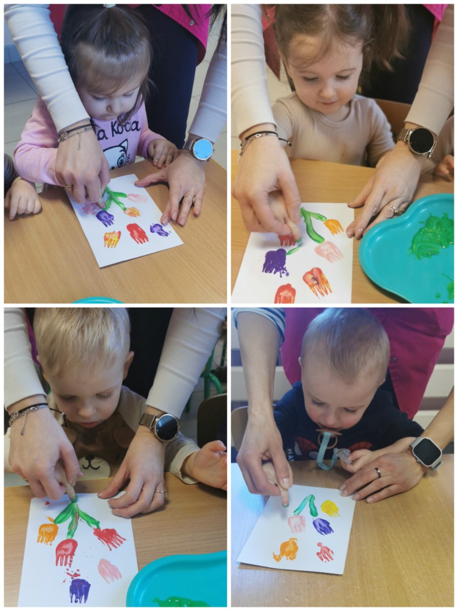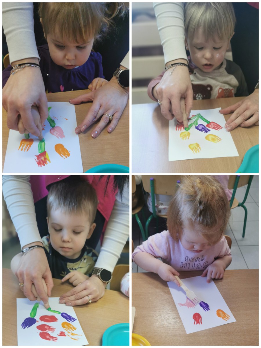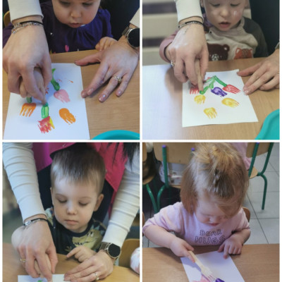 W ten niezwykły dzień w roku, kiedy to swoje święto obchodzą Panie, nasze małe Biedroneczki postanowiły uczcić te dzień a także rozwijać swój talent artystyczny. Z tej okazji stworzyliśmy piękne obrazki, przedstawiające bukiecik kolorowych tulipanów. Wykorzystaliśmy w tym celu farby i drewniane widelce, za pomocą których dzieci odbijały przy asekuracji cioć tulipany na kartce. Kolorowe kwiatki pięknie zapełniły naszą tablicę i z daleka przywołują wiosnę i cieplutkie słonko. Zapraszamy do obejrzenia zdjęć :)