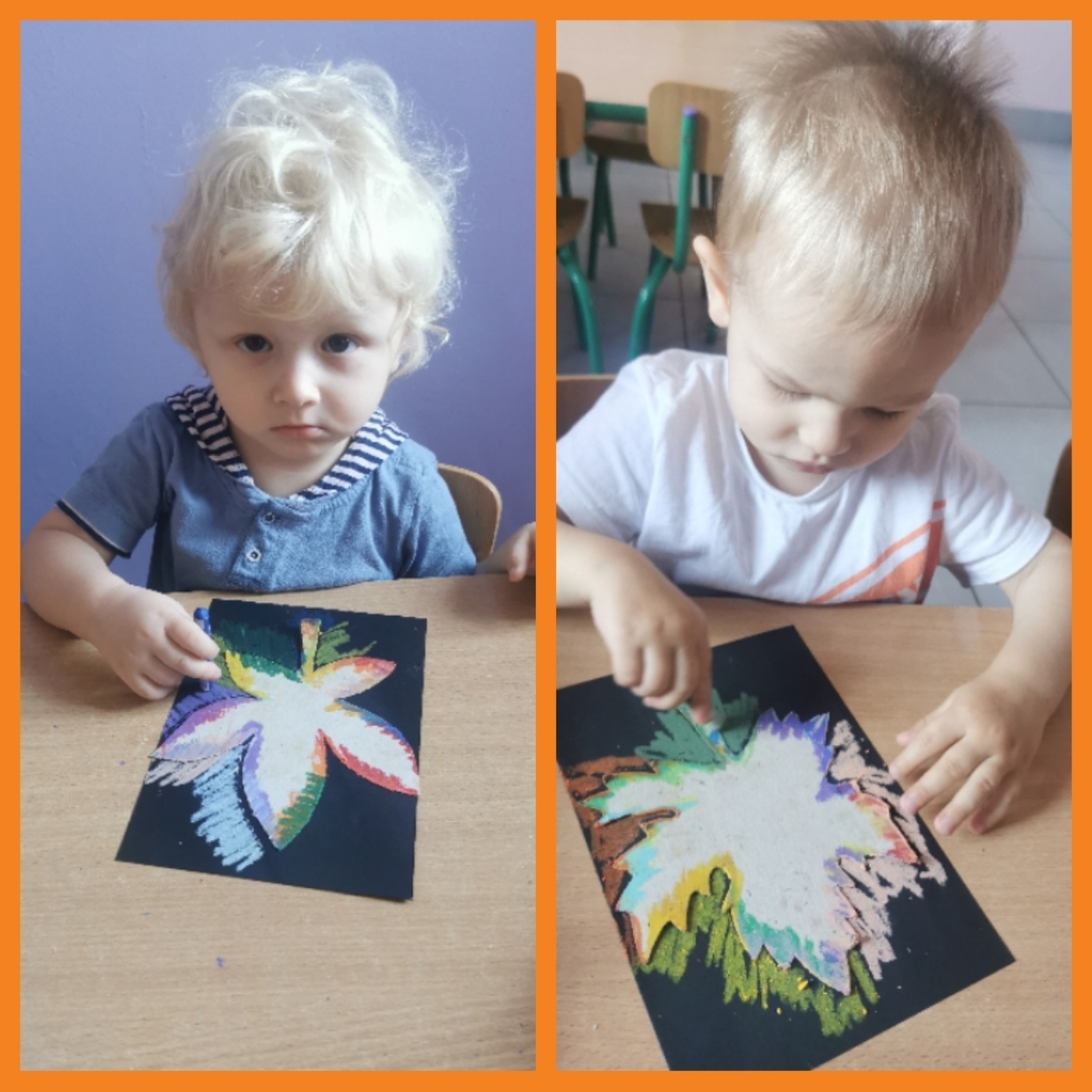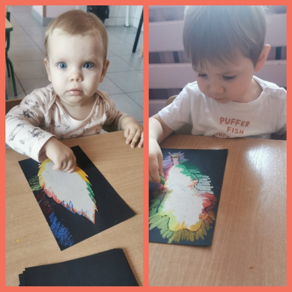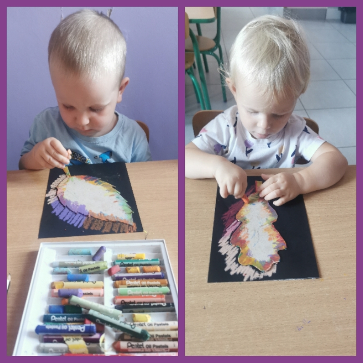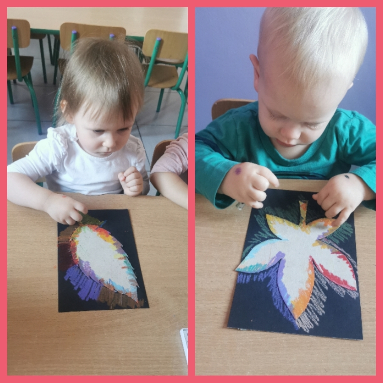 Jesień zawitała w nasze skromne progi, a my witając ją mile wykonaliśmy piękne prace plastyczne z motywem jesiennym. Na czarnych kartkach z wykorzystaniem kolorowych pasteli odbijaliśmy szablony jesiennych liści, które mienią się pięknymi barwami jakimi obdarowuje nas Jesień. Klimat tej magicznej pory roku zawitał na dobre w naszym żłobku i może wpłynąć na każdego, kto spojrzy na nasze dzieła. Zapraszamy do galerii zdjęć.