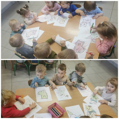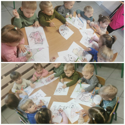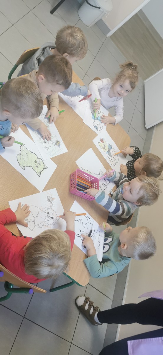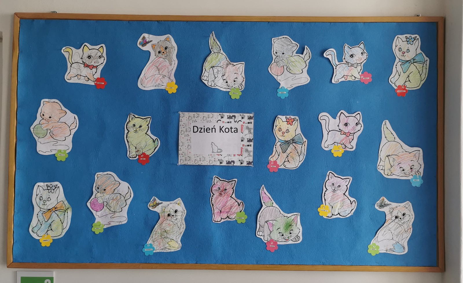 Dzisiaj kontynuując świętowanie "Światowego Dnia Kota" mali podopieczni wykolorowali sylwetki kotków różnokolorowymi kredkami, ćwicząc przy tym motorykę małą oraz nazwy i rozpoznawanie kolorów. Gotowe prace zostały powieszone na tablicy w żłobkowym korytarzu.