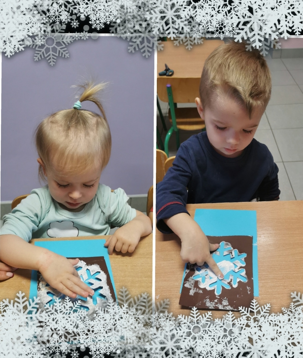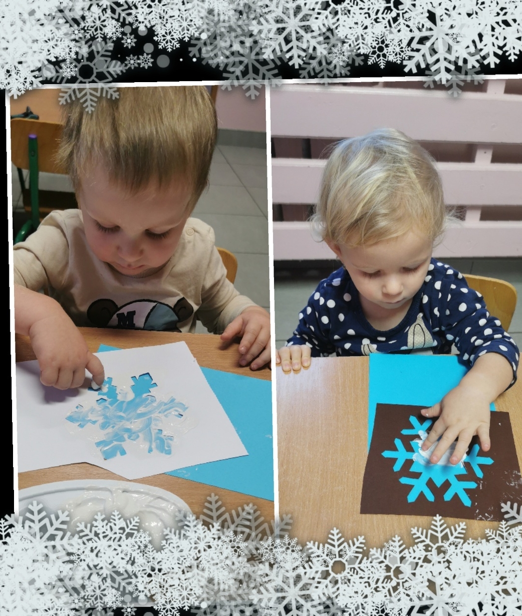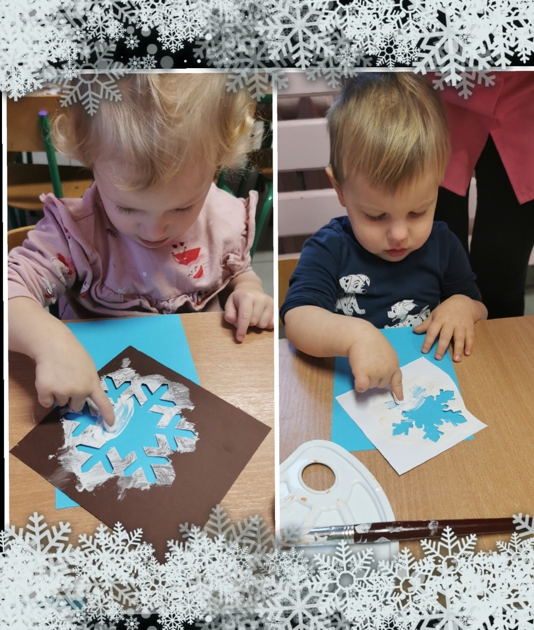 Stworzyliśmy je z wykorzystaniem białej farby , którą dzieci rozcierały paluszkami na szablonie przedstawiającym płatki śniegu,