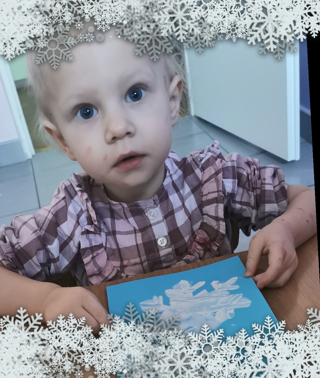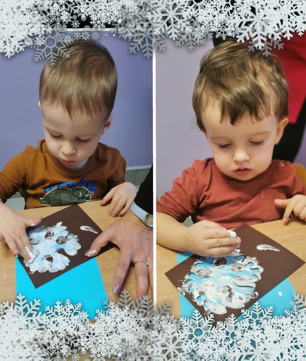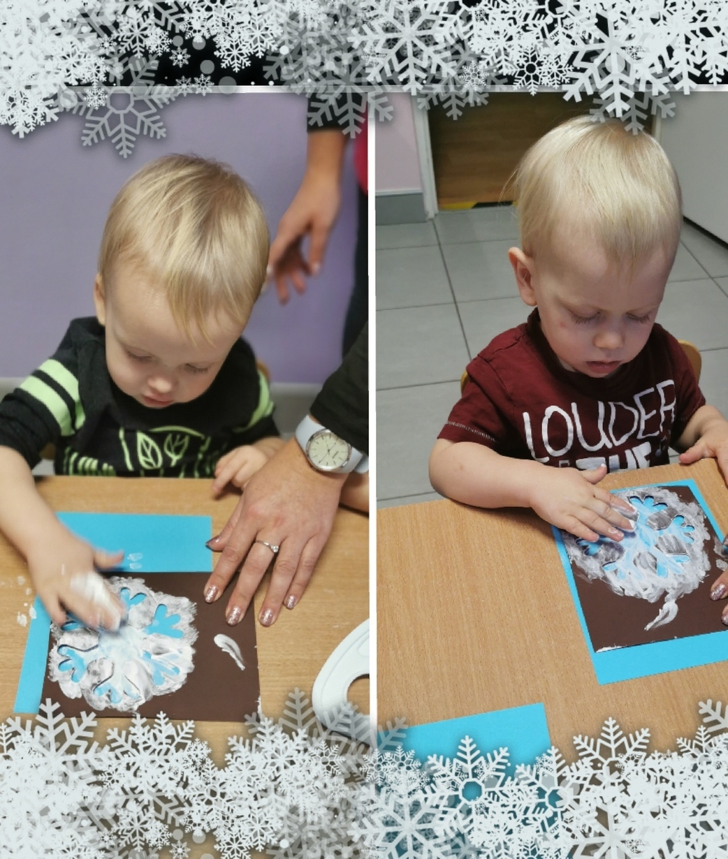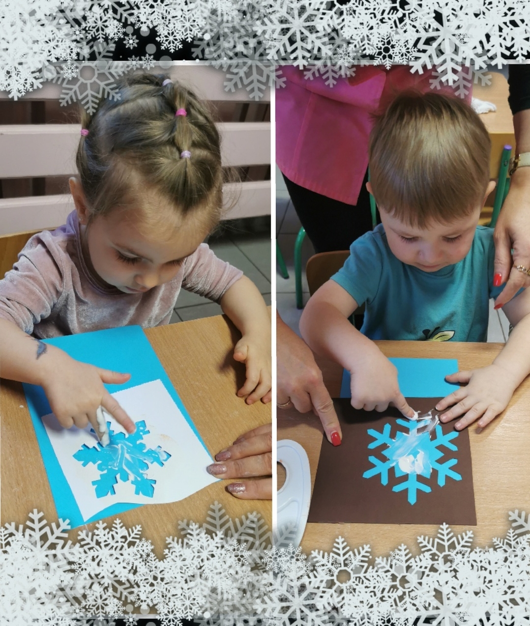 Stworzyliśmy je z wykorzystaniem białej farby , którą dzieci rozcierały paluszkami na szablonie przedstawiającym płatki śniegu,