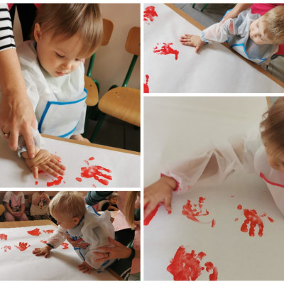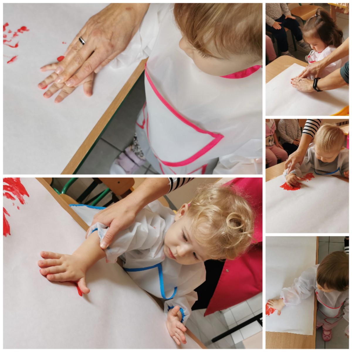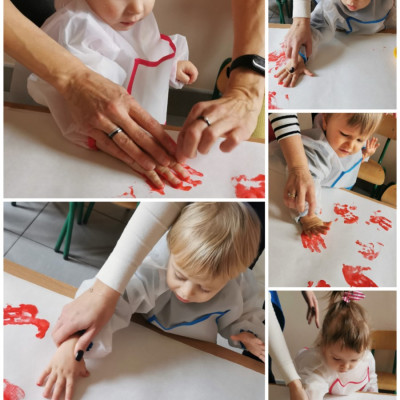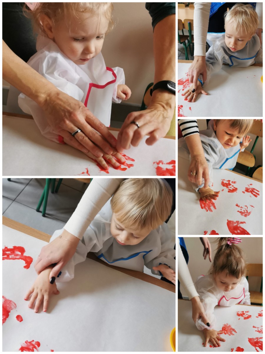 Nasi podopieczni wykonali wspólną pracę, na której odbili rączki czerwoną farbą jako symbol spraeciwu wobec przemocy.