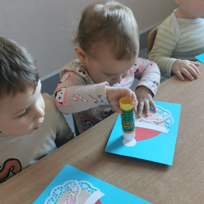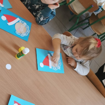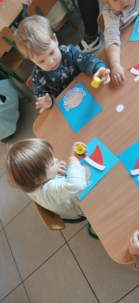 Zdjęcie przedstawia dzieci wykonujące mikołajkowe prace plastyczne.