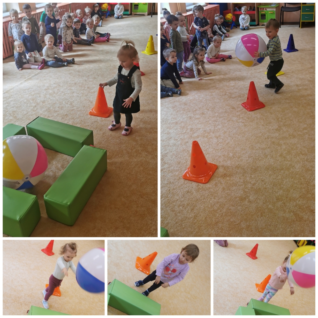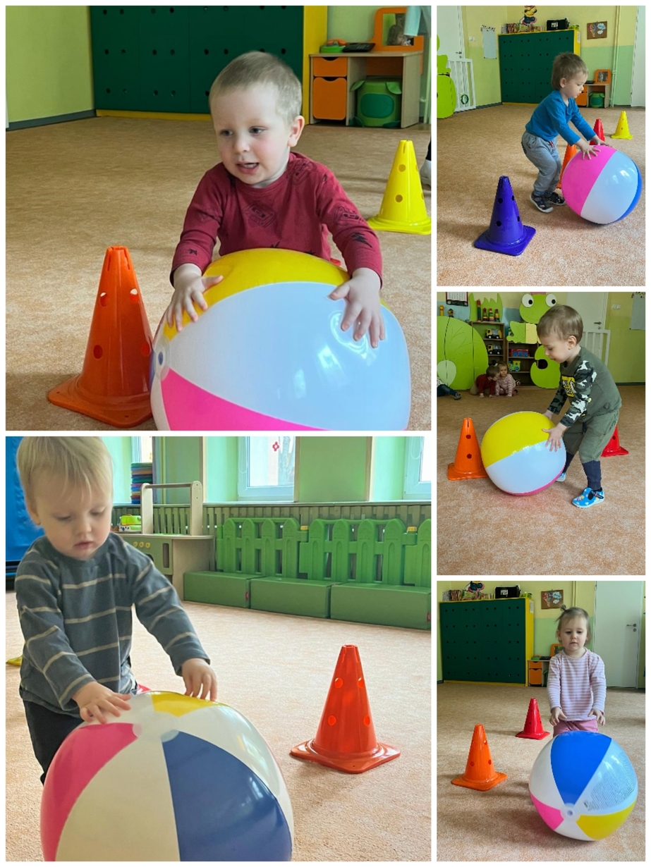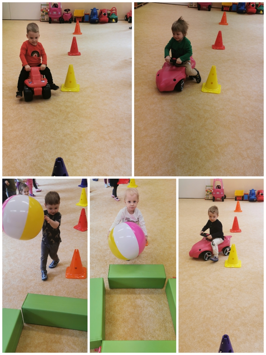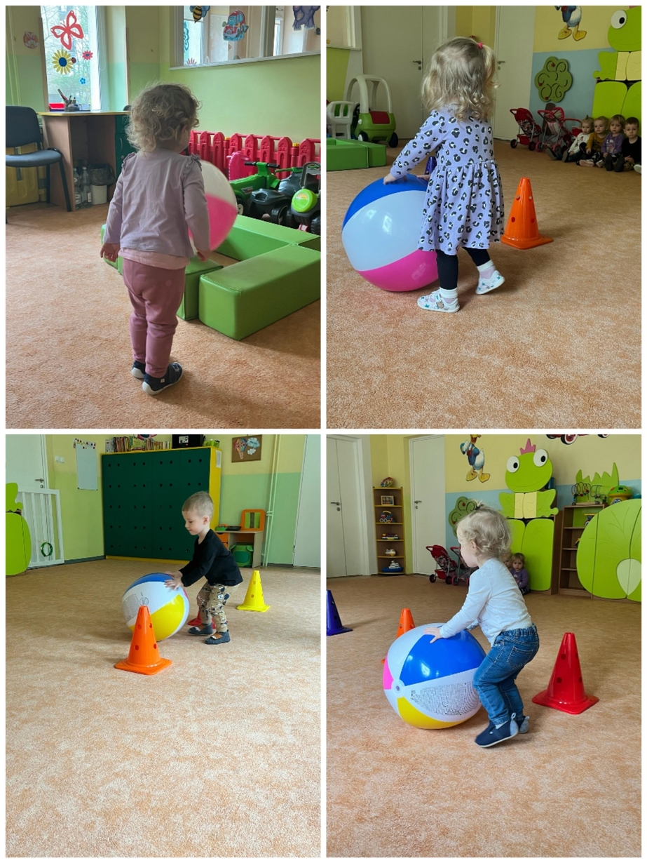 Dzisiaj dzieci aktywnie uczestniczyły w zajęciach ruchowych. Tym razem ciocie stworzyły tor, który dzieci pokonywały kozłując, turlając, bądź trzymając piłkę. Był również marsz z taczkami, rzucanie piłką do celu, czy slalom autkiem. Dzień upłynął nam aktywnie i wesoło.