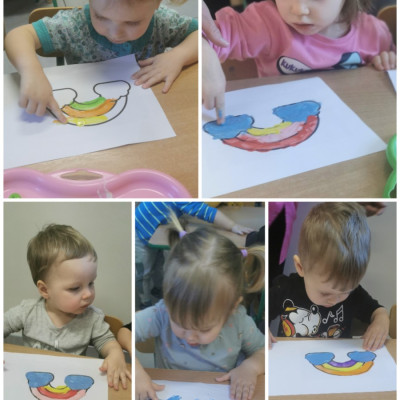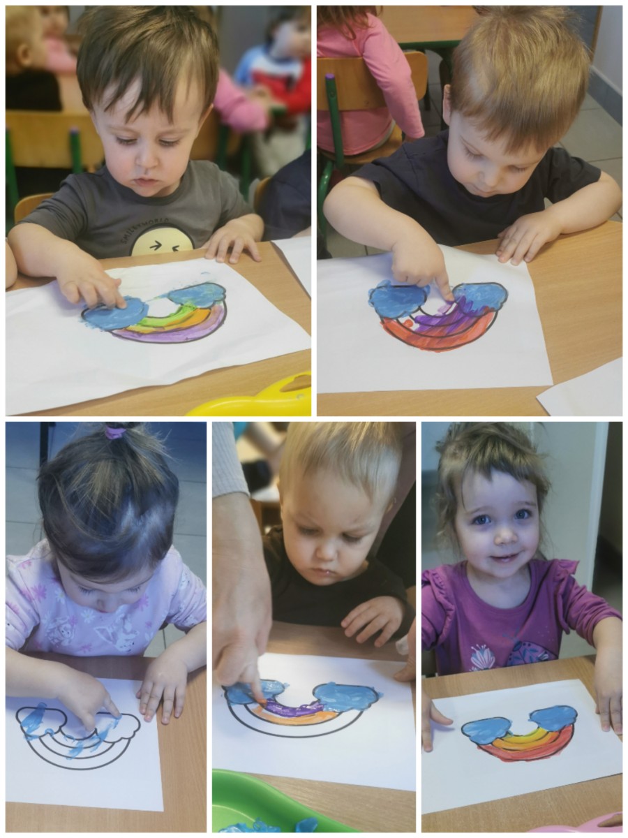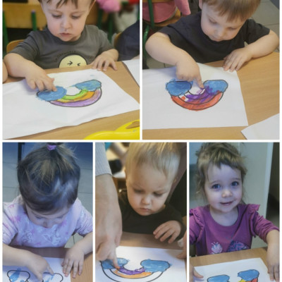 Dzisiaj u nas tęczowo i radośnie. Nasze uzdolnione Biedroneczki wykonały kolejne prace plastyczne, których tematem była tęcza. Dzieci ćwicząc motorykę małą malowały tęczę kolorowymi farbkami paluszkami. Precyzję i talent naszych milusińskich można podziwiać na żłobkowej tablicy oraz na załączonych zdjęciach.