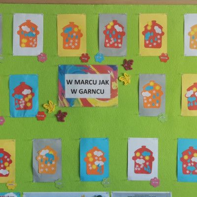 Przyszła do nas w końcu upragniona wiosna. Jednak marzec jak to marzec lubi płatać figle. Jak mówi stare powiedzenie "w marcu jak w garncu" możemy spodziewać się różnych grymasów pogodowych. Biedronki są na to przygotowane i wykonały z tej okazji prace plastyczne, których tematem było owe przysłowie. Na kolorowym garnuszku dzieci przykleiły różne stany pogodowe: deszcz, śnieg, słońce itp. Gotowe prace pięknie prezentują się na naszej żłobkowej tablicy. Zapraszamy do galerii zdjęć.