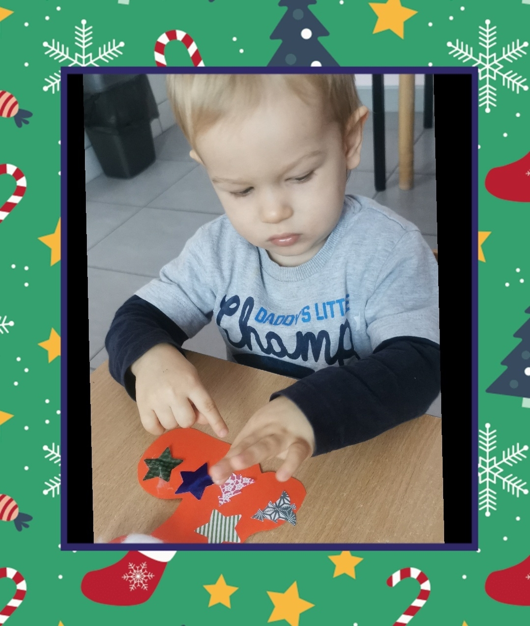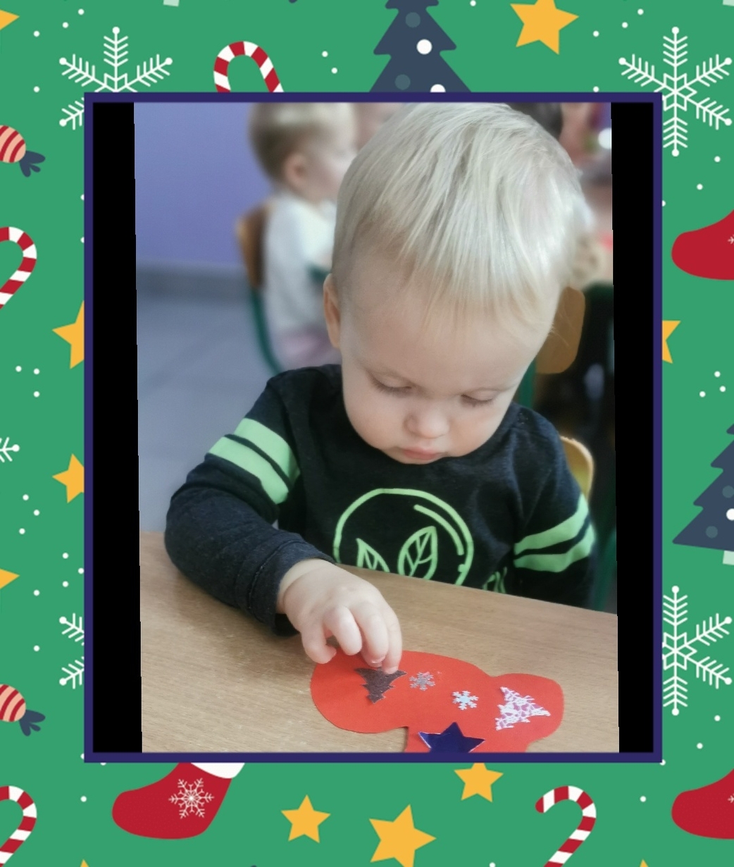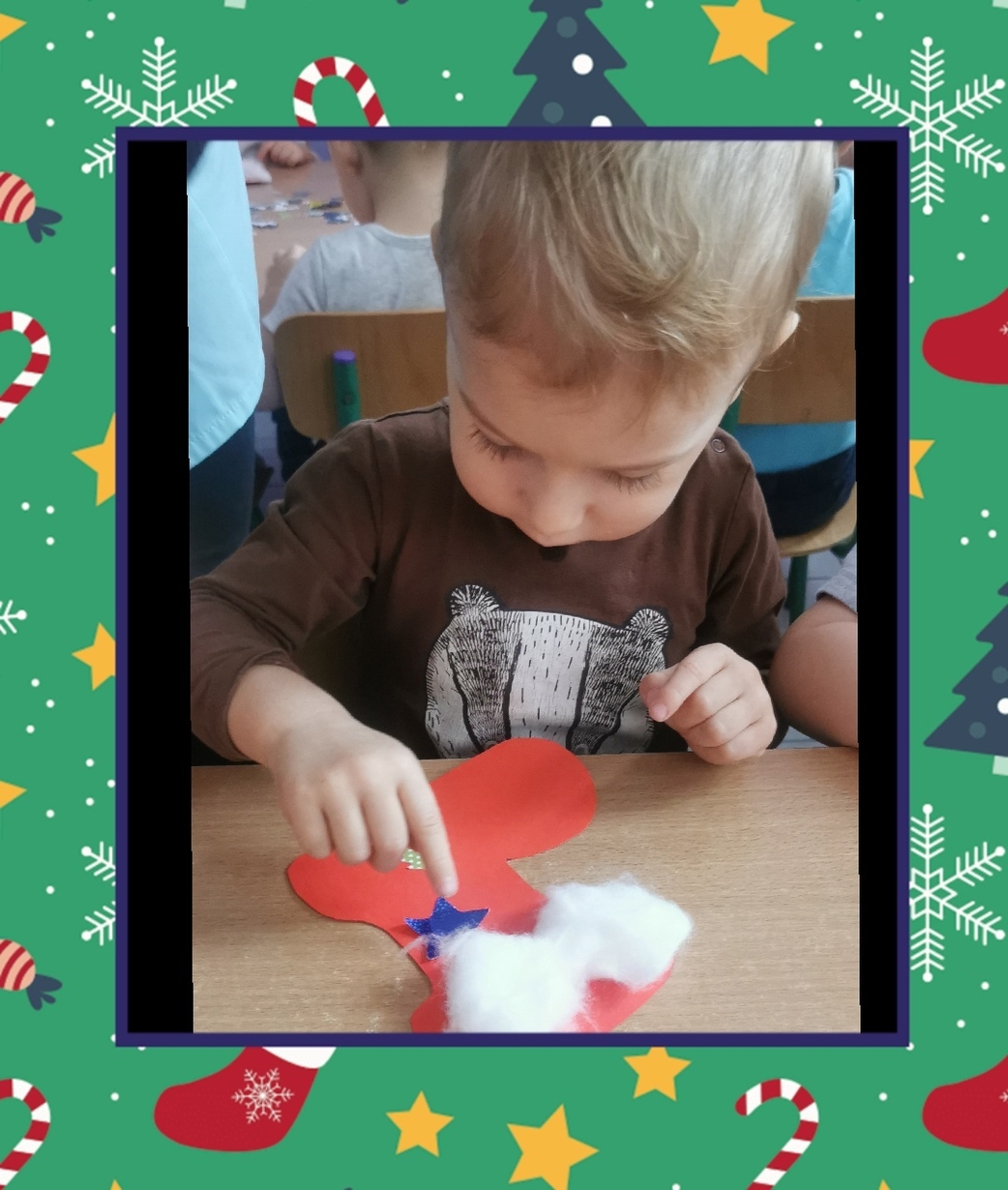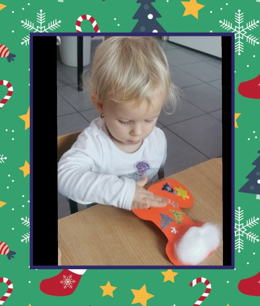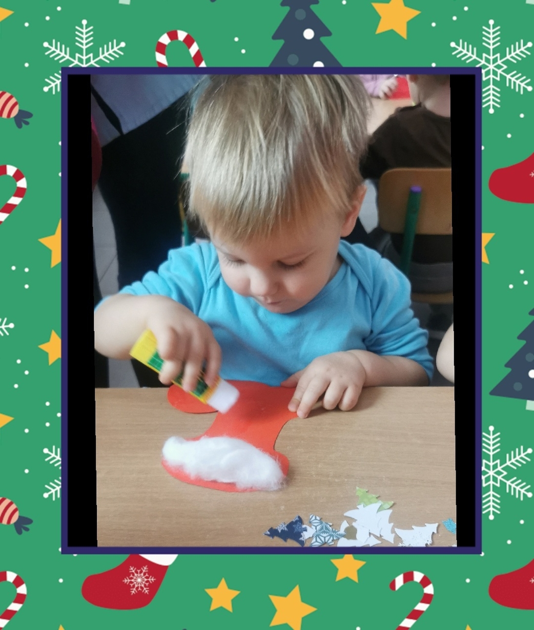 W grupie Biedronek dzisiaj się działo co niemiara. W oczekiwaniu na to szczególne spotkanie wykonaliśmy prace plastyczne, które nawiązywały tematem do osoby Św. Mikołaja mianowicie stanowiły cześć jego ubioru. Dzieci ozdabiały buta Św. Mikołaja watą oraz różnymi kolorowymi, blyszczacymi, świątecznymi ozdobami. Mamy nadzieję, że przypadną do gustu prawdziwemu Mikołajowi, a póki co wszyscy mogą je podziwiać na tablicy w naszym żłobku.