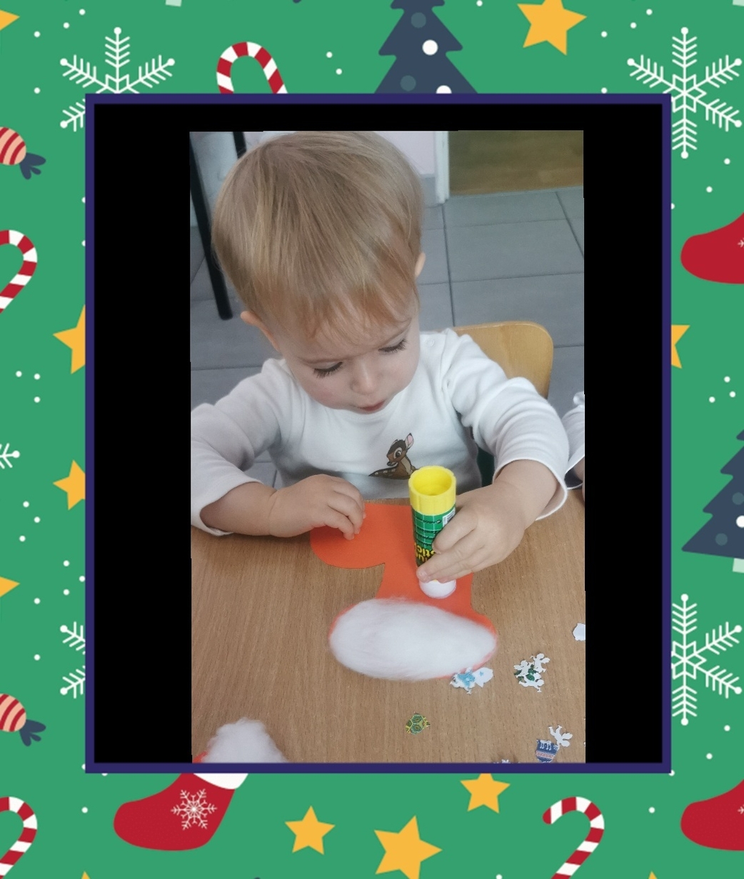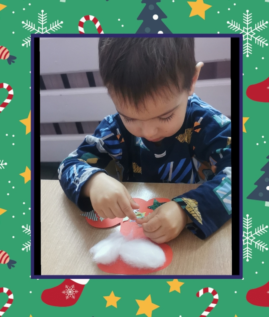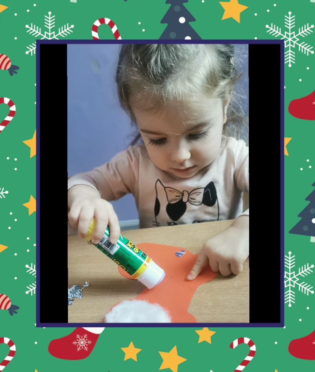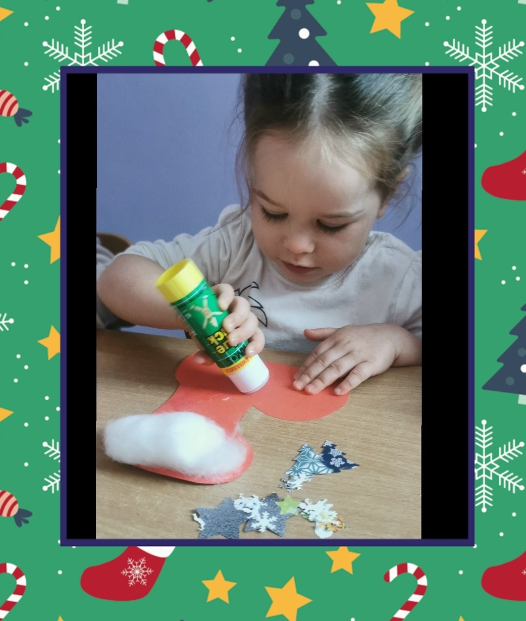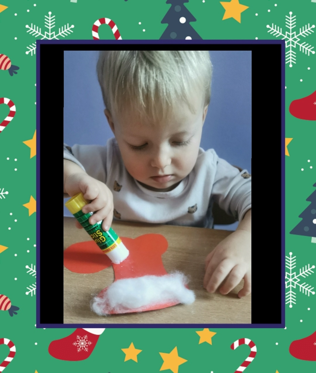 W grupie Biedronek dzisiaj się działo co niemiara. W oczekiwaniu na to szczególne spotkanie wykonaliśmy prace plastyczne, które nawiązywały tematem do osoby Św. Mikołaja mianowicie stanowiły cześć jego ubioru. Dzieci ozdabiały buta Św. Mikołaja watą oraz różnymi kolorowymi, blyszczacymi, świątecznymi ozdobami. Mamy nadzieję, że przypadną do gustu prawdziwemu Mikołajowi, a póki co wszyscy mogą je podziwiać na tablicy w naszym żłobku.
