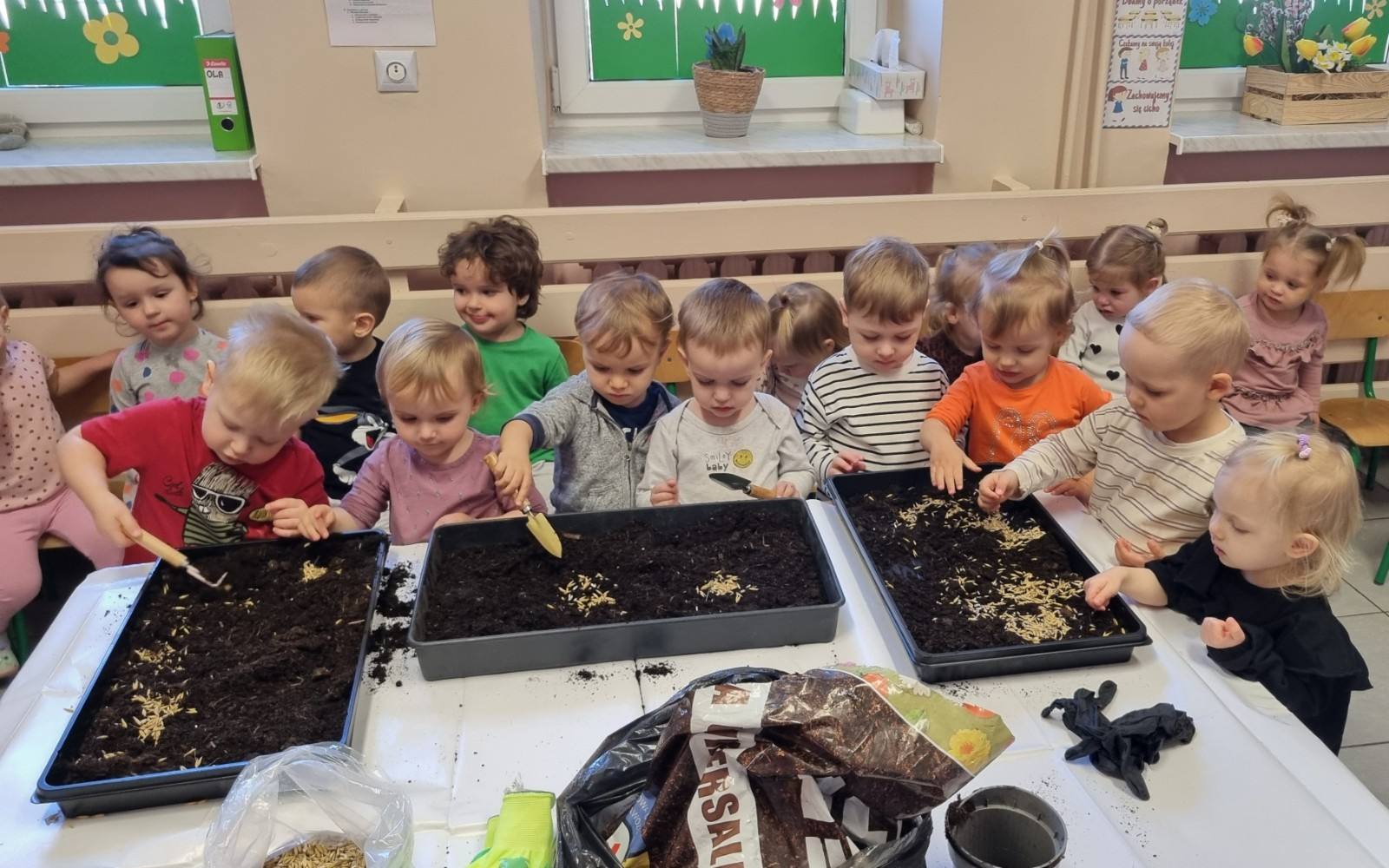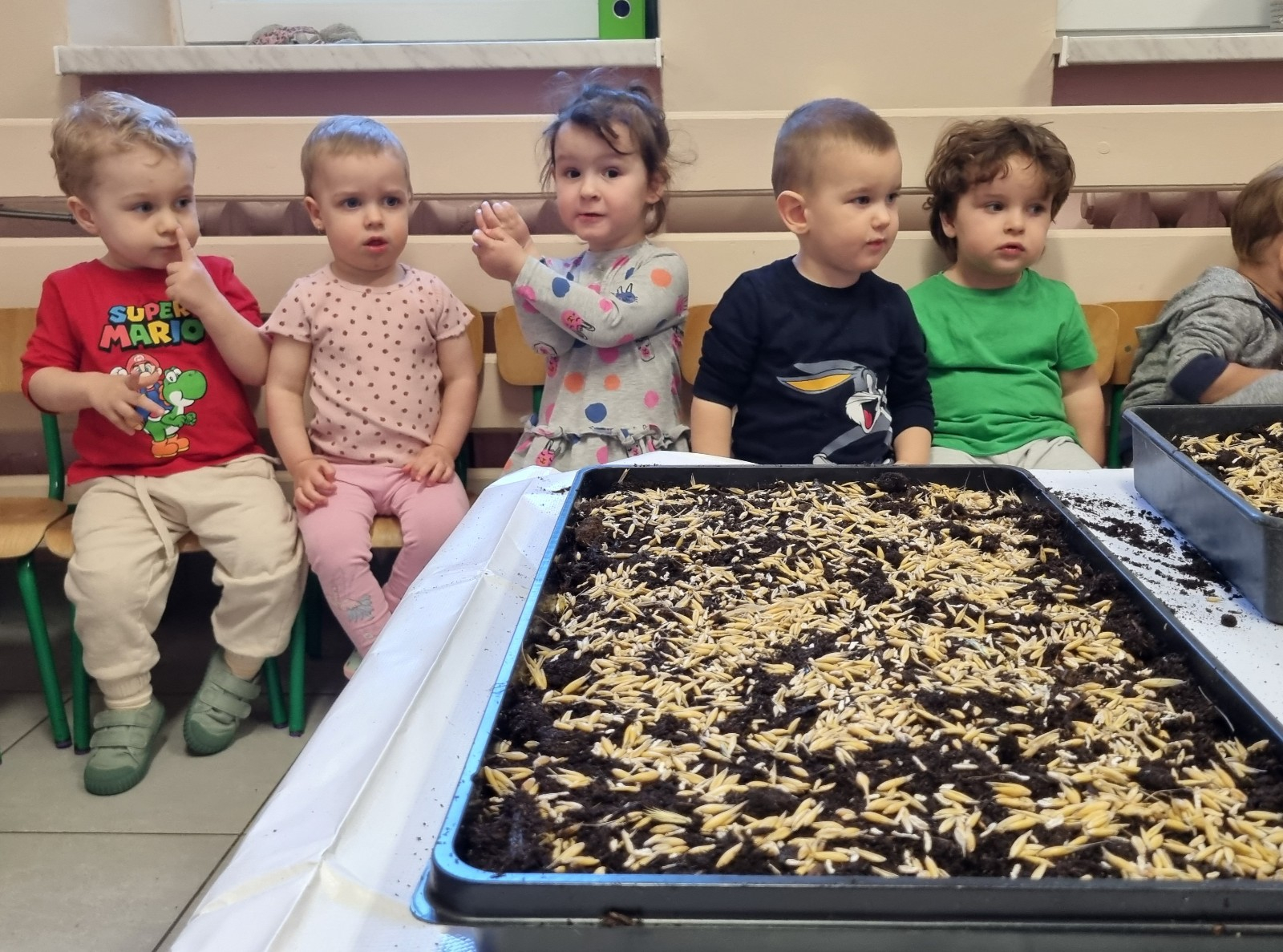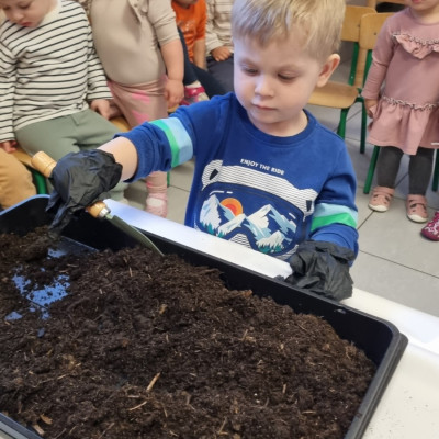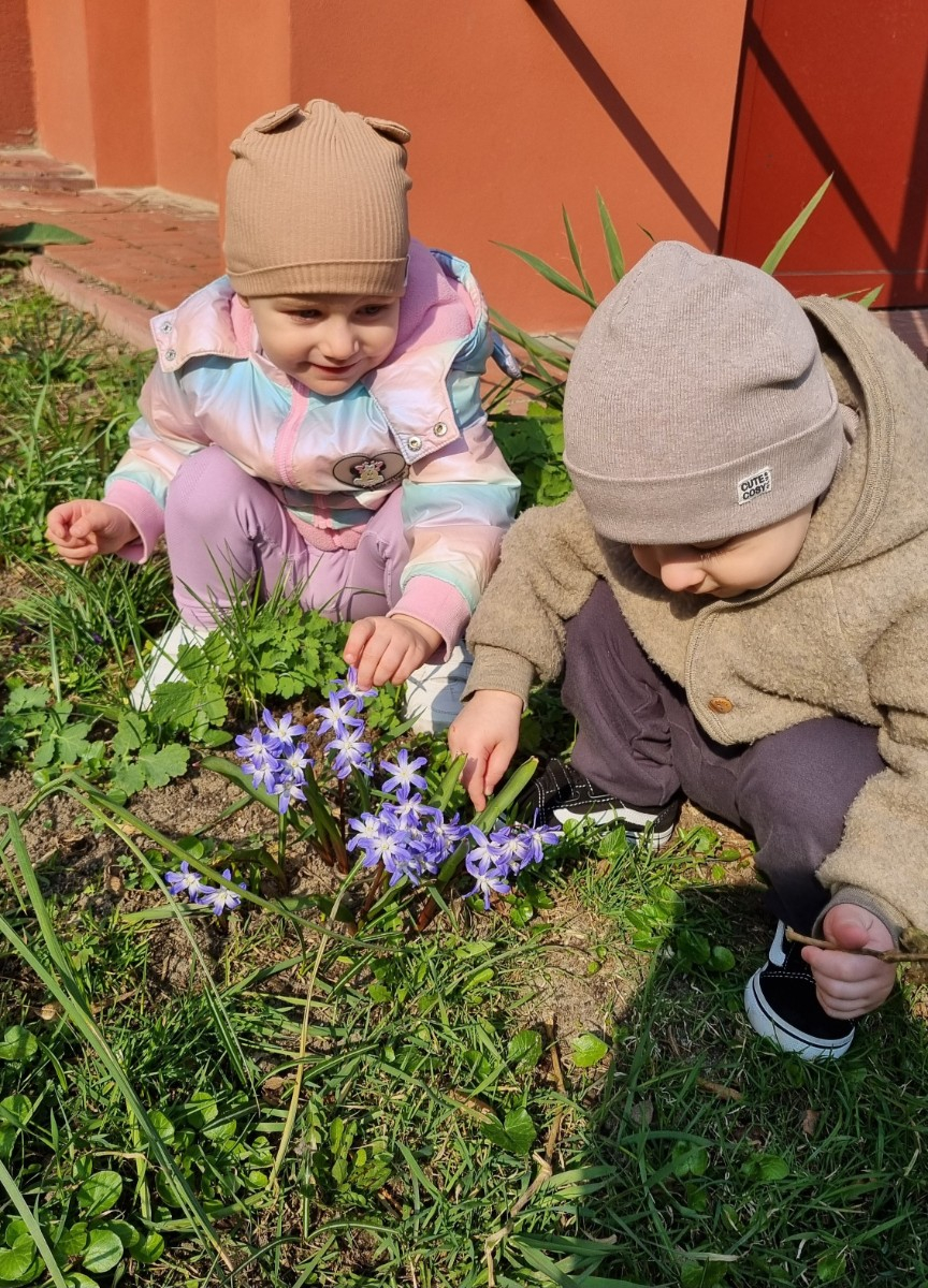 Dzisiaj Biedroneczki wybrały się na spacer w poszukiwaniu wiosny. Na trawie zobaczyliśmy pierwsze kwiatki. Słyszeliśmy też ptaki, które pięknie śpiewały. Wiosna powoli do nas przychodzi. Maluszki wykonały również pracę plastyczną i zasiały owies.