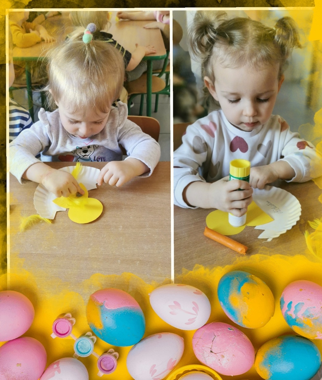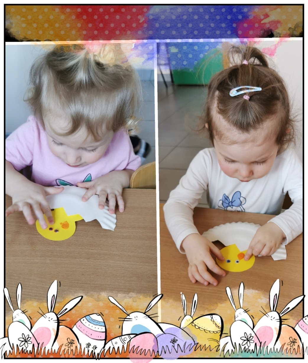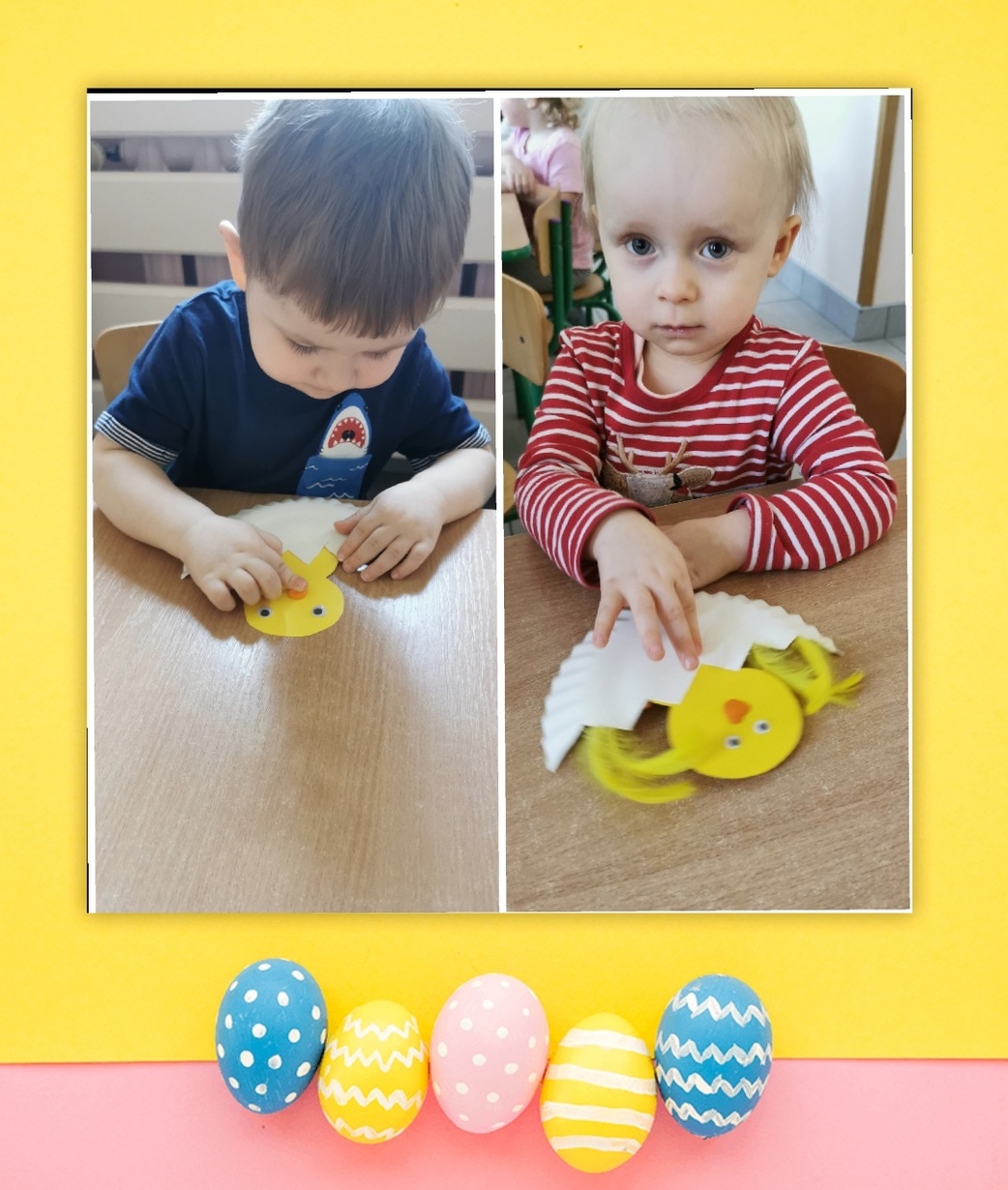 Nasze Biedronki rozpoczęły przygotowania do Świąt Wielkiej Nocy. Stworzyliśmy piękne prace nawiązujące do Wielkanocy, przedstawiające milutkie kurczaczki w skorupce jajka. Dzieci z zapałem i radością zabrały się do wykonywania prac: przyklejały kurczakom oczka, robiły dziobki z plasteliny a na koniec ozdabiały je puszystymi piórkami. Nasze dzieła można podziwiać w galerii zdjęć oraz w żłobkowym korytarzu, gdzie zamieszczone są na tablicy.
