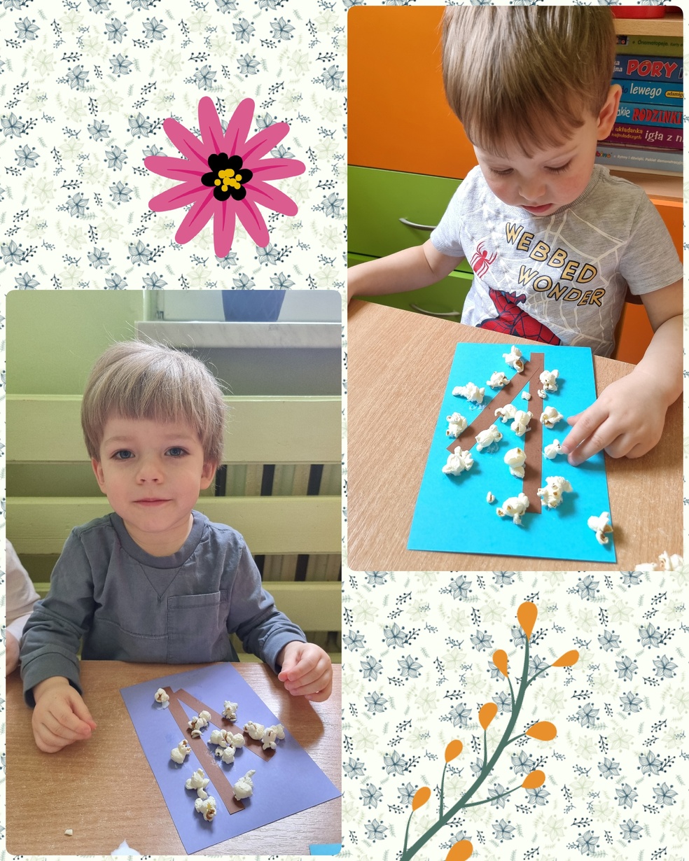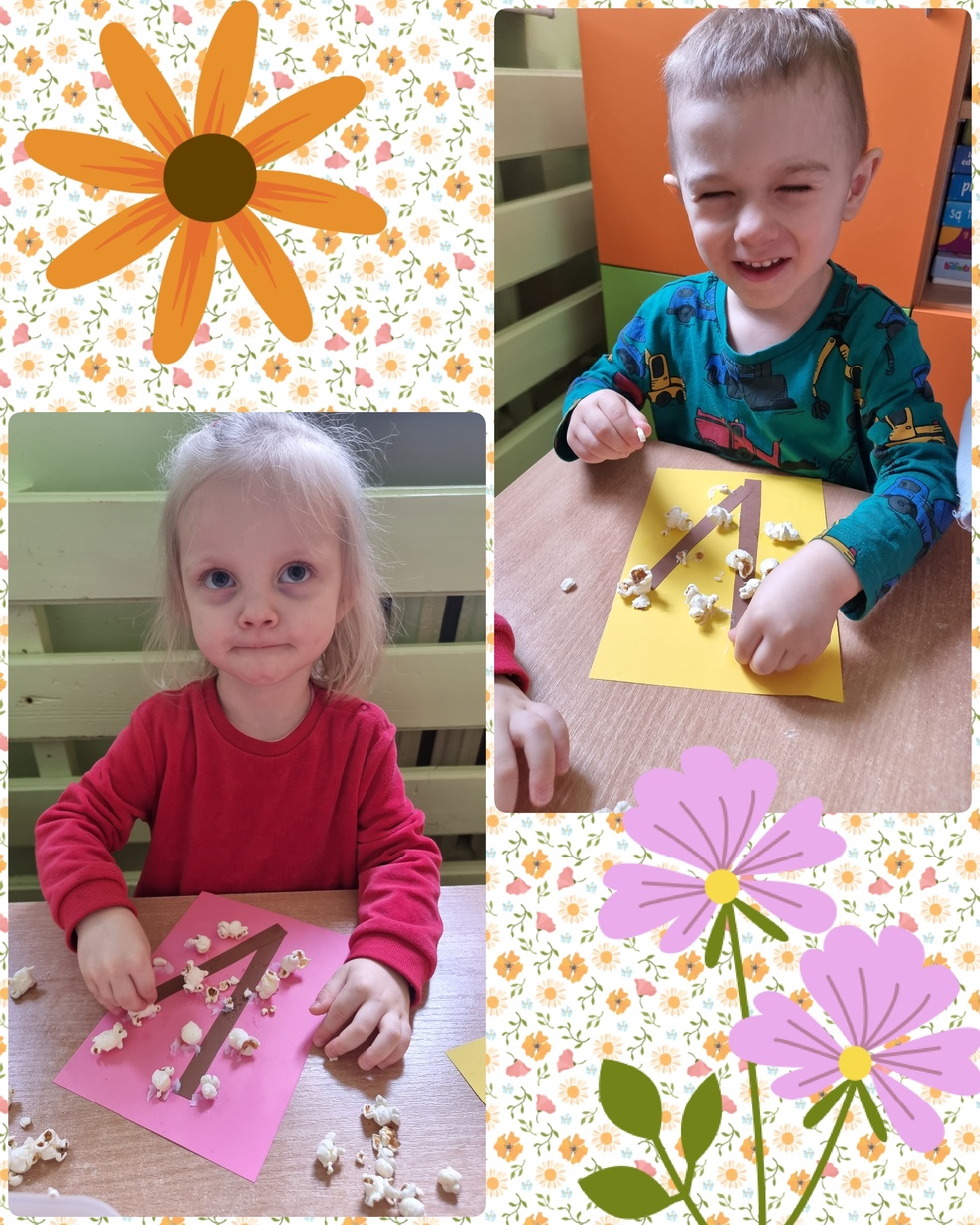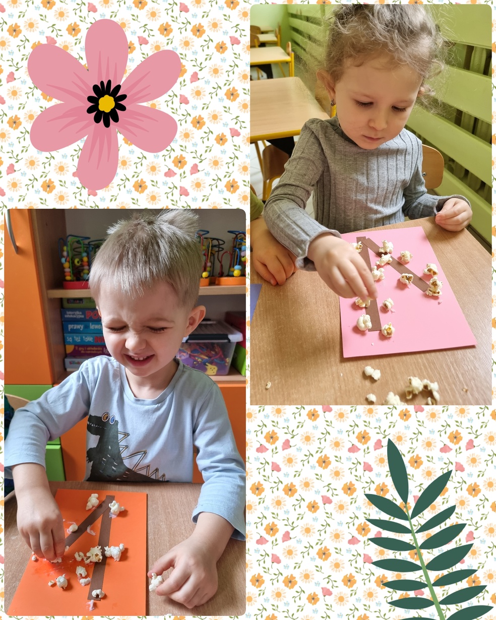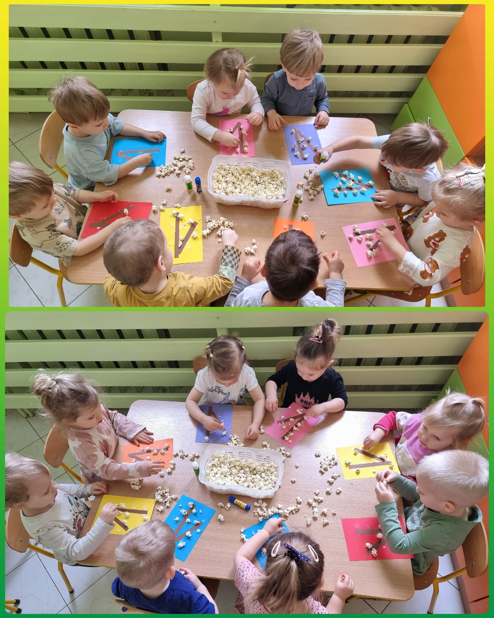 (Na kolorowej kartce papieru przyklejały klejem popcorn ).