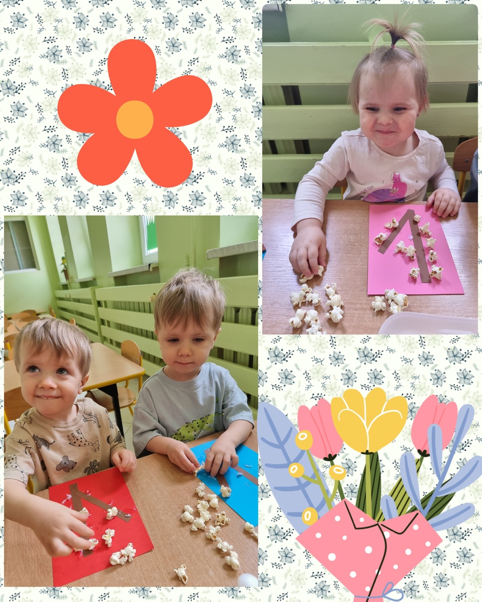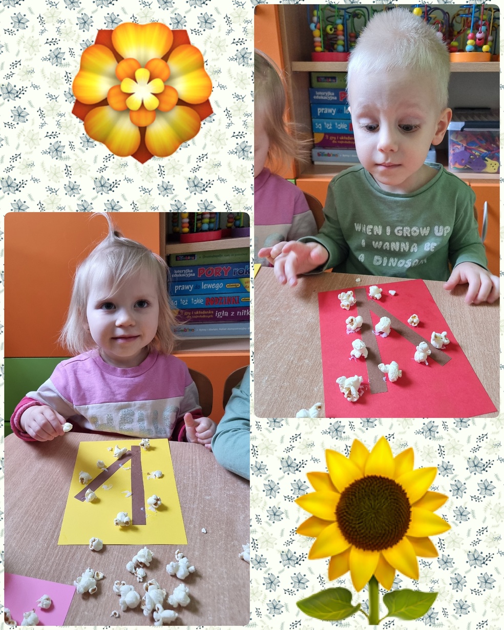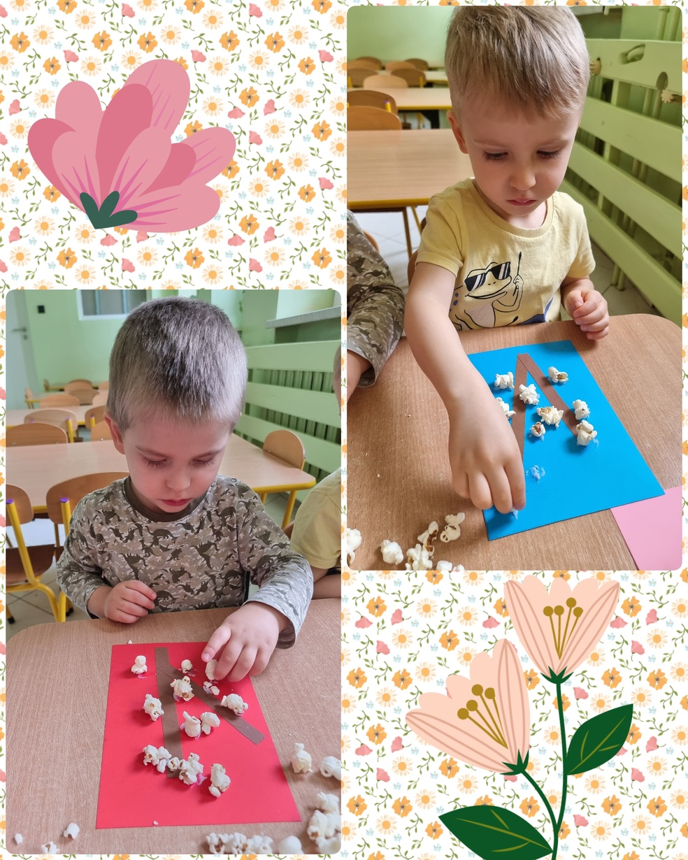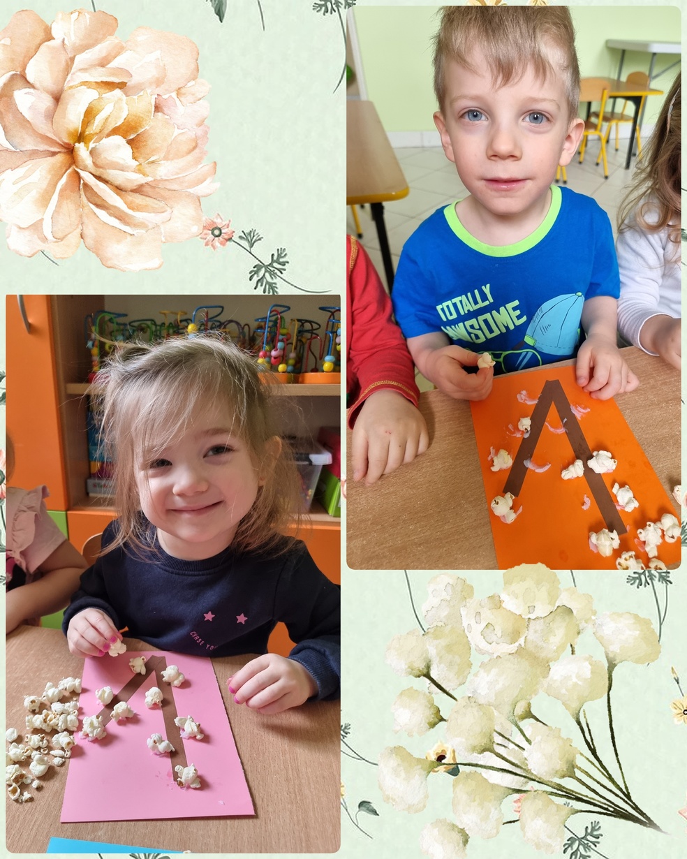 (Na kolorowej kartce papieru przyklejały klejem popcorn ).
