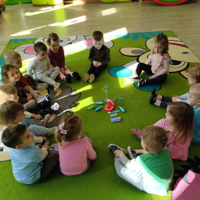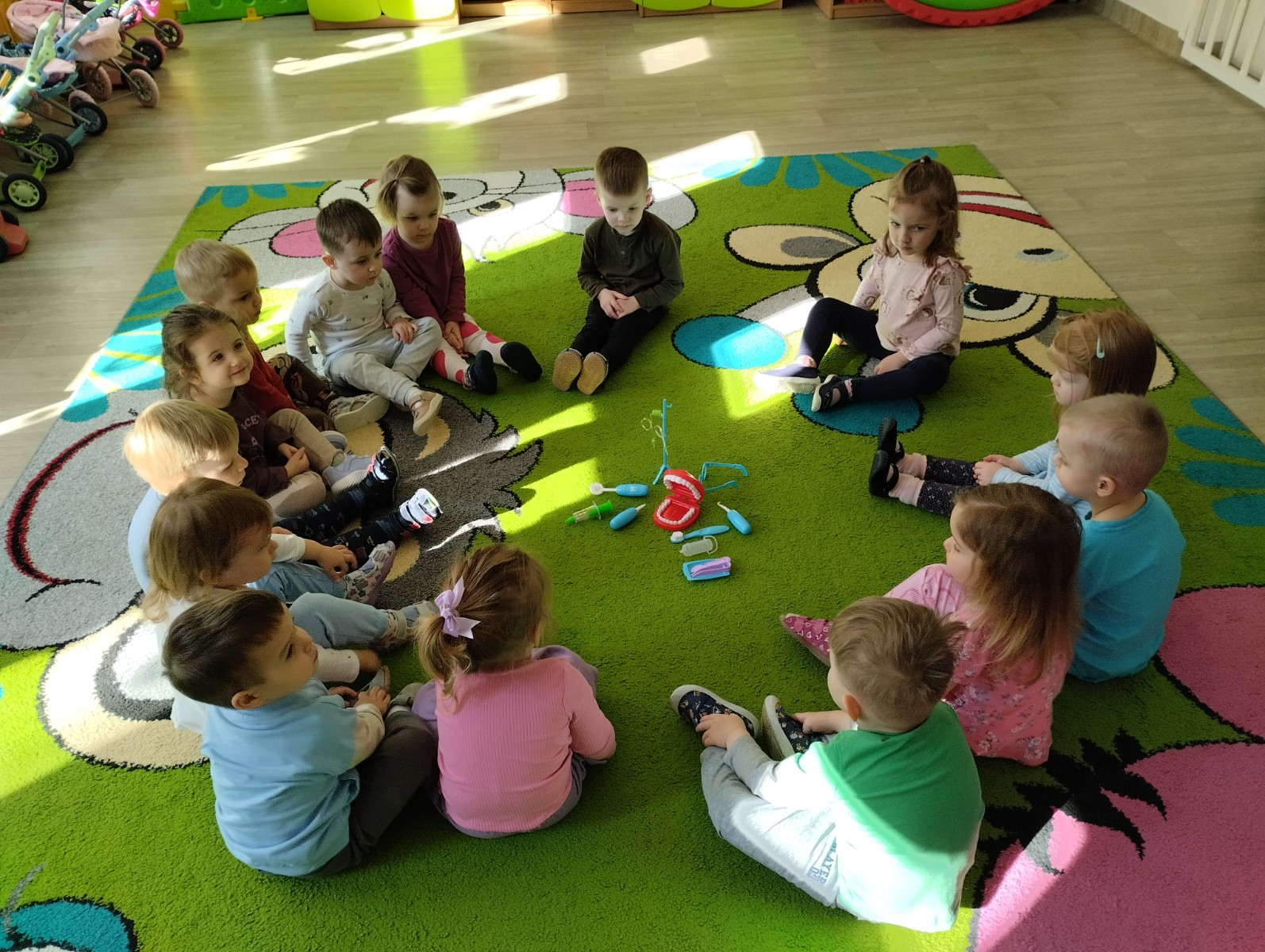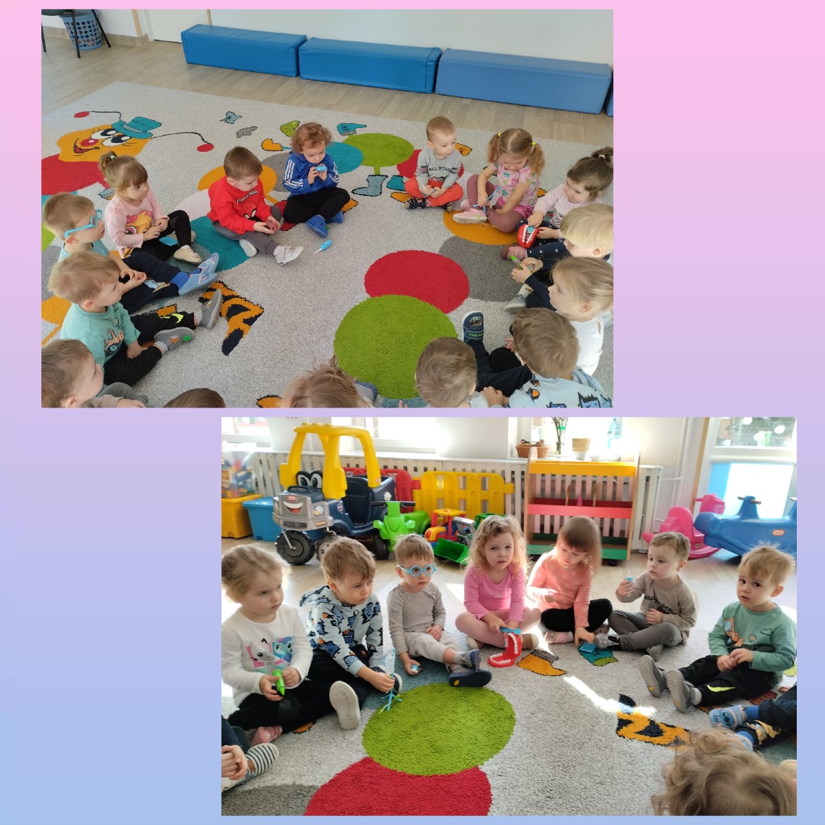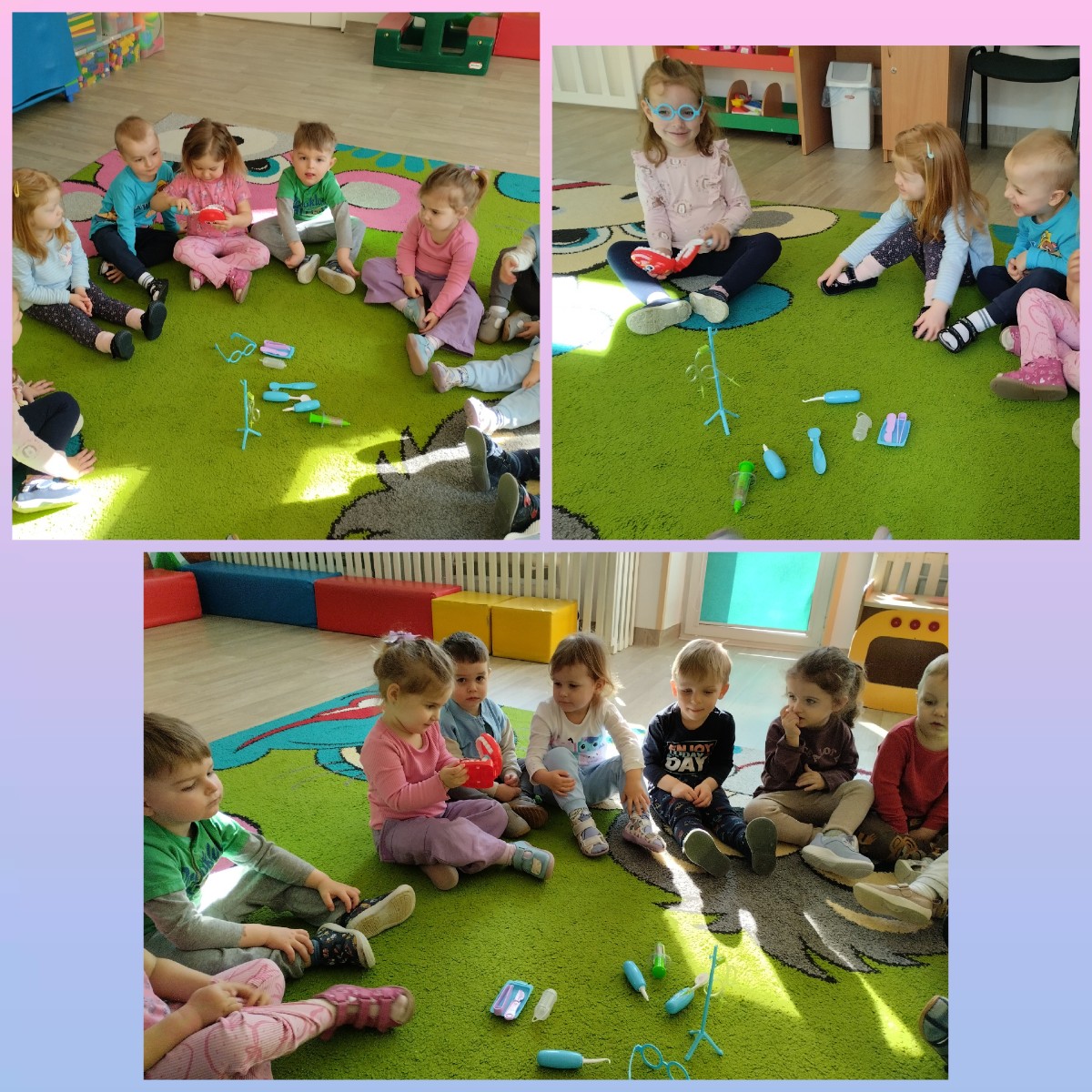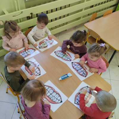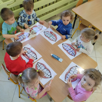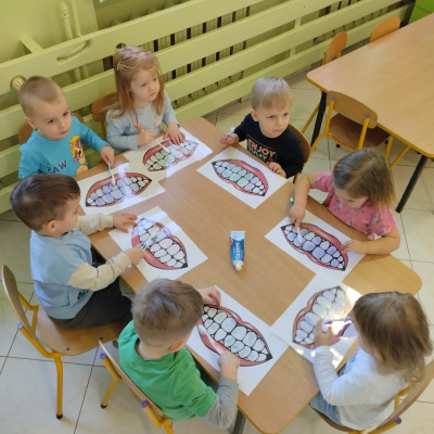 Dzieci z ciekawością oglądały szczoteczki, pasty i inne akcesoria do mycia ząbków. Uczyły się prawidłowego szczotkowania. Zajęcia miały na celu oswojenie dzieci z wizytą u dentysty i promowanie codziennej higieny jamy ustnej.