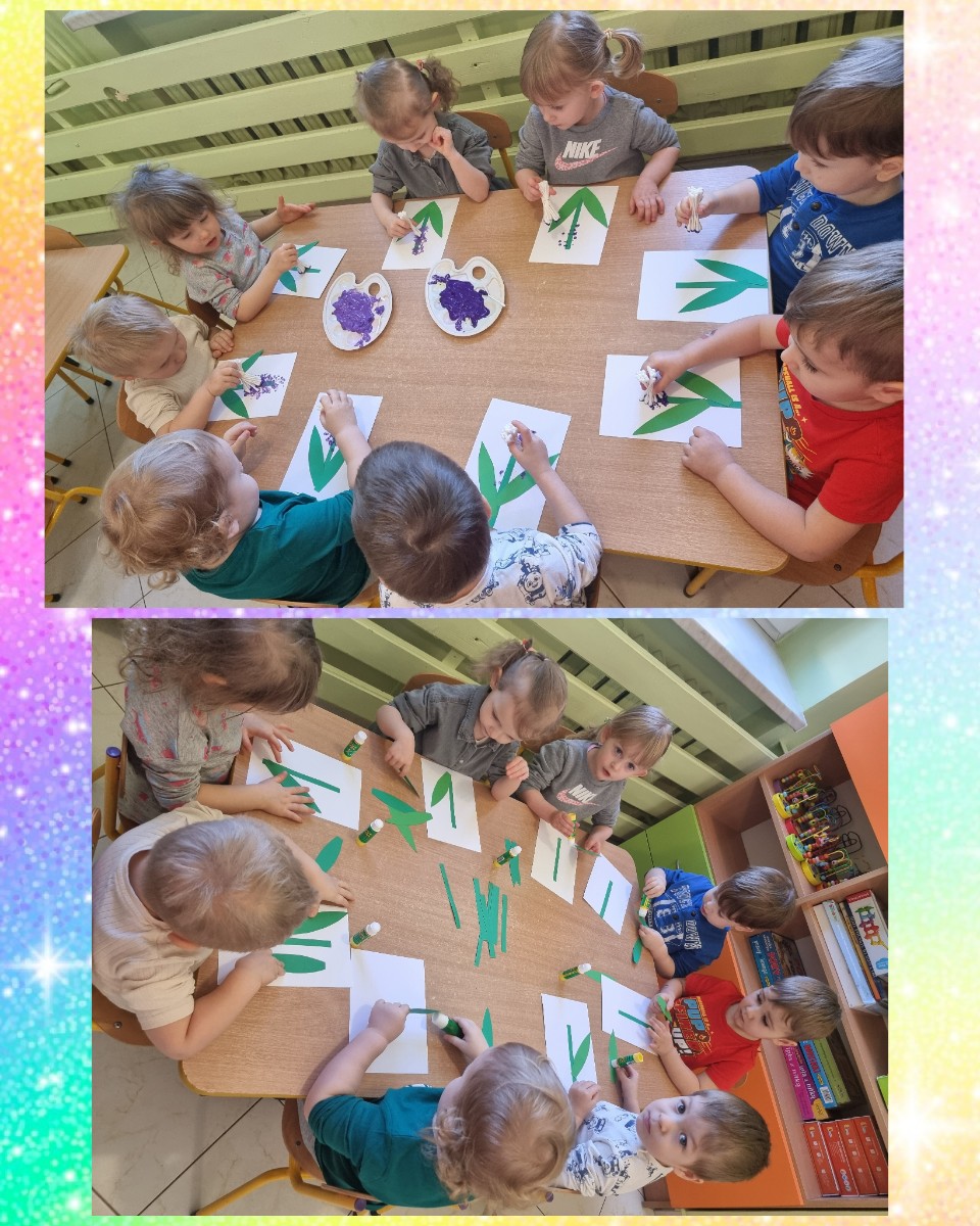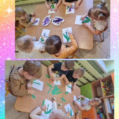 Najpierw dzieci przyklejały liście następnie patyczkami zamoczonymi w farbie odbijały kwiatki.