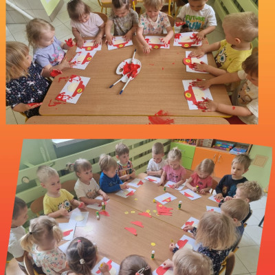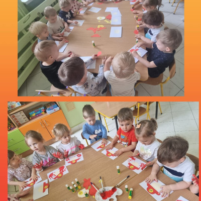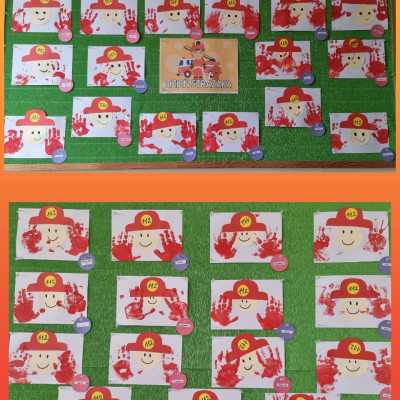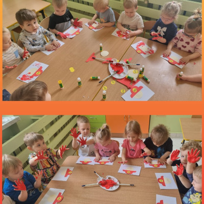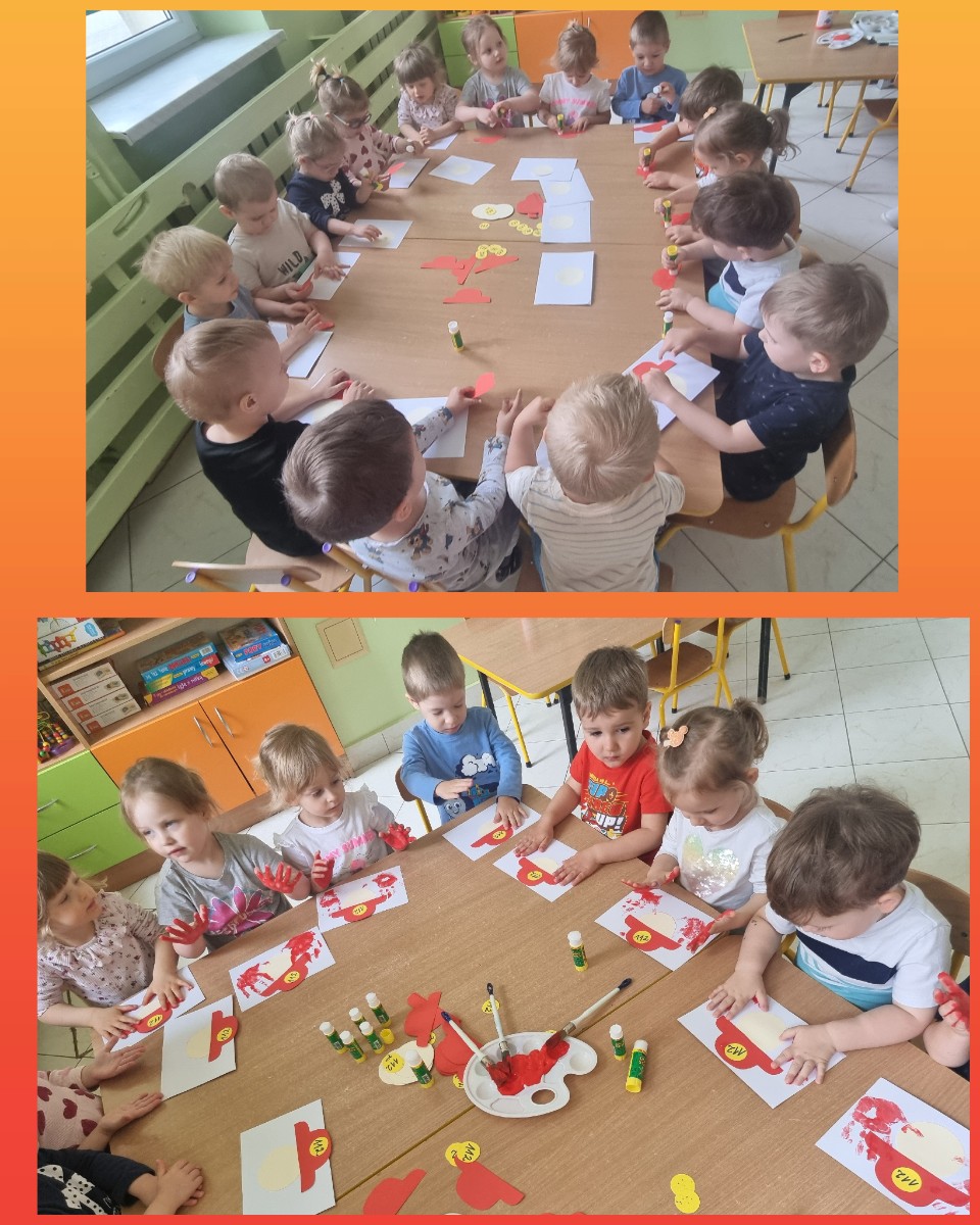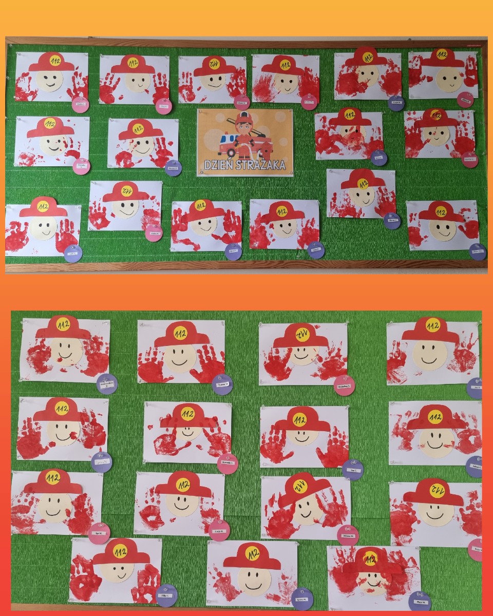 Uhonorowaniem dzisiejszego dnia dzieci wykonały  swojego strażaka  przyklejając głowę, kask następnie odbijaliśmy swoję rączki .