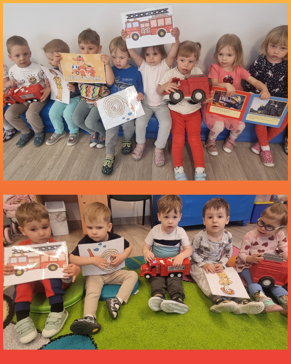 Zdjęcia przedstawiają dzieci świętujące Dzień Strażaka.