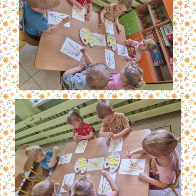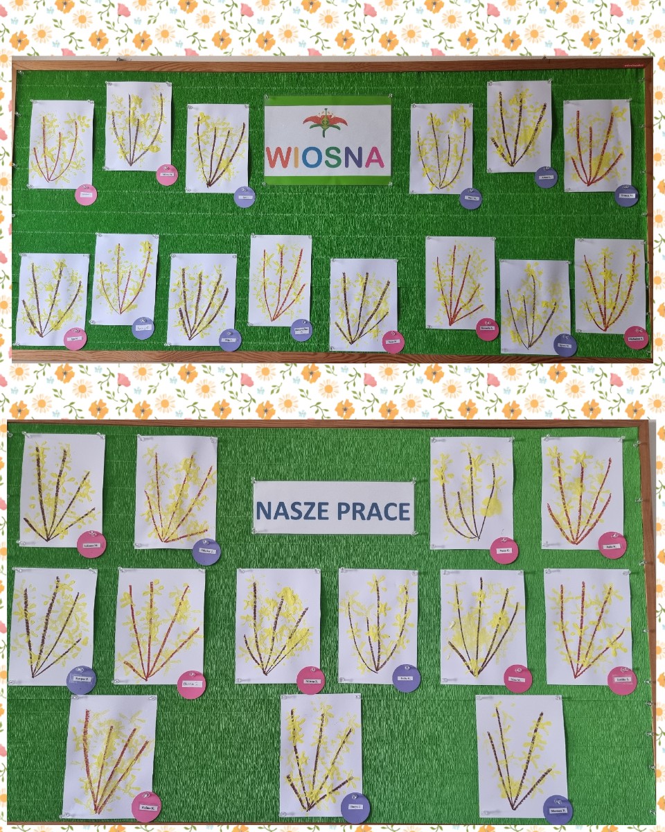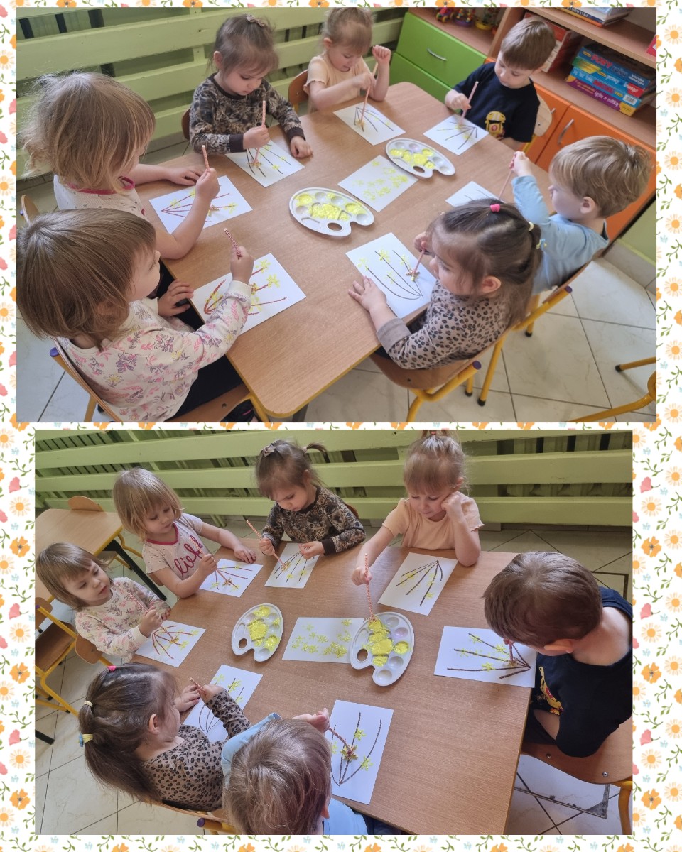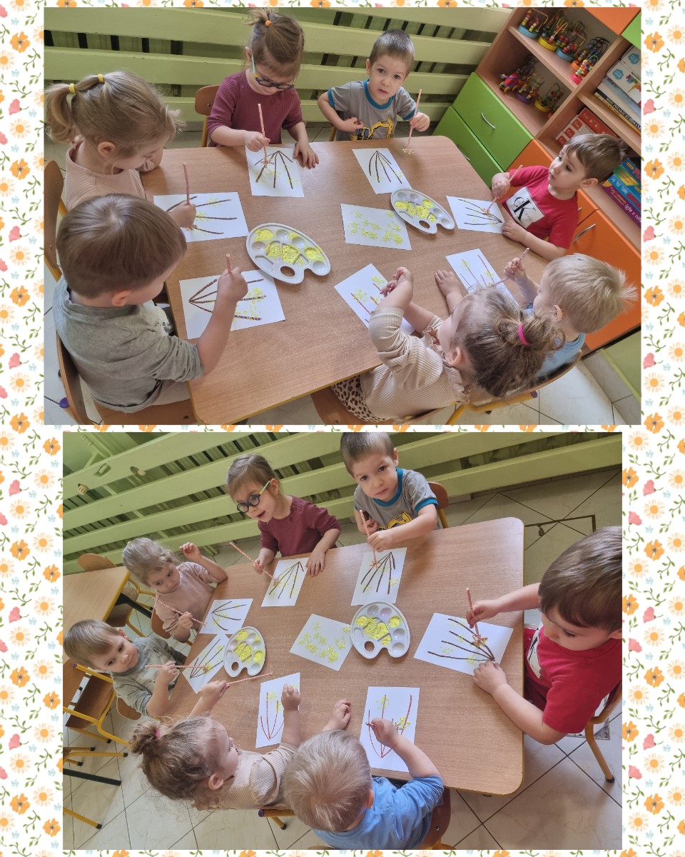 Nasze  Żabki ćwicząc motorykę małą i sprawność rączek, namalowały piękne forsycje używając słomek i farby.
