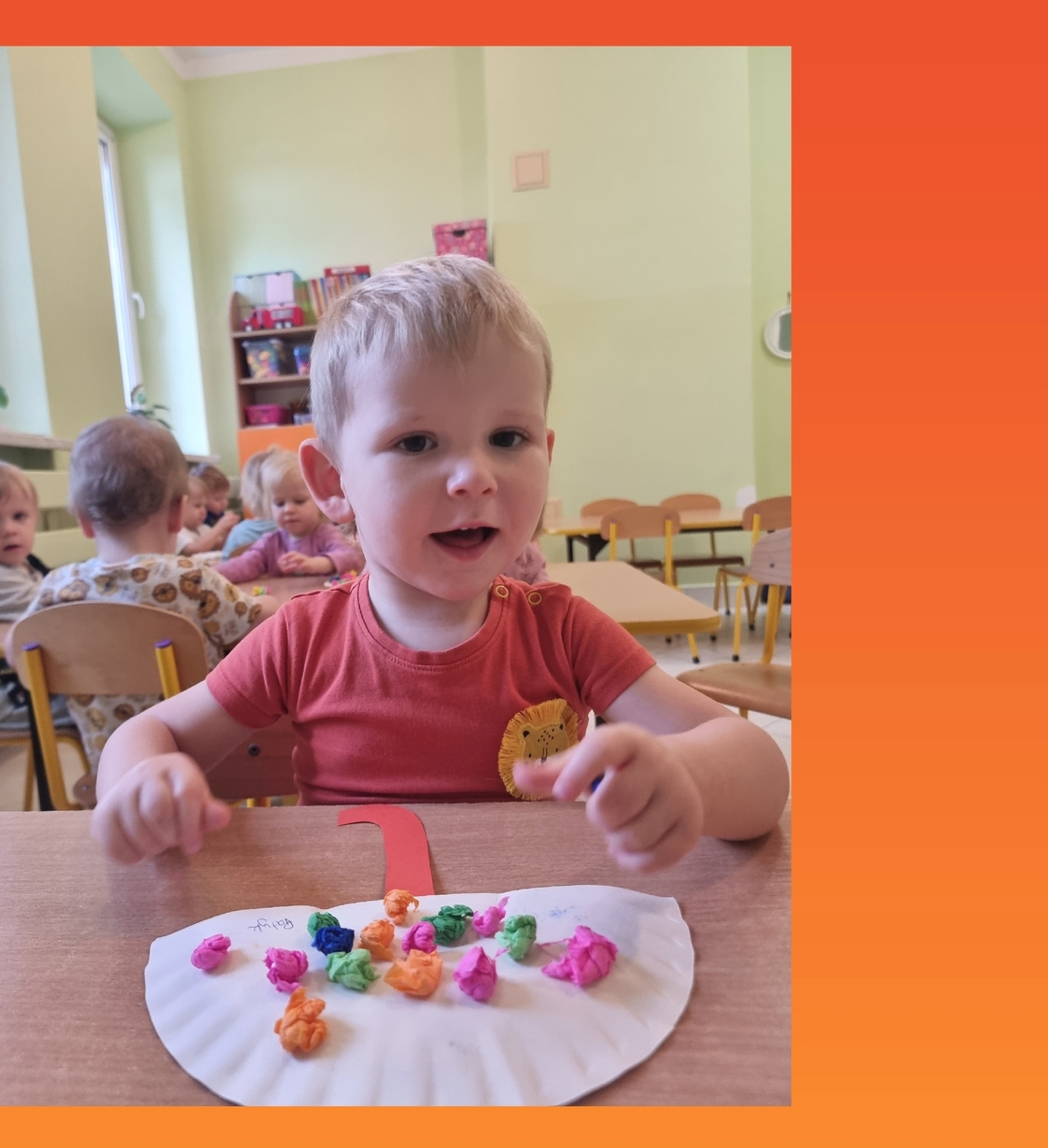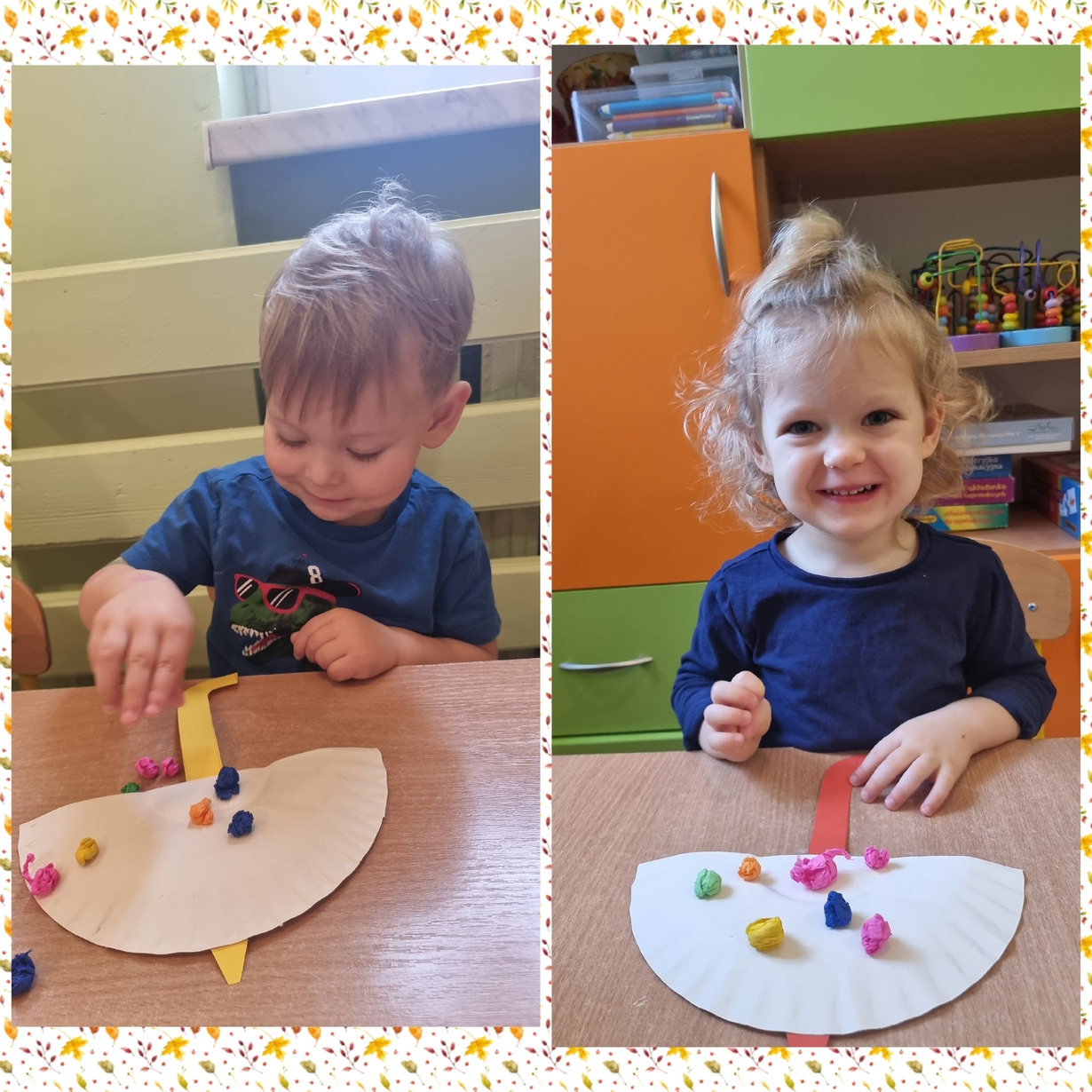 Następnie każde dziecko z wielkim zainteresowaniem i skupieniem przyklejało bibułkę na parasol. Na sali zrobiło się wesoło.
