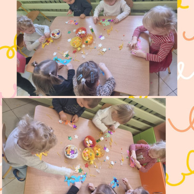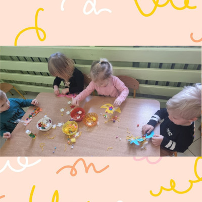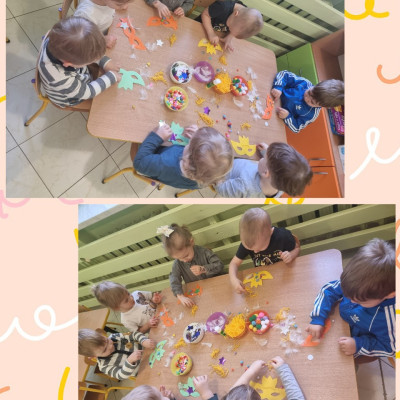 Zdjęcia przedstawiają dzieci wykonujące prace plastyczną.