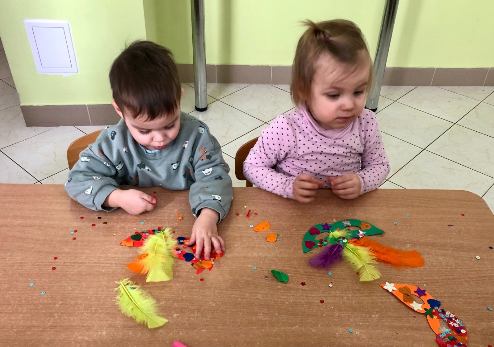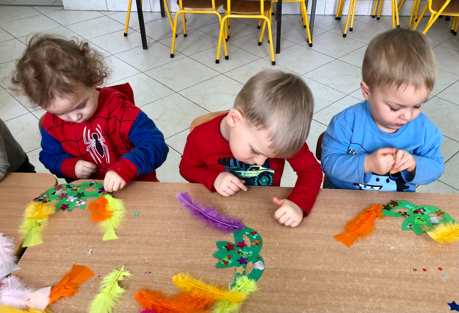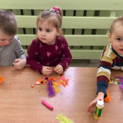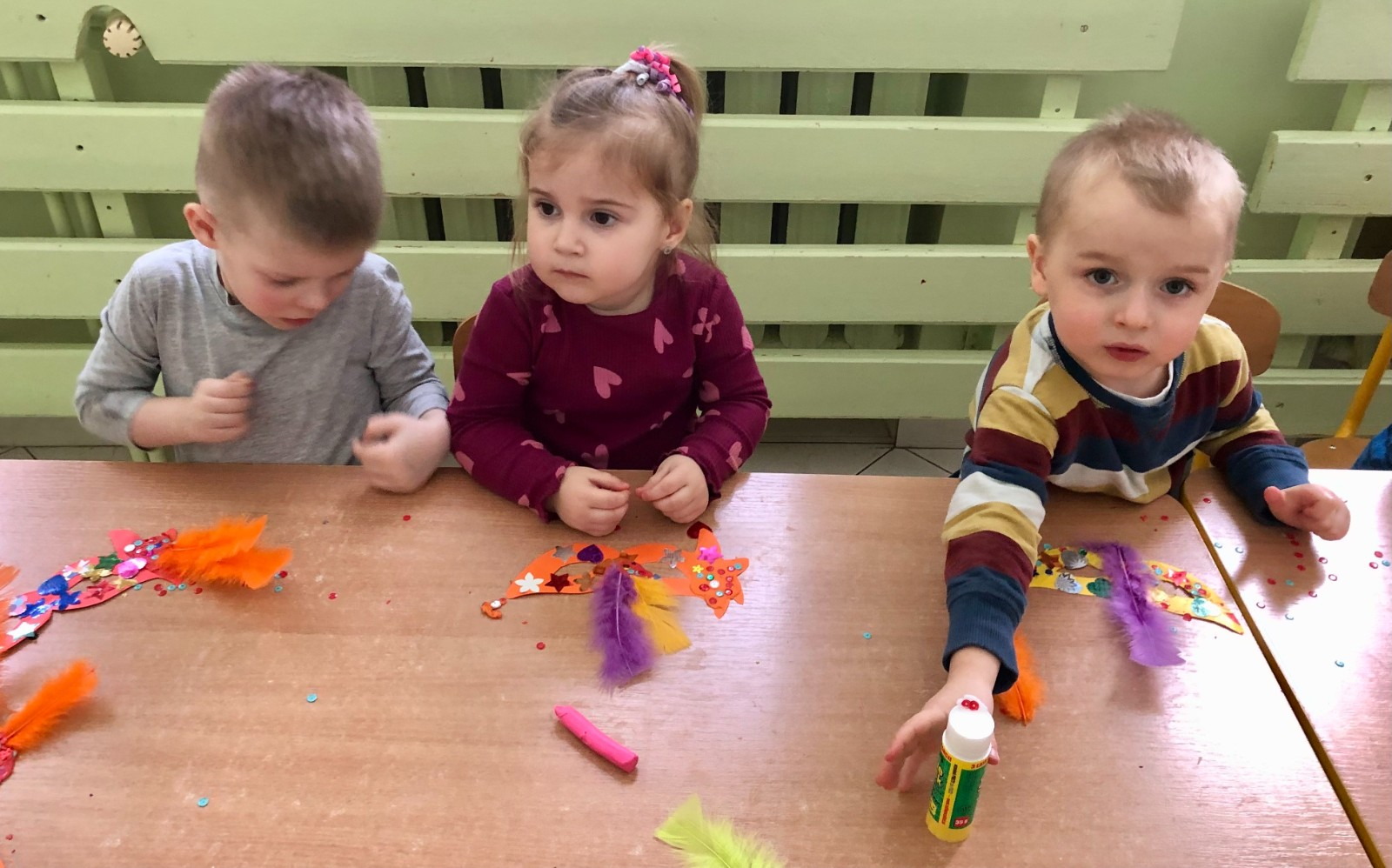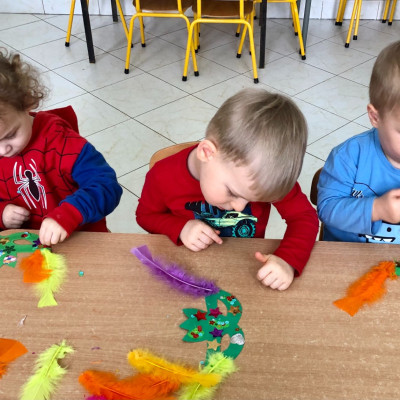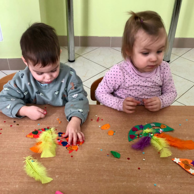 Do dyspozycji miały kolorowe piórka, papierowe kształty (kółeczka, gwiazdki, kwiatki i serduszka) oraz błyszczące cekiny.