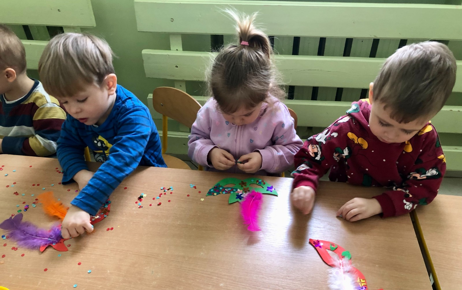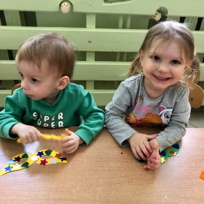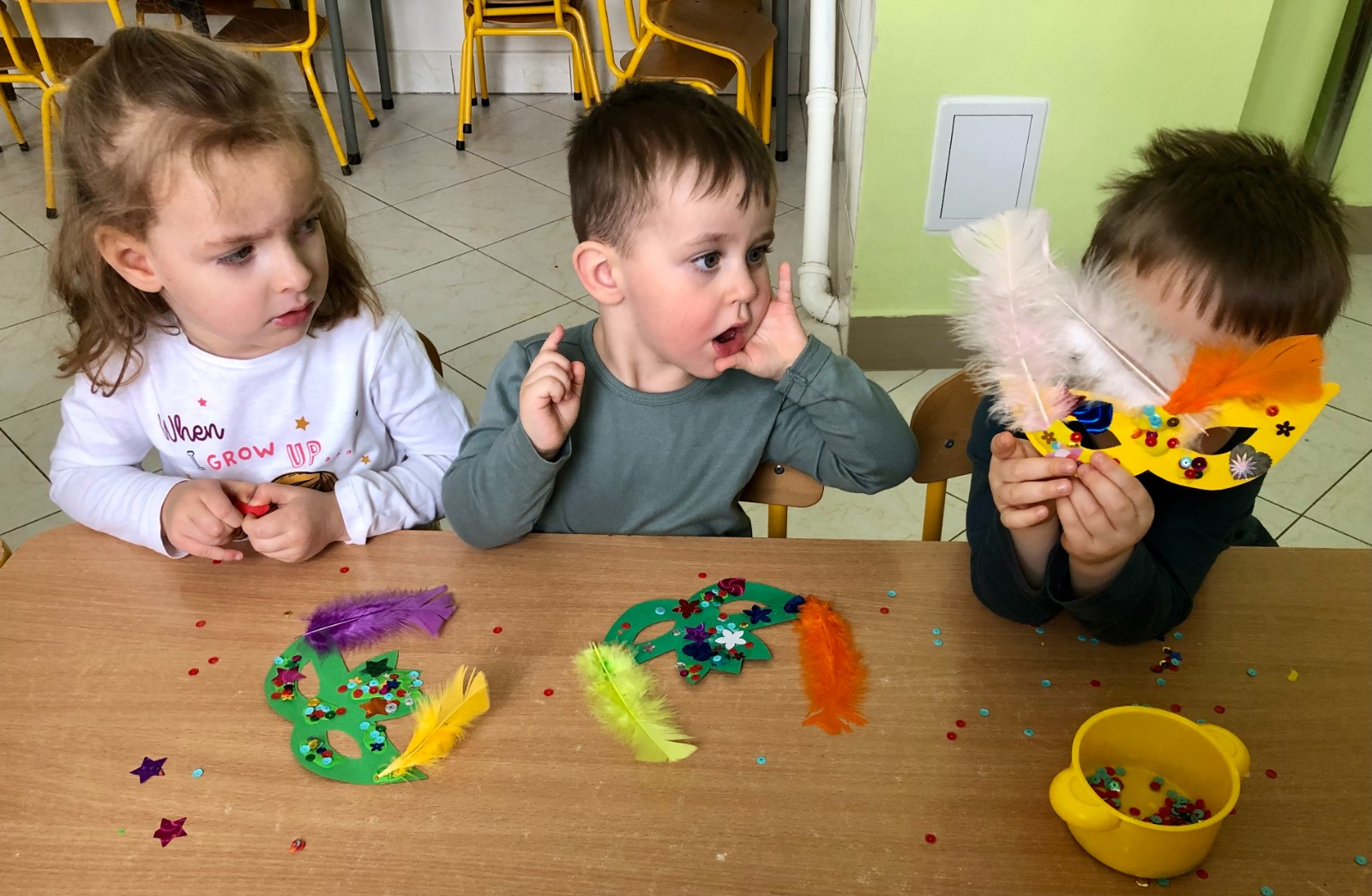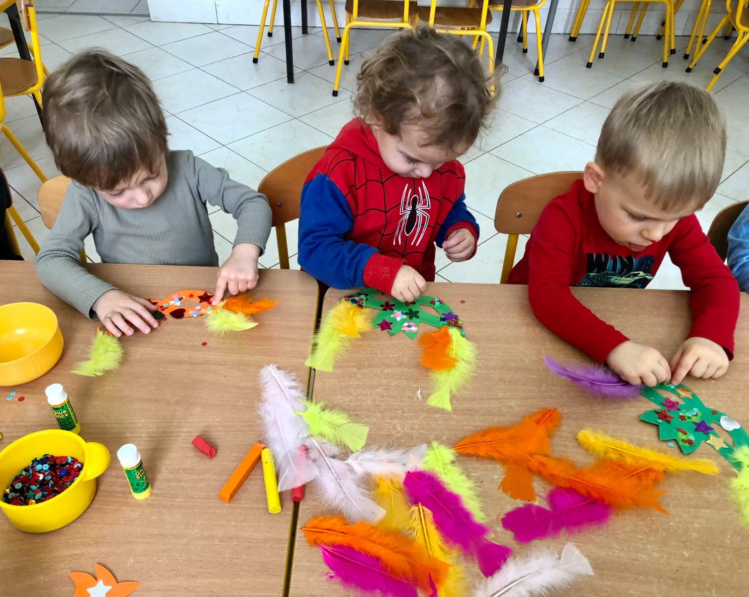 Do dyspozycji miały kolorowe piórka, papierowe kształty (kółeczka, gwiazdki, kwiatki i serduszka) oraz błyszczące cekiny.