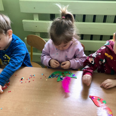 Dzieci podczas dzisiejszych zajęć plastycznych miały okazję własnoręcznie ozdobić maski karnawałowe.