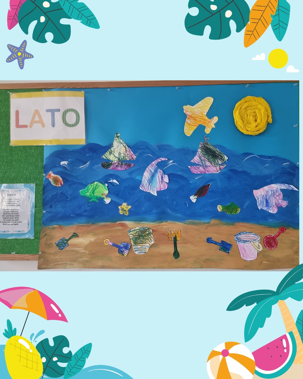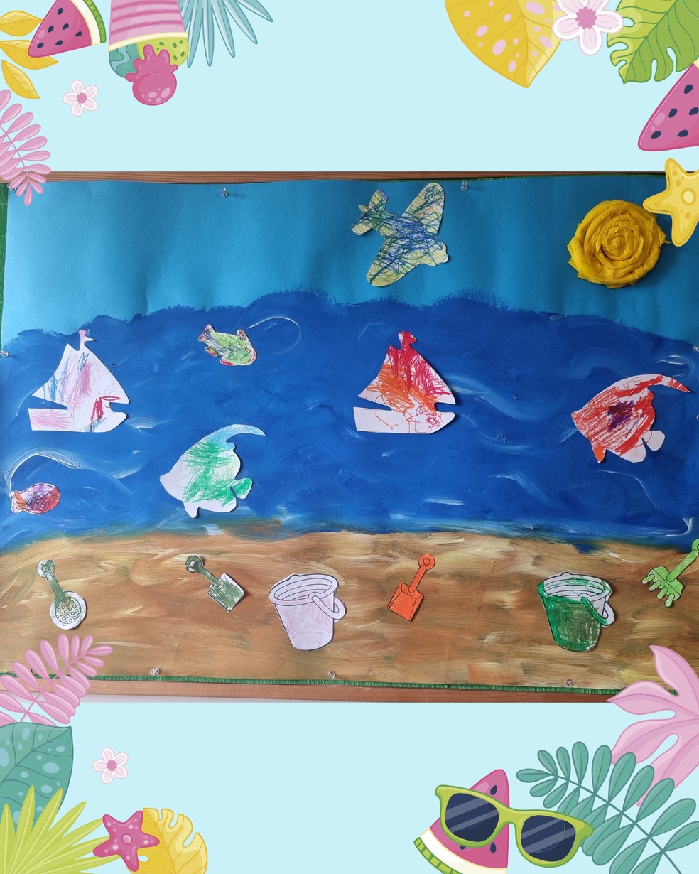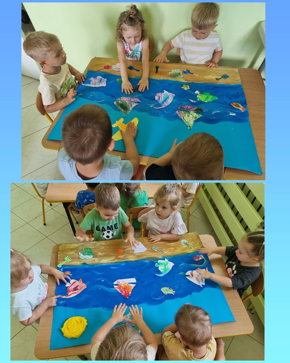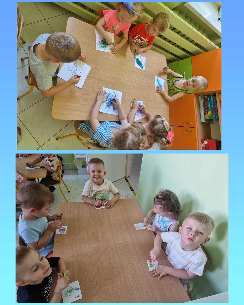Dzieci z grupy żabek odśpiewały piosenkę " lato ,lato " a następnie wykolorowały obrazki o tematyce morza puźniej  przykleiły obrazki na namalowany obraz przez ciocie .