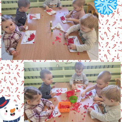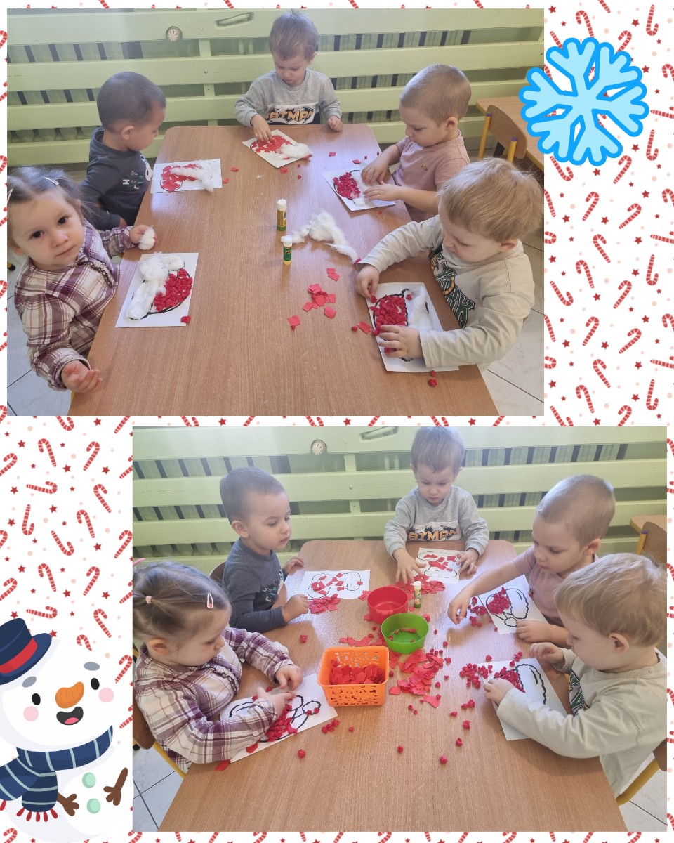 Kuleczki z czerwonej bibuły dzieci naklejały na szablon wykorzystaliśmy także watę by ocieplić nasze buty i czapki .
