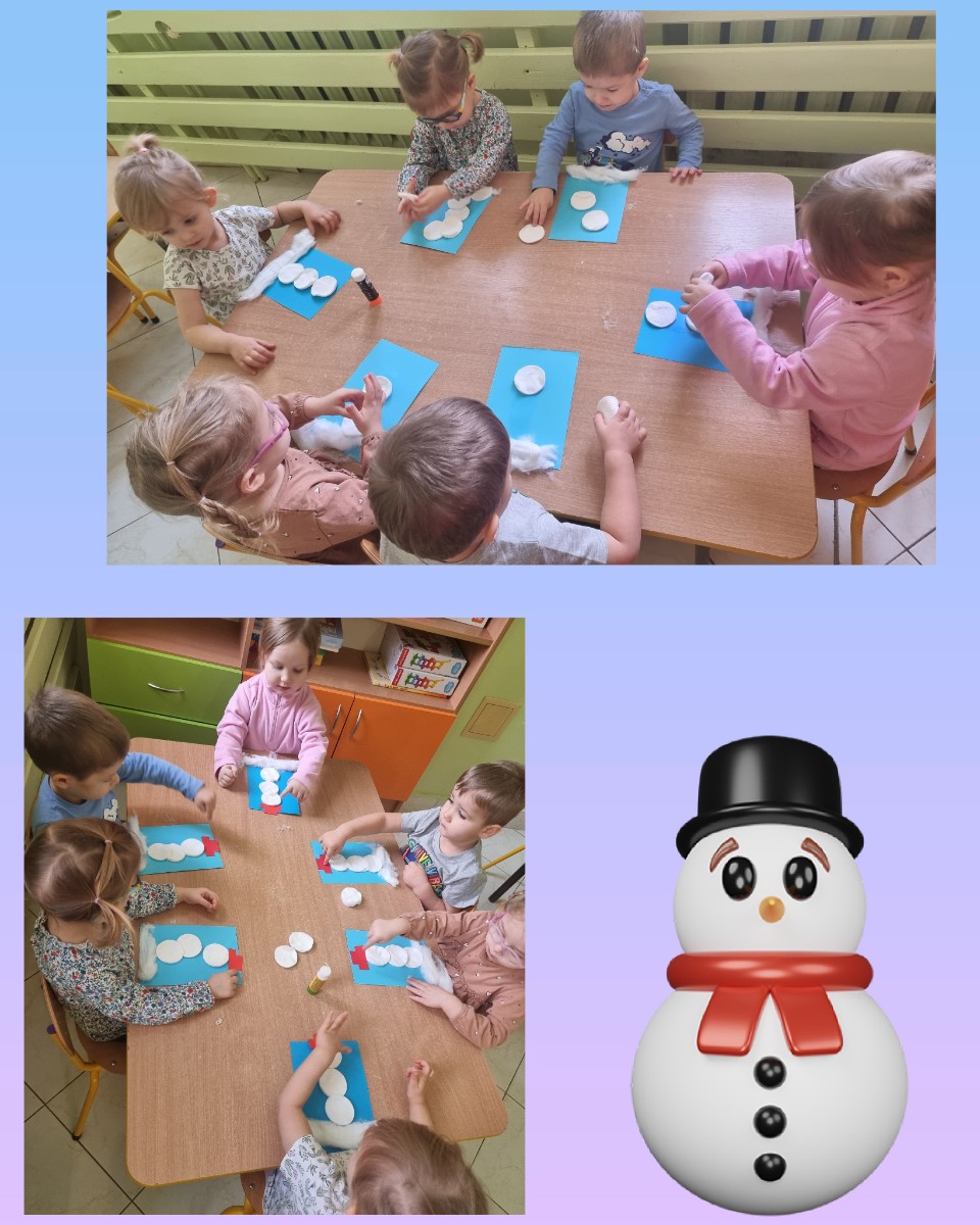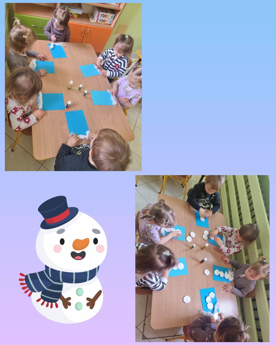 Każde dziecko w wielkim skupieniu przyklejało waciki kosmetyczne ,czapeczki,watę tworząc zimowe bałwanki.