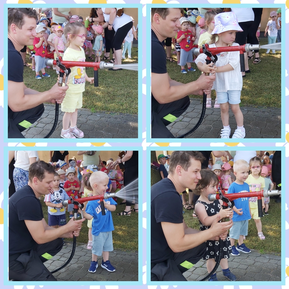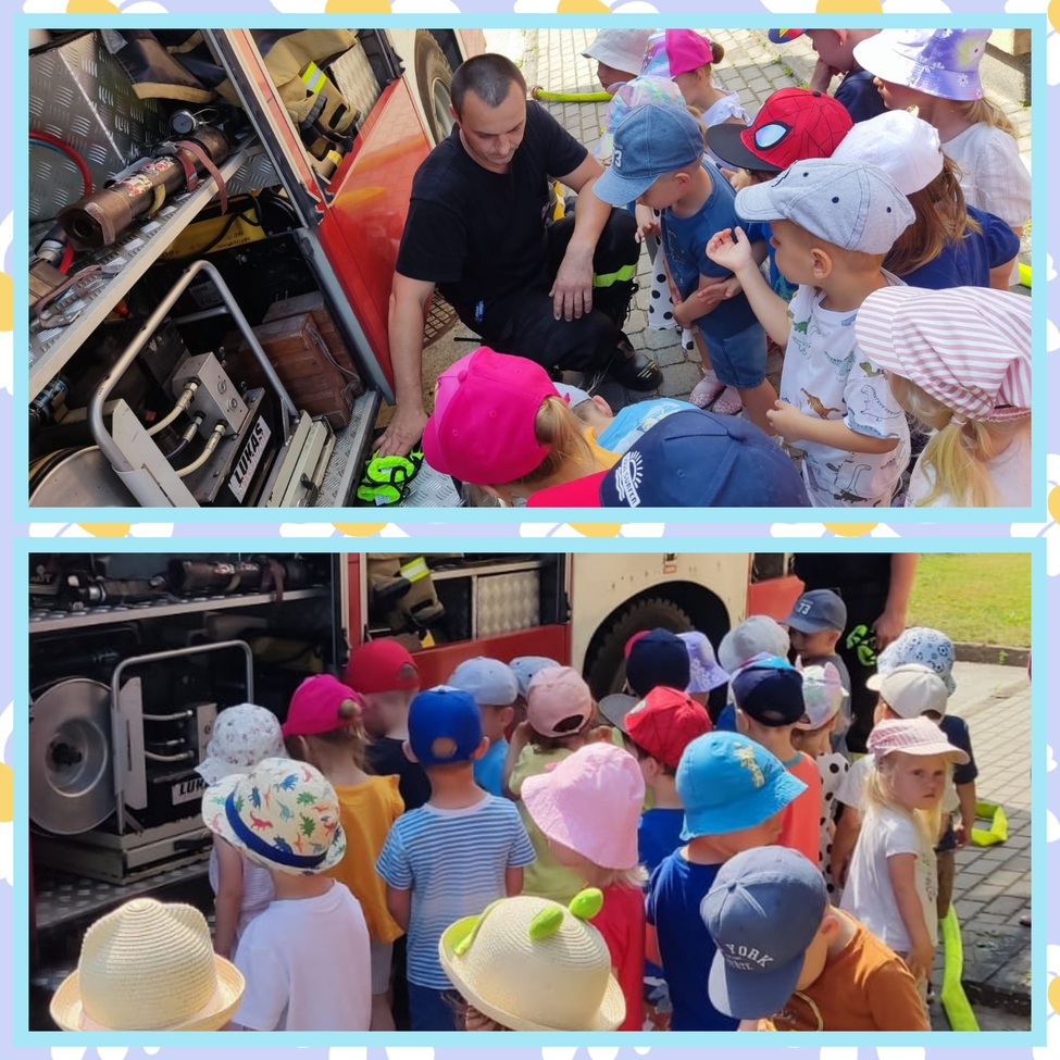Dzis w naszym zlobku odwiedzili nas strażacy, najodważniejsze dzieci mogły założyć hełm strażacki, przymierzyć rękawice, wezwać pomoc przez krótkofalówkę a nawet potrzymać strażackiego węża. Strażacy zaprezentowali dzieciom wyposażenie wozu oraz sygnał dźwiękowy i świetlny.