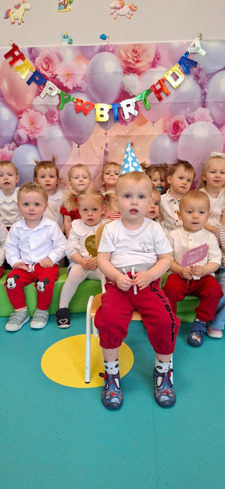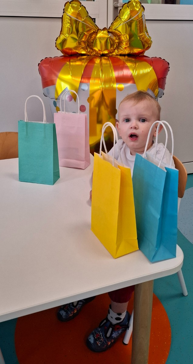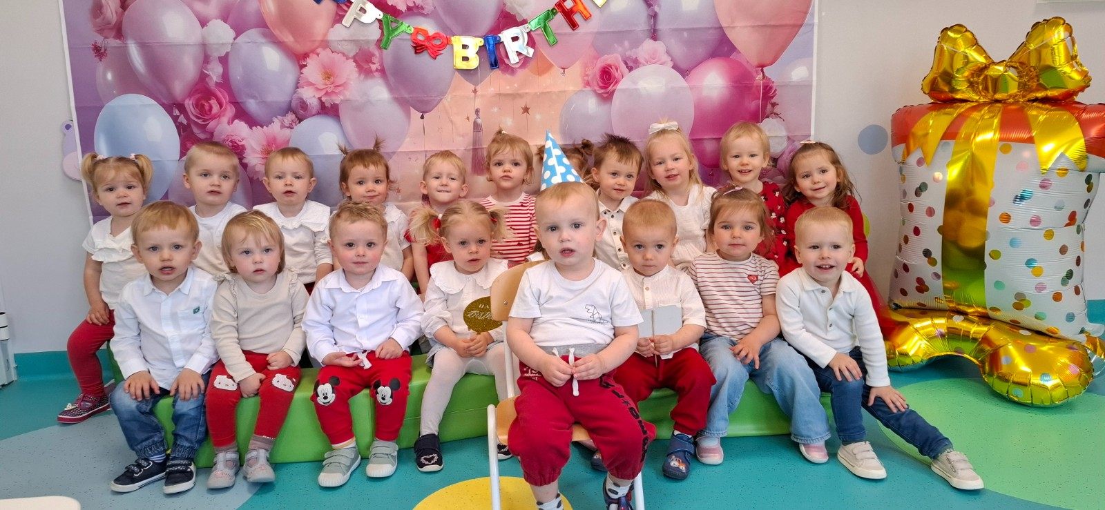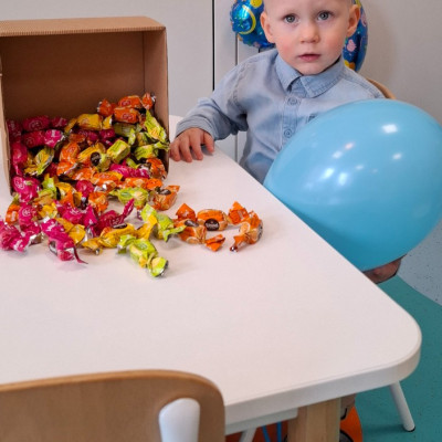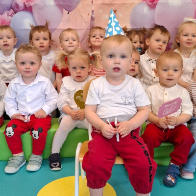 Zdjęcie przedstawia dzieci świętujące urodziny na grupie