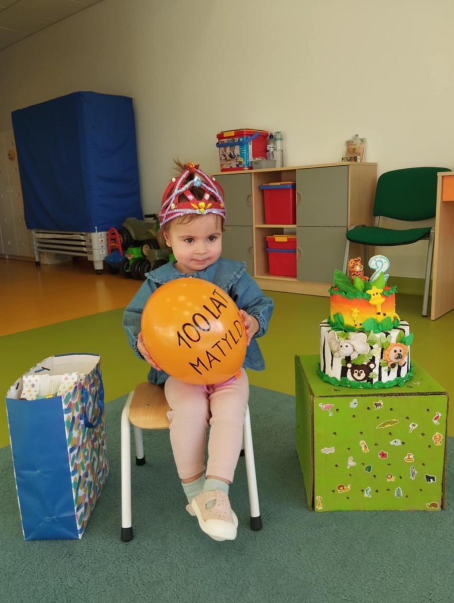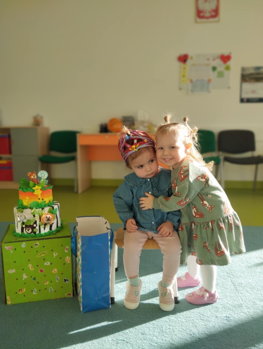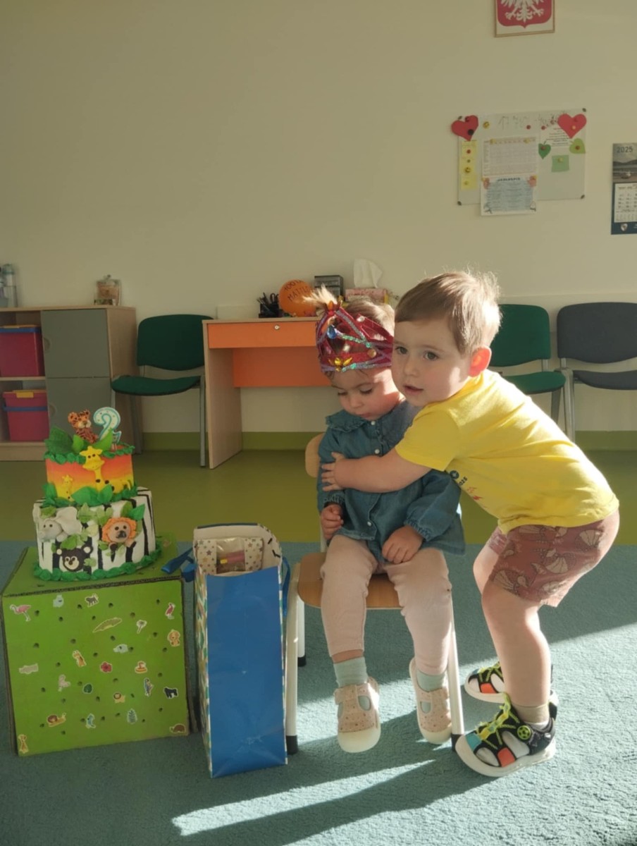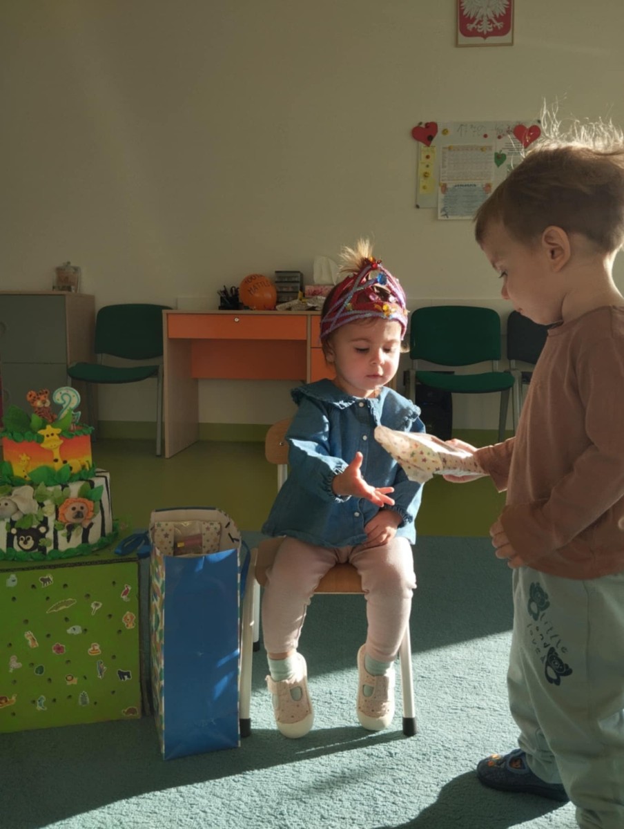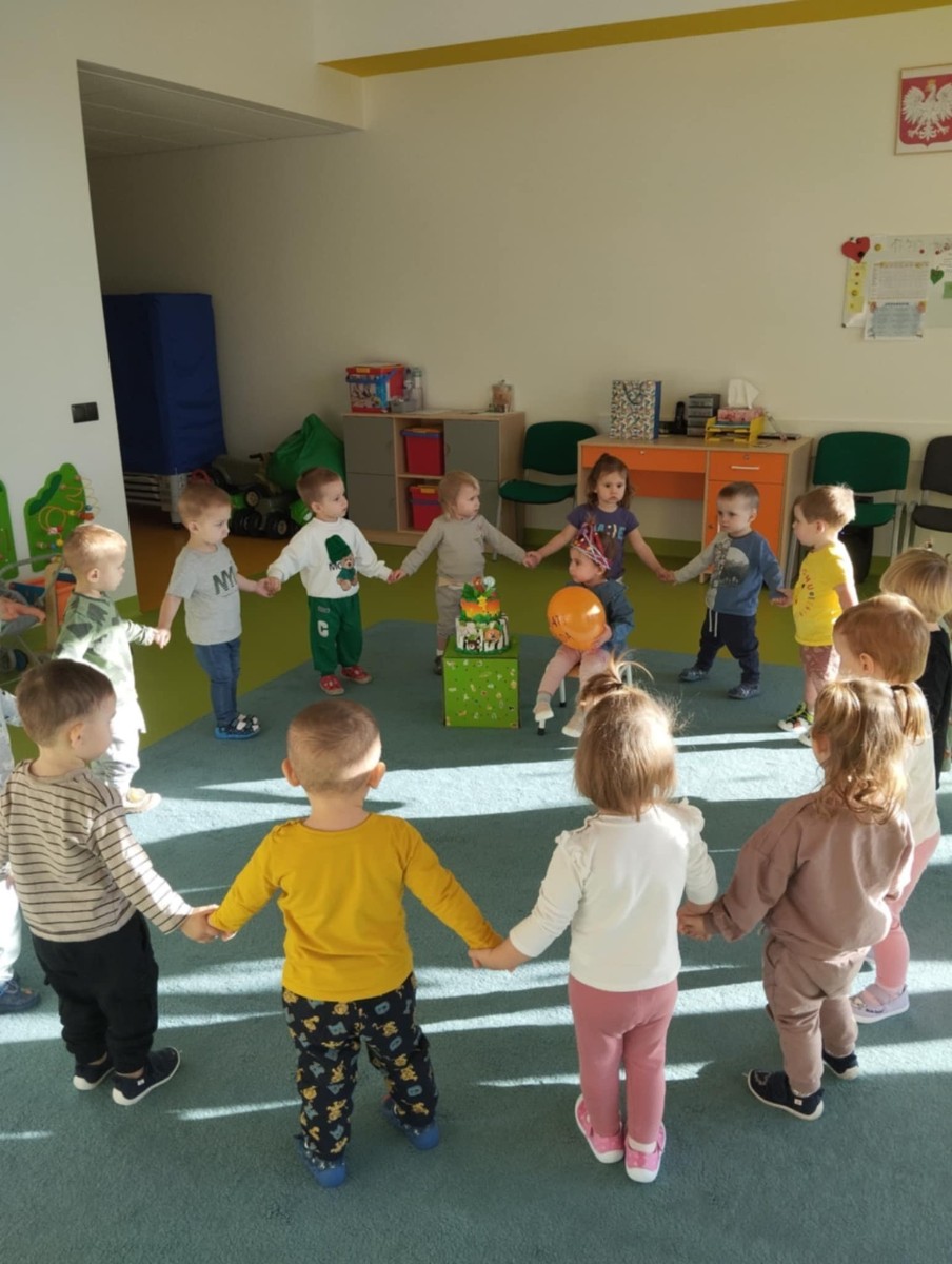 Zdjęcie przedstawia dzieci świętujące urodziny koleżanki z grupy