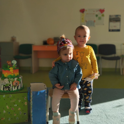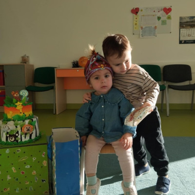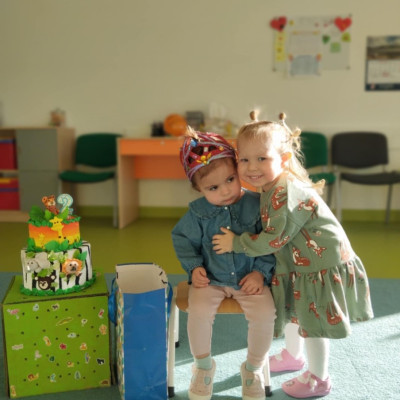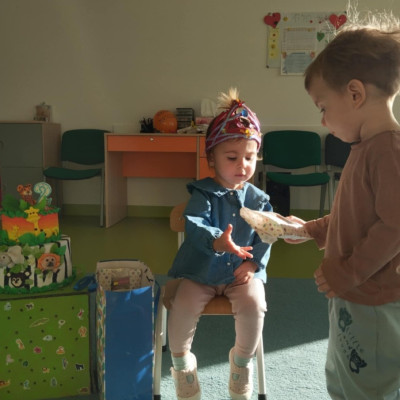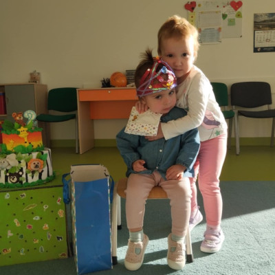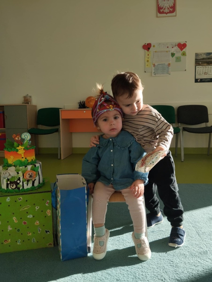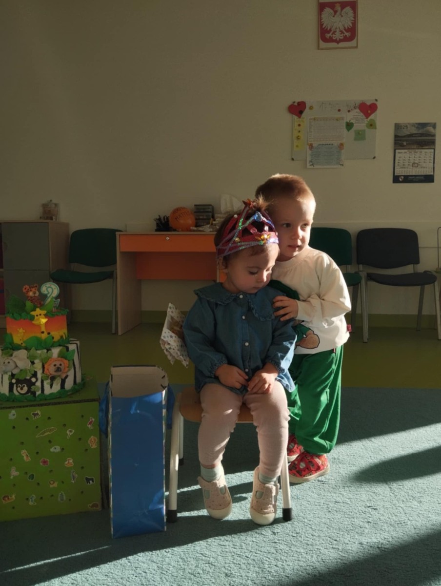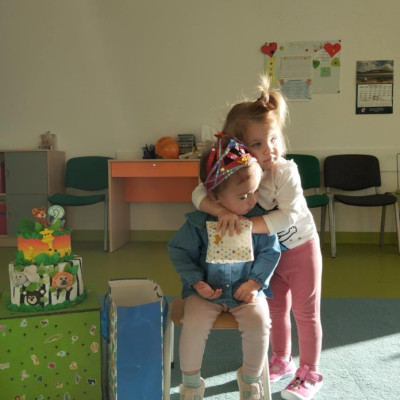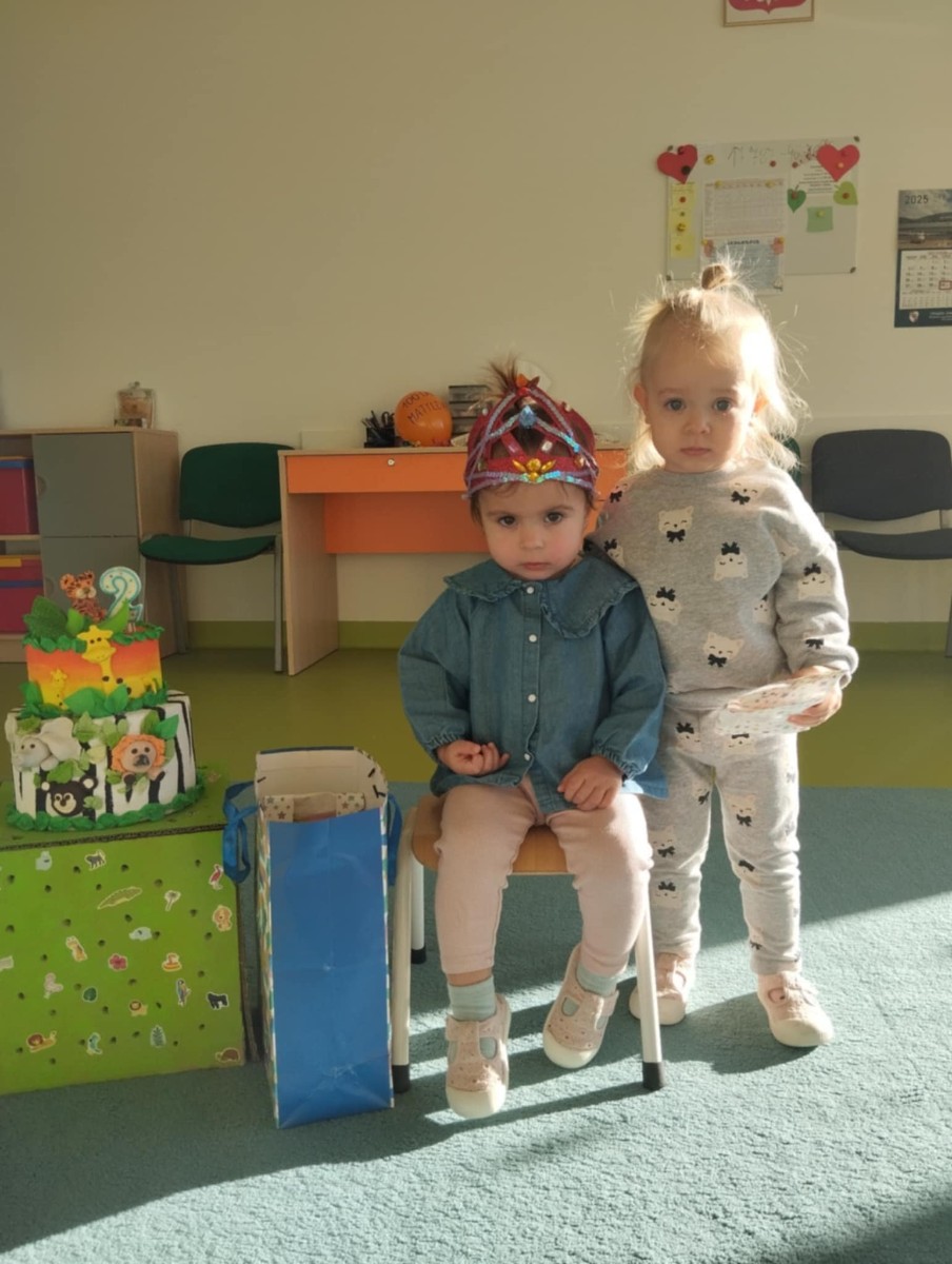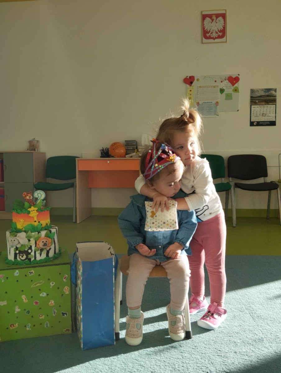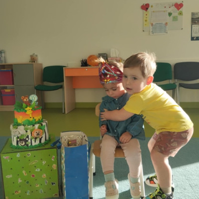 Zdjęcie przedstawia dzieci świętujące urodziny koleżanki z grupy