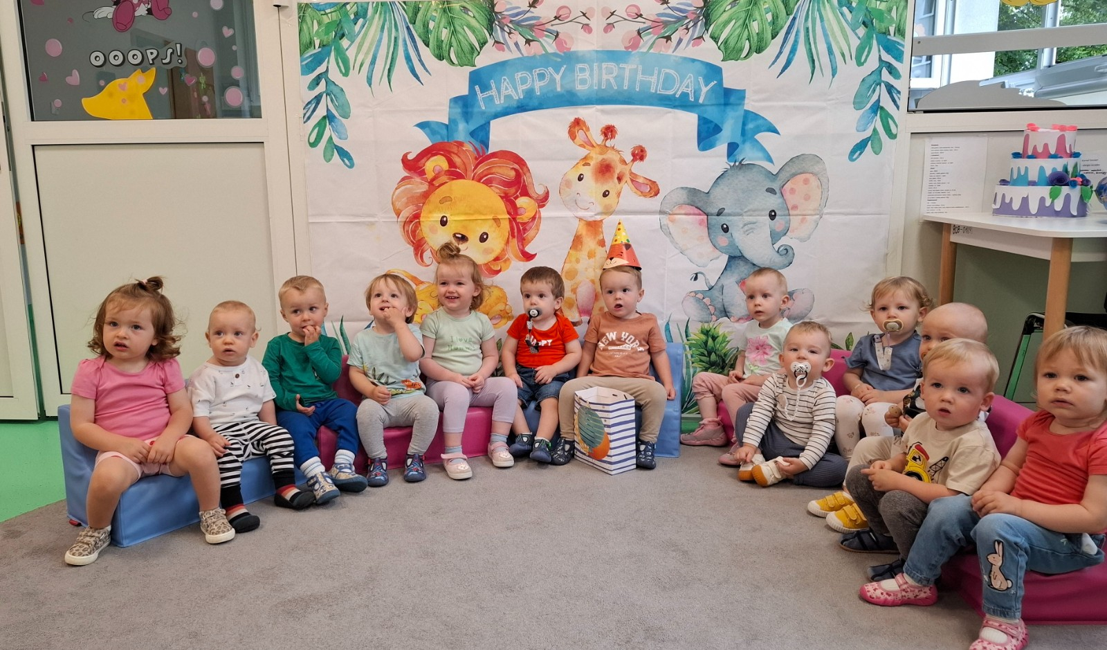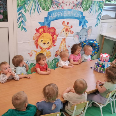 Zdjęcie przedstawia dzieci świętujące urodziny kolegi