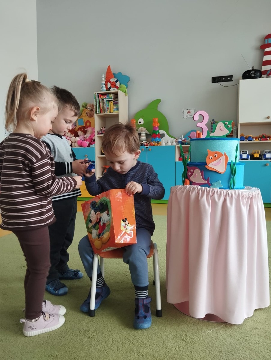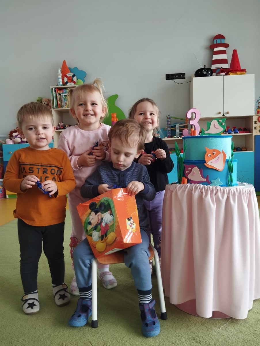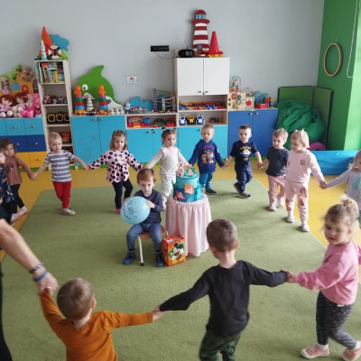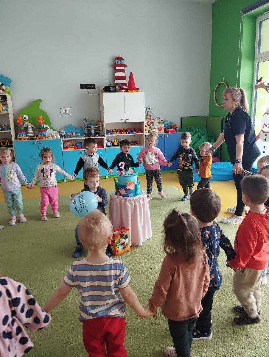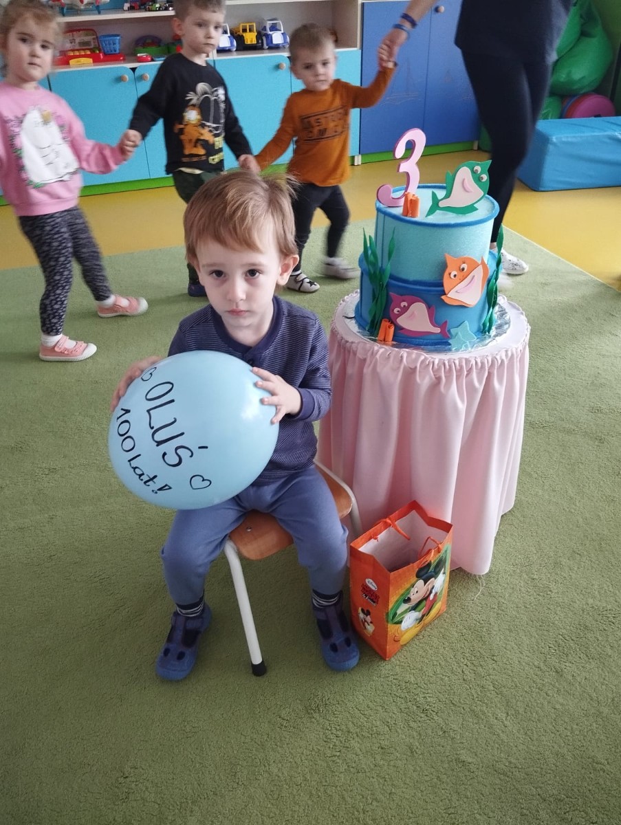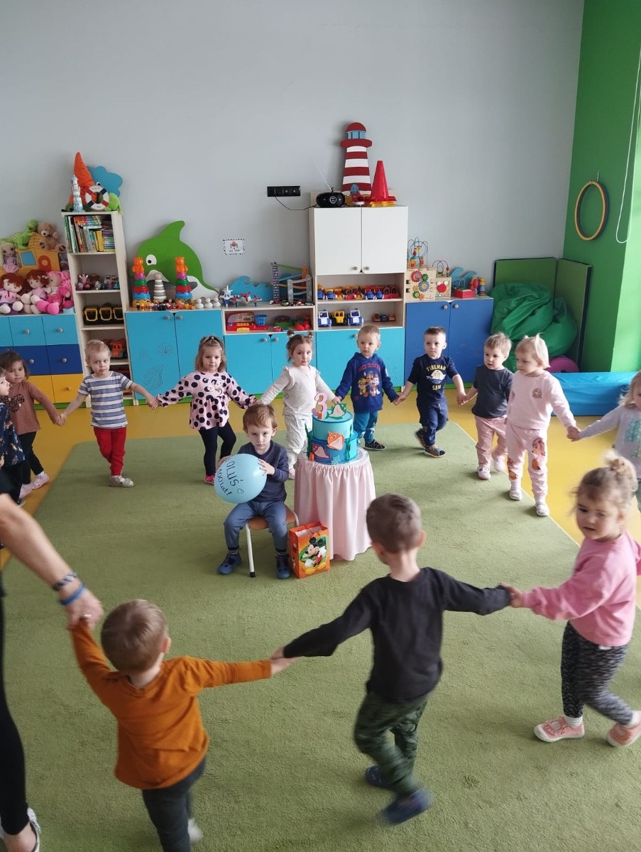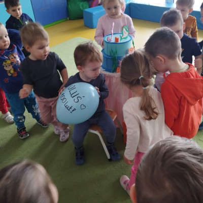Zdjęcie przedstawia dzieci podczas zabawy urodzinowej kolegi